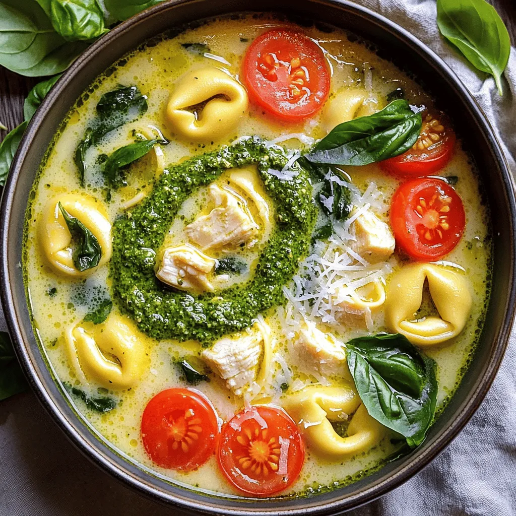 To make creamy pesto chicken tortellini soup, gather these simple ingredients: - 2 tablespoons olive oil - 1 pound boneless, skinless chicken breast, diced - 1 onion, diced - 3 cloves garlic, minced - 4 cups chicken broth - 2 cups heavy cream - 1 cup basil pesto (store-bought or homemade) - 1 package (9 oz) cheese tortellini - 1 cup cherry tomatoes, halved - 2 cups fresh spinach - Salt and pepper to taste - Grated Parmesan cheese for serving - Fresh basil leaves for garnish Choose ingredients with care for the best taste. Here are some tips: - Chicken: Look for bright pink chicken. Avoid any that looks dull or gray. - Onion: Pick firm onions with smooth skin. They should feel heavy for their size. - Garlic: Choose garlic bulbs that are firm and dry. Avoid any with green sprouts. - Spinach: Select fresh spinach with vibrant green leaves. Avoid wilted or yellowing leaves. - Tomatoes: Choose firm, bright cherry tomatoes. They should smell sweet and fruity. - Pesto: If using store-bought pesto, check the label for fresh ingredients. If you can't find an ingredient, here are some easy swaps: - Chicken: Use diced turkey or cooked sausage instead of chicken. - Cream: Substitute coconut cream for a dairy-free option. - Pesto: You can use sun-dried tomato paste for a different flavor. - Tortellini: Try using gnocchi or any small pasta if tortellini is not available. - Spinach: Kale or Swiss chard makes a great substitute for spinach. These tips help you make the best creamy pesto chicken tortellini soup. Happy cooking! Start by gathering all your ingredients. You need olive oil, diced chicken, onion, garlic, chicken broth, heavy cream, basil pesto, cheese tortellini, cherry tomatoes, fresh spinach, salt, pepper, Parmesan cheese, and basil leaves. Next, prepare your workspace. Dice the chicken and onion. Mince the garlic. Halving the cherry tomatoes is next. Set everything aside in bowls for easy access. Heat the olive oil in a large pot over medium heat. Add the diced chicken. Cook it for about 5-7 minutes until it turns light brown. Now, add the diced onion and minced garlic to the pot. Sauté for 3-4 minutes until the onion looks clear and smells great. Pour in the chicken broth. Bring it to a gentle boil, then lower the heat to a simmer. Stir in the heavy cream and basil pesto. Mix well until everything blends nicely. Add the tortellini to the pot. Cook them according to the package instructions. They usually take about 3-5 minutes to float to the top. When the tortellini are cooked, add the halved cherry tomatoes and fresh spinach. Stir and cook for another 2-3 minutes until the spinach wilts. Taste the soup and season with salt and pepper. Adjust it to your liking. Serve the hot soup in deep bowls. For a special touch, drizzle a little extra pesto on top. Garnish with grated Parmesan cheese and fresh basil leaves. This adds color and flavor. Enjoy your delicious creamy pesto chicken tortellini soup! To get the best creamy texture, use heavy cream. It adds richness and smoothness. When you add the cream, stir gently to blend it well with the broth. If you want it even creamier, try blending some soup and adding it back in. This makes the soup thick and velvety. Seasoning makes your soup shine. Start with salt and pepper. Taste as you go. If you want more flavor, add Italian herbs or a pinch of red pepper flakes. Fresh basil is also a great choice to boost the flavor. For a twist, a squeeze of lemon juice adds brightness. One mistake is overcooking the tortellini. Follow the package instructions closely. If overcooked, they turn mushy. Another tip is to add spinach at the end. This keeps it bright and fresh. Finally, don’t skip the garnish. Grated Parmesan and fresh basil make a big difference in taste and look. {{image_2}} You can easily make a vegetarian version of this soup. Start by swapping the chicken for extra veggies. Use mushrooms, zucchini, or bell peppers for great texture. Replace the chicken broth with vegetable broth to keep the flavor rich. This way, you still get a creamy, tasty soup without meat. If you want to change the protein, you have options. You can use diced turkey or shrimp. Each choice adds a unique flavor. Just remember to cook the protein until it's fully done. Adjust cooking times as needed. This keeps the soup fun and fresh each time you make it. Herbs can transform this soup into something special. Fresh herbs like thyme or rosemary add depth. Simply toss them in when you add the broth. You can also use dried herbs if fresh ones aren’t available. Just be careful with amounts, as dried herbs are stronger. A little goes a long way! To keep your creamy pesto chicken tortellini soup fresh, store it in an airtight container. Make sure the soup cools down to room temperature first. Place it in the fridge if you plan to eat it within three days. If you want it to last longer, consider freezing it. When reheating, do it slowly on the stove over low heat. Stir often to prevent sticking. If the soup thickens too much, add a splash of chicken broth or cream. You can also microwave it in short bursts. Stir between each burst to heat evenly. To freeze, pour the cooled soup into freezer-safe bags or containers. Leave some space at the top, as soup expands when frozen. Label the bags with the date. It can last up to three months in the freezer. Thaw it overnight in the fridge before reheating. Yes, you can use frozen tortellini. Just add it straight to the soup. Cook it for about 5-7 minutes. Check the package for specific times. Frozen tortellini works well in this creamy pesto chicken tortellini soup. It saves time and is easy to find. To make this soup dairy-free, swap heavy cream for coconut milk or almond milk. Use a dairy-free pesto too. You can find many brands in stores. Make sure to check the labels. This change keeps the soup creamy while being friendly for dairy-free diets. Serve the soup hot in deep bowls. Add a sprinkle of grated Parmesan on top for flavor. Ga