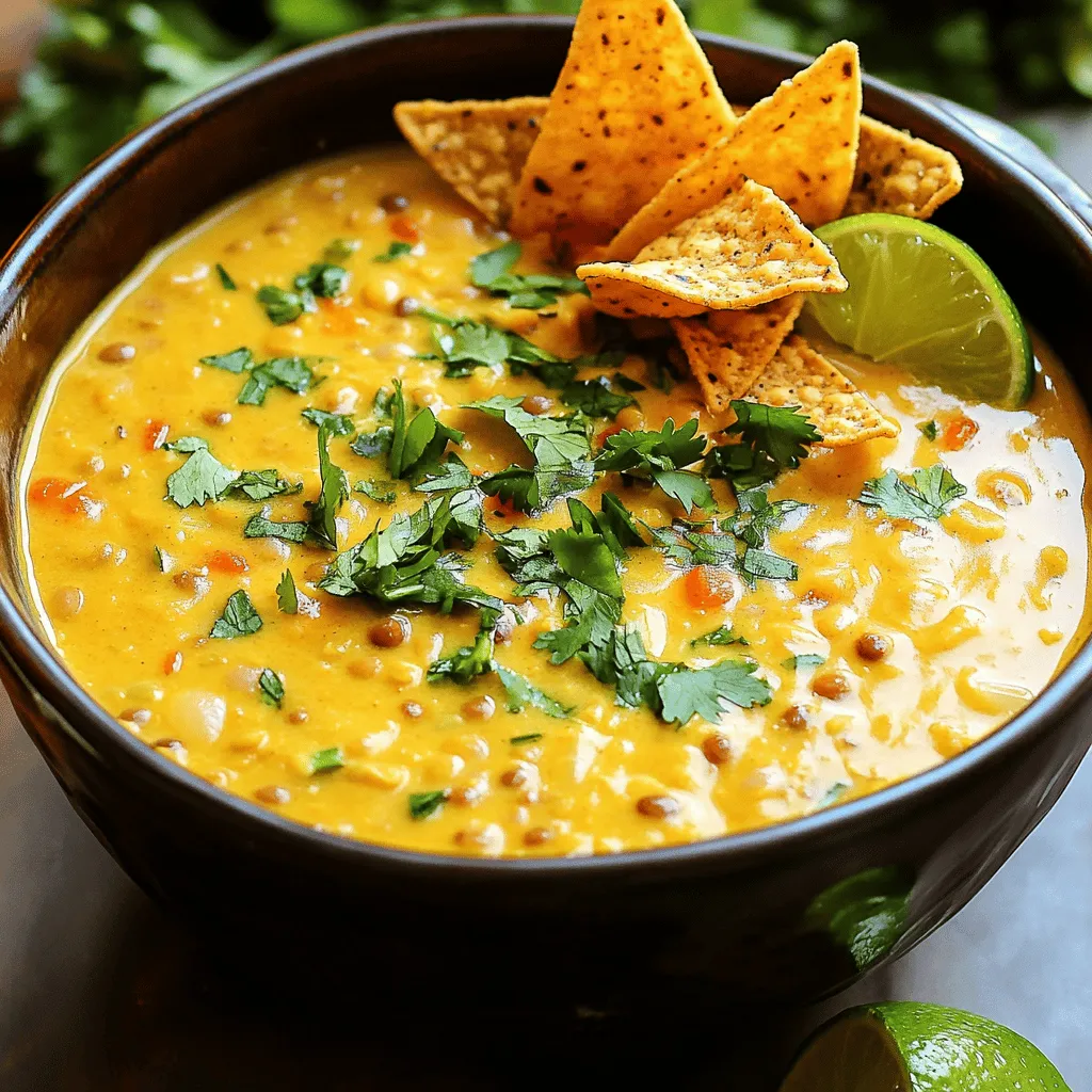 - 1 cup brown or green lentils, rinsed and drained - 1 tablespoon olive oil - 1 large onion, diced - 2 cloves garlic, minced - 1 bell pepper, diced (any color) - 2 medium carrots, diced - 1 zucchini, diced - 1 can (14 oz) diced tomatoes with green chilies - 1 teaspoon ground cumin - 1 teaspoon smoked paprika - 1/2 teaspoon chili powder - 4 cups vegetable broth - 1 can (13.5 oz) coconut milk - Salt and pepper to taste - Juice of 1 lime - Fresh cilantro, chopped (for garnish) - Tortilla chips (for serving) This recipe is simple and fun. You can find the full recipe for creamy vegan lentil tortilla soup above. Let’s break this down. First, lentils are a great base. They are packed with protein and fiber. Next, the veggies add crunch and flavor. Onion and garlic bring warmth. The bell pepper and carrots add color. Zucchini gives a nice touch. The spices make this soup special. Cumin and smoked paprika bring depth. Chili powder adds a little kick. Coconut milk creates creaminess and a hint of sweetness. The lime juice adds brightness. Finally, fresh cilantro gives a pop of flavor. Tortilla chips make this soup even better. They add crunch and fun. Feel free to mix in your favorite toppings. Enjoy the delicious flavors and textures in this soup! 1. In a large pot, heat 1 tablespoon of olive oil over medium heat. 2. Add 1 large diced onion and sauté for about 5 minutes until it is soft and clear. 3. Next, stir in 2 minced cloves of garlic, 1 diced bell pepper, and 2 diced carrots. Cook for 4-5 minutes until these veggies soften. 4. Add 1 diced zucchini, 1 cup of rinsed lentils, and 1 can of diced tomatoes with green chilies. Sprinkle in 1 teaspoon of ground cumin, 1 teaspoon of smoked paprika, and 1/2 teaspoon of chili powder. Mix well. 5. Pour in 4 cups of vegetable broth and combine everything in the pot. 1. Bring the mixture to a gentle boil. Then, lower the heat and let it simmer. 2. Cook for about 25-30 minutes or until the lentils become soft. 3. Once the lentils are tender, stir in 1 can of coconut milk. Let it simmer for another 5 minutes. 4. Season the soup with salt, pepper, and juice from 1 lime to taste. 1. Serve the soup hot in deep bowls. The bright color will look great! 2. Garnish with fresh chopped cilantro on top. 3. Add a handful of crispy tortilla chips for crunch. 4. For extra fun, you can serve lime wedges on the side to squeeze over the soup. You can find the Full Recipe for a complete guide on making this delicious dish! - Rinsing and soaking lentils: Rinse your lentils under cool water. This step removes dirt and helps with digestion. Soaking is not needed for brown or green lentils, but it can cut cooking time for other types. - Choosing the right vegetables: Use fresh veggies for the best taste. Bell peppers add sweetness. Carrots bring color and crunch. Zucchini adds a nice texture. Feel free to mix in any vegetables you love. - Adjusting cooking time based on lentil type: Brown and green lentils cook well in about 25-30 minutes. Red lentils cook faster, usually in 15-20 minutes. Check them often to avoid mushiness. - Best practices for flavor enhancement: Add spices early to let them bloom in the oil. It makes the soup rich and flavorful. A squeeze of lime at the end brightens the taste. Don’t forget salt; it brings out all the flavors. - Ideal serving dishes: Serve the soup in deep bowls. This allows the bright color to shine through. A wide, shallow bowl can work too, giving a casual feel. - Adding garnishes for visual appeal: Top with fresh cilantro for a pop of green. Add a few crispy tortilla chips for texture. A lime wedge on the side looks nice and adds freshness. For the full recipe, check out the details above! {{image_2}} You can swap lentils for other beans. Black beans or chickpeas work great. They give a nice texture and taste. If you want a different creaminess, try almond or cashew milk instead of coconut milk. These options add a unique flavor. Spices can change the soup's taste. Try adding oregano, coriander, or turmeric for new flavors. You can also mix in a dash of hot sauce for heat! For toppings, consider avocado slices, lime wedges, or fresh green onions. These add color and extra flavor to your dish. For a gluten-free version, choose gluten-free tortilla chips. This keeps the soup safe for everyone. If you need low-sodium options, use low-sodium vegetable broth. You can also limit added salt for a healthier meal. Explore all these changes to make the soup your own! For the full recipe, check out the Creamy Vegan Lentil Tortilla Soup. To store your creamy vegan lentil tortilla soup, use airtight containers. Glass containers work best, as they do not retain odors. You can also use plastic containers, but make sure they are BPA-free. Let the soup cool down before sealing the lid. This helps keep it fresh and prevents condensation. For refrigeration, keep the soup in the fridge for up to five days. Make sure you place it on a middle shelf, where the temperature is stable. Avoid storing it in the door, as that area tends to be warmer. If you want to store the soup for longer, freezing is a great option. Pour the soup into freezer-safe containers, leaving some space at the top because it will expand. You can also use freezer bags. Just lay them flat in the freezer to save space. For thawing, move the soup to the fridge overnight. If you're in a hurry, you can put the container in cold water for a few hours. When ready to eat, reheat it on the stove over medium heat. Stir often to ensure even heating. In the fridge, the creamy vegan lentil tortilla soup lasts about five days. If you freeze it, it can last for up to three months. Check for spoilage by looking for strange colors or odors. If the soup smells sour or has an off taste, it's best to discard it. Always trust your senses! Can I use dried lentils instead of canned? Yes, you can use dried lentils. Just rinse them well. You will need to increase the cooking time. Soak them for a few hours 