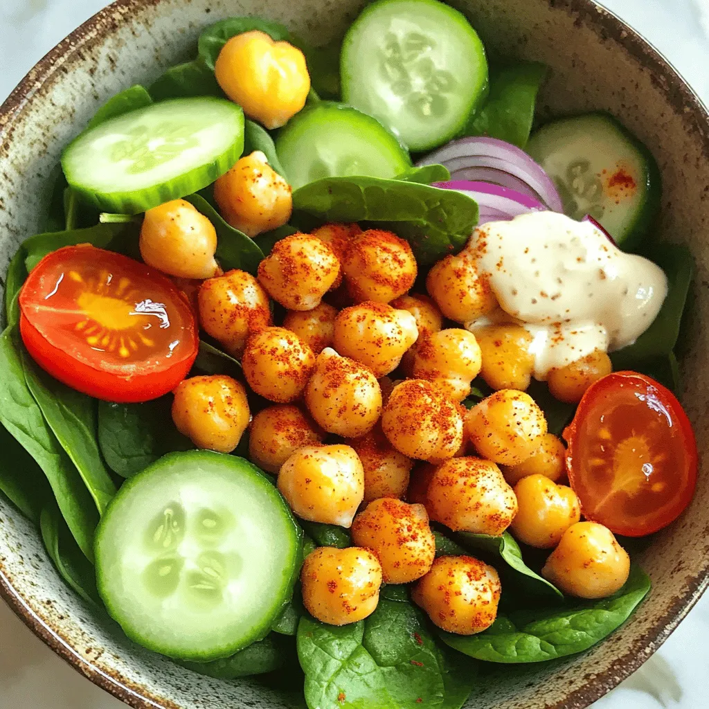 ![To make this Crispy Chickpeas and Spinach Salad, gather these fresh ingredients: - 1 can (15 oz) chickpeas, rinsed and drained - 1 tablespoon olive oil - 1 teaspoon smoked paprika - 1 teaspoon garlic powder - Salt and pepper to taste - 4 cups fresh spinach, washed and dried - 1 cup cherry tomatoes, halved - ½ cucumber, diced - ¼ red onion, thinly sliced - 2 tablespoons lemon juice - 1 tablespoon tahini - 1 tablespoon honey (or maple syrup for a vegan option) - 1 tablespoon water You can switch some ingredients if needed: - Use dried chickpeas instead of canned. Just cook them first. - Swap olive oil for avocado oil for a different flavor. - Try smoked salt if you want a smoky taste without paprika. - For a different green, replace spinach with kale or arugula. - Use any nut butter instead of tahini for the dressing. To make this salad, you will need: - A baking sheet for the chickpeas - A large mixing bowl for the salad - A small bowl for mixing the dressing - A whisk or fork to mix the dressing - Measuring spoons for accurate portions - A paper towel to dry the chickpeas You can find the full recipe to guide you through each step. Start by gathering all your ingredients. You need chickpeas, spinach, olive oil, and spices. Rinse and drain the chickpeas well. Use a paper towel to pat them dry. This step helps them get crispy. Next, wash and dry your spinach. Cut the cherry tomatoes in half. Dice the cucumber and slice the red onion. Set everything aside for later. Preheat your oven to 400°F (200°C). This temperature helps the chickpeas get extra crispy. In a bowl, toss the dried chickpeas with olive oil, smoked paprika, garlic powder, salt, and pepper. Make sure they are coated evenly. Spread the chickpeas on a baking sheet. Bake them for 25 to 30 minutes. Stir them halfway through to cook evenly. They should be golden brown and crunchy when done. While the chickpeas bake, prepare the dressing. In a small bowl, mix lemon juice, tahini, honey, and water. Whisk until smooth. If it’s too thick, add more water. In a large bowl, combine the spinach, cherry tomatoes, cucumber, and red onion. Drizzle the dressing over the salad. Toss gently to coat everything well. Once the chickpeas are ready, let them cool for a few minutes. Add them to the salad and toss again. Serve this delicious dish warm for the best flavor. For the full recipe, check out Crispy Chickpeas & Spinach Delight. To get crispy chickpeas, start by drying them. Use a paper towel to remove all moisture. This step is key. The drier the chickpeas, the crispier they will get. Toss them with olive oil and spices. I love using smoked paprika and garlic powder. Spread them on a baking sheet in a single layer. Bake at 400°F for 25-30 minutes. Stir halfway to ensure they cook evenly. Keep an eye on them. You want them golden brown and crunchy. For a great dressing, mix lemon juice, tahini, honey, and water. Whisk until smooth. If it’s too thick, add a bit more water. Don't forget to season with salt. This dressing adds bright flavor to the salad. You can also add herbs like parsley or dill for extra taste. If you want a kick, try adding a pinch of cayenne pepper. Serve this salad right away for the best texture. The warm chickpeas add a nice crunch. You can add more toppings, like feta cheese or avocado. This salad also pairs well with grilled chicken or shrimp. If you want a heartier meal, serve it with quinoa or brown rice. For a fun touch, use different colored cherry tomatoes. They make the salad look beautiful. Find the full recipe to explore more tasty ideas! {{image_2}} You can easily boost the protein in this salad. Try adding grilled chicken or shrimp for extra flavor. For a vegetarian option, add hard-boiled eggs or feta cheese. These additions make the salad heartier and more filling. Just remember to adjust the dressing if needed. This salad is naturally vegetarian and can be made vegan. Use maple syrup instead of honey for the dressing. You can skip the cheese or choose a plant-based cheese to keep it vegan. These small swaps let everyone enjoy this dish. Feel free to change ingredients based on the seasons. In summer, add fresh corn or bell peppers for a sweet crunch. In fall, diced apples or roasted squash can add warmth. These swaps keep the salad fresh and exciting all year long. For the full recipe, check out the [Full Recipe] section. You can store any leftover salad in the fridge. Place it in a bowl and cover it tightly. The crispy chickpeas will lose some crunch over time, so try to enjoy the salad within two days. Keep the dressing separate if you want the salad fresh for longer. Use glass or plastic containers with tight-fitting lids for best results. These containers keep the salad fresh and are easy to stack in the fridge. If you have a lot of salad, divide it into smaller portions. This way, you can grab a quick meal when you're hungry. To bring back the crunch, reheat the chickpeas in the oven. Preheat to 375°F (190°C). Spread the chickpeas on a baking sheet and heat for about 5-10 minutes. Keep an eye on them to avoid burning. You want them warm and crispy again. Enjoy them with your salad for the best taste! Yes, you can make this salad ahead of time. You can prep the veggies and dressing a day before. Store them in separate containers. Mix them just before serving to keep the spinach fresh. For extra crunch, consider adding nuts or seeds. Almonds, walnuts, or sunflower seeds work great. You can also use crispy tortilla strips or croutons for added texture. To keep your chickpeas crispy, dry them well before cooking. Remove all moisture. Roast them at a high heat for the best crunch. Store any leftovers in an open container to keep them from getting soggy. Yes, you can use canned spinach, but fresh is best for taste. If using canned, drain and rinse it well. Squeeze out excess moisture to avoid sogginess in the salad. For the best flavor, use the full recipe for fresh ingredients. You now have all