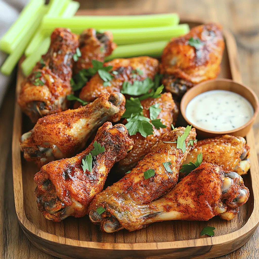 ![- 2 pounds chicken wings - Necessary kitchen tools: baking sheet, wire rack, large bowl - 2 tablespoons baking powder - 1 tablespoon smoked paprika - 1 tablespoon garlic powder - 1 tablespoon onion powder - 1 teaspoon salt - 1 teaspoon black pepper - 1 teaspoon cayenne pepper - 1 teaspoon dried thyme - 1 teaspoon brown sugar - 1 teaspoon lemon zest When it comes to making crispy dry rub chicken wings, the right ingredients are key. First, you need fresh chicken wings. I prefer using two pounds for a good serving. Make sure you have a baking sheet and a wire rack. These tools help the wings cook evenly and get extra crispy. Next, let’s talk about the dry rub. This mix gives your wings that amazing flavor. You will need baking powder, smoked paprika, garlic powder, onion powder, salt, and black pepper. For some heat, add cayenne pepper. Dried thyme adds a nice touch of earthiness. Brown sugar brings a hint of sweetness, and lemon zest brightens everything up. Gather these ingredients, and you are ready to make the best crispy wings. You can find the full recipe to guide you through every step. - Preheat oven to 425°F (220°C). - Line a baking sheet with aluminum foil. Place a wire rack on top. This rack helps air circulate and makes the wings crispy. - Pat the chicken wings dry with paper towels. This helps with crispiness. You want no moisture left. - In a bowl, mix the dry rub ingredients. Use baking powder, smoked paprika, garlic powder, onion powder, salt, black pepper, cayenne, dried thyme, brown sugar, and lemon zest. - Coat the wings with the dry rub. Make sure every wing gets a good amount of rub. - Place the wings on the wire rack. Make sure they are in a single layer. This helps them cook evenly. - Bake for 40-45 minutes. Flip the wings halfway through cooking for even crispiness. - Broil for 2-3 minutes at the end. This step gives your wings that extra crunch. Watch closely to avoid burning. For the full recipe, check the details above. Enjoy the crispy wings! To get the best crispy chicken wings, drying them is key. First, pat the wings with paper towels until they are very dry. This step makes a huge difference in texture. Moisture creates steam, which prevents crisping. Baking powder is another secret weapon. It helps to create a light and crisp skin. When you mix it with the spices, it reacts with the moisture in the chicken. This reaction leads to a wonderful crispiness. You can easily customize your chicken wings. Add spices like cumin or coriander for a twist. A little chili powder can bring the heat if you like spice. Feel free to experiment until you find your perfect mix! For oils, consider using avocado or peanut oil. They can add a rich flavor and help achieve that crispy finish. If you prefer, you can marinate the wings in a mix of your favorite sauces. Just remember to dry them well after marinating. Serve your crispy wings with delicious dips. Ranch or blue cheese dressing are great choices. They add a creamy contrast that pairs well with the wings. You can also try a spicy sriracha sauce for a kick! For a lovely presentation, use a rustic wooden platter. Arrange the wings neatly and add celery sticks for crunch. A sprinkle of fresh parsley on top adds color and freshness. Your guests will be impressed with both taste and look! For the full recipe, check out the [Full Recipe]. {{image_2}} To mix things up, you can try different dry rubs for your wings. Here are two great options: - Spicy buffalo dry rub alternative: If you love heat, add cayenne pepper and crushed red pepper flakes. This mix will give your wings a fiery kick. Combine it with garlic powder and onion powder for a robust flavor. - Sweet and smoky dry rub option: For a sweeter taste, use brown sugar and smoked paprika. This blend offers a nice balance of sweetness and smokiness. You can add cinnamon for a unique twist. You can also change how you cook your wings. Here are two popular methods: - Air fryer method for quick cooking: Use an air fryer for crispy wings in less time. Cook them at 400°F (200°C) for about 25-30 minutes. Flip halfway for even cooking. The air fryer gives you that crunch without much oil. - Grill adaptation for summer barbecues: Grill your wings for a smoky flavor. Preheat your grill to medium heat. Cook wings for 20-25 minutes, turning often. This method adds a nice char and flavor to your wings perfect for outdoor gatherings. Pairing sides with your wings makes for a complete meal. Here are some great options: - Recommended sides to serve with chicken wings: Serve wings with crispy celery sticks, carrot sticks, or a fresh salad. These add crunch and freshness. - Perfect drink pairings for a complete meal: Enjoy your wings with a cold beer or a tangy lemonade. Both drinks balance the spicy and smoky flavors, making your meal more enjoyable. For the full recipe, check out the Crispy Dry Rub Chicken Wings section above! To keep your leftover crispy dry rub chicken wings tasty, store them right. Use airtight containers to lock in flavor. Allow the wings to cool first. This step helps prevent moisture buildup. Refrigerate them within two hours of cooking. They will stay fresh for up to three days. Reheating wings can be tricky. You want them crispy, not soggy. The best method is the oven. Preheat it to 350°F (175°C). Place the wings on a baking sheet. Bake for about 10-15 minutes until heated through. Check that they are hot in the middle. You can use the microwave, but they might lose crispiness. If you must, heat them for 30 seconds. Flip them halfway for even warmth. If you want to save wings for later, freezing is a great option. Start by letting them cool completely. Next, place them in a single layer on a baking sheet and freeze for about an hour. Once frozen, transfer them to a freezer-safe bag. Remove as much air as possible. They can stay in the freezer for up to three months. When ready to eat, thaw them overnight in the fridge. This keeps them juicy and tasty. T