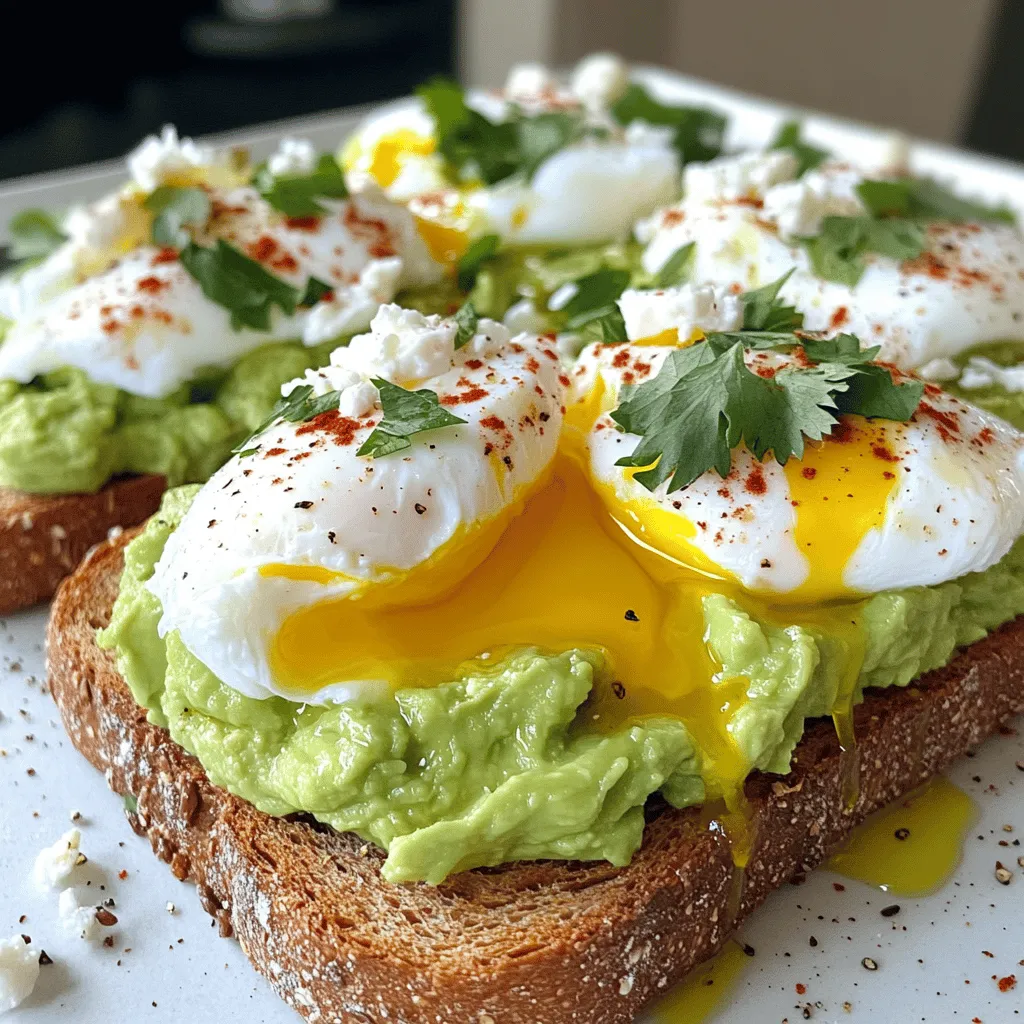 ![- Whole grain bread - Ripe avocado - Eggs To make this dish, you need three key items. First, use whole grain bread for a healthy base. This bread adds fiber and flavor. Next, grab a ripe avocado. A soft avocado gives the best creamy texture. Lastly, eggs are a must. They provide protein and a rich taste. - Olive oil - Feta cheese - Fresh herbs You can enhance your toast with extras. Drizzle olive oil on top for a smooth finish. Crumbled feta cheese adds a salty kick. Fresh herbs like cilantro or parsley bring brightness and color. - Salt and pepper - Red pepper flakes - Fresh lemon juice Seasoning makes your dish pop. Sprinkle salt and pepper for basic flavor. Add red pepper flakes for some heat. A squeeze of fresh lemon juice brightens the avocado and keeps it green. Don't forget to enjoy the full recipe for the best results! To start, toast the bread. Use whole grain bread for a hearty base. I like to toast it until it is golden brown and crispy. This texture holds up well against the creamy avocado. Next, choose a ripe avocado. Cut it in half and scoop out the flesh into a bowl. Mash it lightly with a fork. I like to leave some chunks for texture. Add fresh lemon juice to keep it bright. Season with salt and pepper to taste. This adds flavor and balance to the dish. Now, let’s poach the eggs. Fill a pot with 2-3 inches of water and bring it to a gentle simmer. If you want, add a splash of vinegar to help keep the egg whites together. Crack one egg into a small bowl. Gently slide it into the water. Do the same with the second egg. Cook for about 3-4 minutes for a runny yolk. If you like a firmer yolk, cook a bit longer. Use a slotted spoon to remove the eggs and let them drain on a paper towel. It’s time to assemble! Spread a generous layer of mashed avocado on each slice of toasted bread. Place a poached egg on top of the avocado. For the final touches, drizzle olive oil over everything. Sprinkle with salt, pepper, and a dash of red pepper flakes for some heat. If you like, add crumbled feta cheese and fresh herbs to make it look nice. For the full recipe, visit the detailed instructions provided. Enjoy your delicious creation right away! Choosing the best avocados Pick avocados that yield slightly when you press them. Look for dark green or black skin. These avocados are ripe and creamy. Avoid ones that feel too soft or have dark spots. Preventing browning To stop your avocado from browning, use fresh lemon juice. The acid slows down oxidation. You can also cover your avocado with plastic wrap. Press it down to eliminate air pockets. Tips for perfect poached eggs Use fresh eggs for the best results. They hold their shape better. Add a splash of vinegar to the water. This helps keep the egg whites together. Cook your eggs for three to four minutes for a runny yolk. Alternative cooking methods You can also poach eggs in the microwave. Fill a bowl with water and crack an egg into it. Cover the bowl with a plate and microwave for about a minute. This method is quick and effective! Additional toppings to try Mix in some crumbled feta for a salty kick. Fresh herbs like cilantro or parsley add a nice touch. Try sliced radishes or cherry tomatoes for extra crunch and color. Suggested serving ideas Serve your toast with a side of fresh fruit. This adds sweetness and balance. You can also pair it with a hot cup of coffee or tea for a perfect breakfast. For the full recipe, check out the detailed instructions above! {{image_2}} You can get really creative with your avocado toast. One fun idea is to add jalapeños for a spicy kick. The heat from the jalapeños pairs well with the creamy avocado. Just slice them thin and sprinkle them on top. If you love Mediterranean flavors, try adding chopped tomatoes and olives. The fresh taste of tomatoes and the saltiness of olives make a great mix. If you're vegan, you can still enjoy this dish. Skip the poached eggs and use chickpeas instead. Mash them with the avocado for a protein boost. For those who need gluten-free options, choose gluten-free bread. There are many tasty gluten-free breads made from almond or coconut flour. Think about using seasonal ingredients for your toast. In spring, add fresh radishes for a crunchy bite. In summer, you can top it with sliced peaches or heirloom tomatoes. For fall, try using roasted pumpkin seeds. During the holidays, you could make a festive version with pomegranate seeds and herbs. For more details on making the perfect avocado toast, check the [Full Recipe]. To store avocados, keep them whole if possible. If you cut one, use lemon juice on the flesh to slow browning. Place it in an airtight container. Wrap the pit in the container to help keep it fresh longer. For toasted bread, store it in a paper bag. This helps keep it crisp. Avoid plastic bags, as they can make the bread soggy. If you have leftover toast, let it cool completely before storing. To reheat toast, use a toaster or an oven. This keeps the bread crunchy. Avoid microwaving, as it makes the toast chewy. For poached eggs, gently warm them in hot water for a minute. This helps keep the yolk runny. Avoid boiling the water to keep the eggs from cooking too much. For the full recipe, check the details above and get ready to enjoy your meal! How do you poach an egg perfectly? To poach an egg perfectly, start by heating water in a pot. Bring it to a gentle simmer. Add a splash of vinegar, as this helps the egg whites stay together. Crack the egg into a small bowl first. Then, gently slide the egg into the water. Cook it for about 3 to 4 minutes if you want a runny yolk. If you like it firmer, let it cook longer. Use a slotted spoon to remove the egg when it’s done. Can you make avocado toast ahead of time? You can prep some parts ahead but not the whole toast. Toast the bread in advance and store it in a bag. You can also mash the avocado and keep it in the fridge. Just add a bit of lemon juice to slow browning. However, it's best to assemble th
