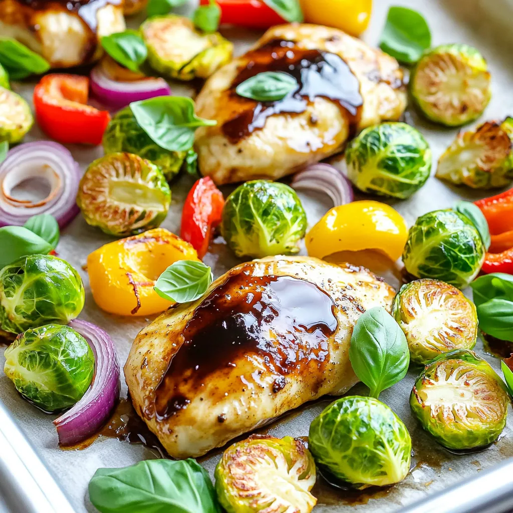 You need chicken breasts for the main protein in this dish. They cook quickly and stay juicy. For veggies, I use Brussels sprouts, red bell pepper, yellow bell pepper, and red onion. They add color and flavor. The balsamic mixture gives the dish a tangy-sweet taste that everyone loves.