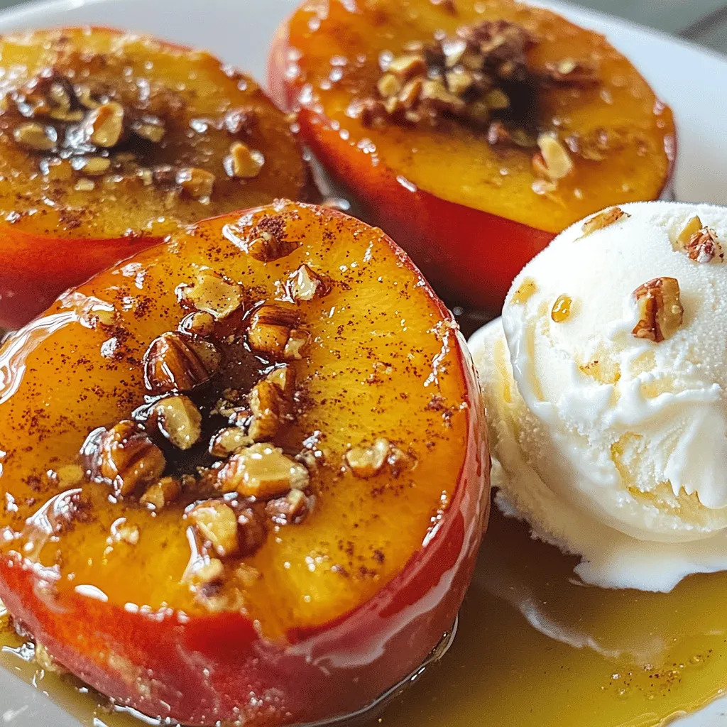 You can top the peaches with vanilla ice cream or Greek yogurt. This adds creaminess and a cool touch. The warm peaches will pair well with the cold toppings. You can also sprinkle nuts for crunch, if you like.