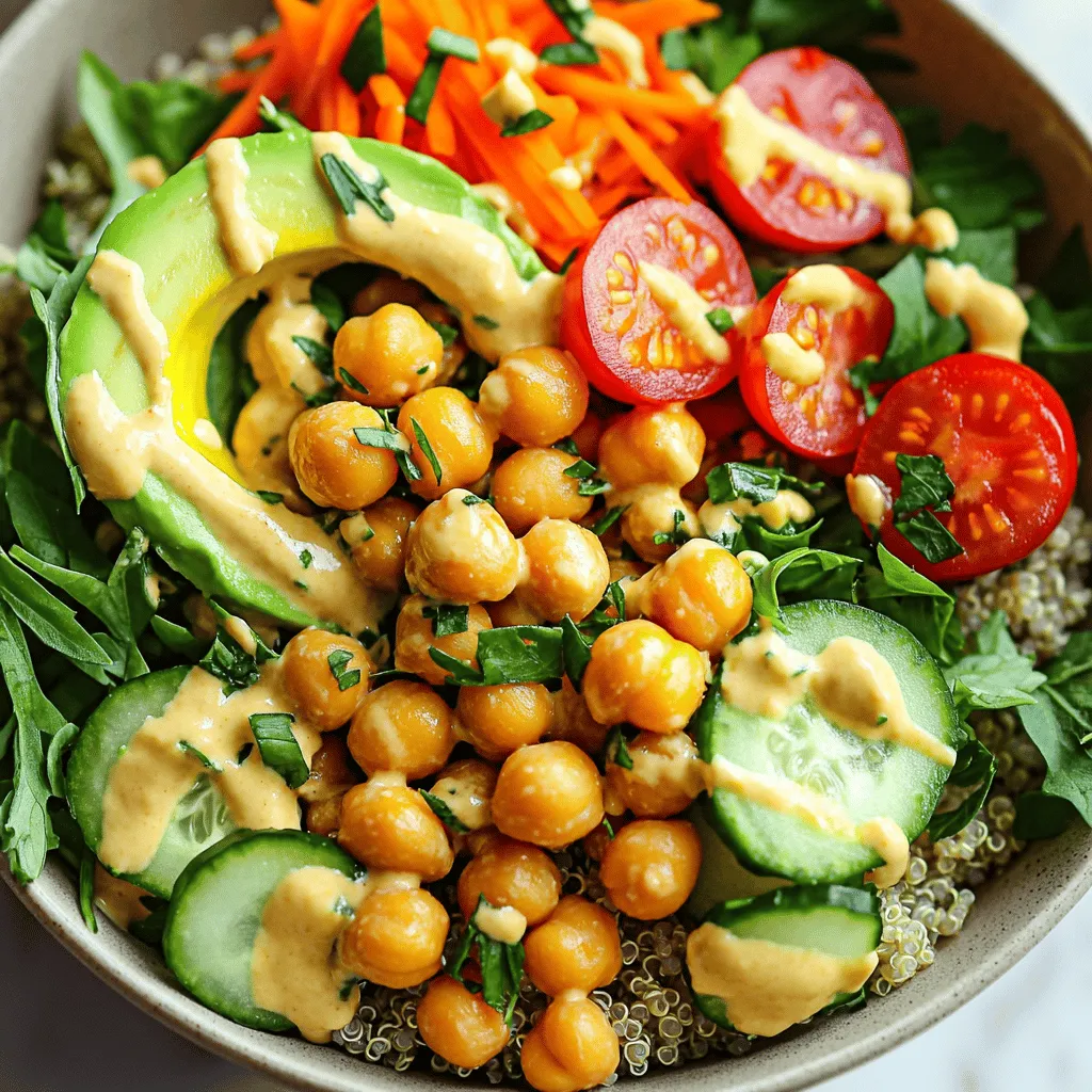 ![To make your Easy Chickpea Buddha Bowl, you need the following fresh ingredients: - 1 can (15 oz) chickpeas, drained and rinsed - 1 cup quinoa, rinsed - 2 cups vegetable broth or water - 1 avocado, sliced - 1 cup cherry tomatoes, halved - 1 cucumber, diced - 1 cup spinach or mixed greens - 1 carrot, grated - 2 tablespoons tahini - 2 tablespoons lemon juice - 1 tablespoon olive oil - 1 teaspoon garlic powder - Salt and pepper to taste - Fresh parsley or cilantro for garnish These ingredients come together to create a tasty and colorful bowl. Chickpeas add protein, while quinoa serves as a lovely base. Fresh veggies like tomatoes, cucumber, and spinach boost nutrition and flavor. The tahini dressing ties everything together with a creamy, nutty taste. Feel free to mix and match your toppings. You can make it your own! For the complete recipe, check out the full recipe. - Combine 1 cup of rinsed quinoa and 2 cups of vegetable broth (or water) in a saucepan. - Bring the mix to a boil, then reduce heat to a simmer. Cover the saucepan and let it cook for about 15 minutes until all the liquid is absorbed. Fluff the quinoa with a fork and set it aside. - Heat a skillet over medium heat. - Add 1 can of drained and rinsed chickpeas to the skillet. Sprinkle garlic powder, salt, and pepper over them. - Sauté the chickpeas for about 5 to 7 minutes, stirring occasionally until they are golden and slightly crispy. - In a small bowl, whisk together 2 tablespoons of tahini, 2 tablespoons of lemon juice, and 1 tablespoon of olive oil. - If the dressing is too thick, add a little water until you achieve your desired consistency. - Start with a base of cooked quinoa in a large bowl. - Layer a generous portion of spinach or mixed greens on top. - Add the sautéed chickpeas, sliced avocado, halved cherry tomatoes, diced cucumber, and grated carrot on top of the greens. - Pour the tahini dressing over the assembled Buddha bowl, letting it flow over all the ingredients. - Finish your bowl by adding fresh parsley or cilantro for a burst of flavor and color. - Ensure quinoa is thoroughly rinsed for best flavor. - Monitor chickpeas to avoid overcooking. Cooking quinoa correctly is key. Rinsing it removes bitter saponins. This step enhances the taste. When cooking, bring the liquid to a boil first. Then, lower the heat and cover it. Fluff it gently with a fork when done. For the chickpeas, heat a skillet over medium heat. Add the chickpeas after draining. Sprinkle them with garlic powder, salt, and pepper. Stir often to prevent burning. You want them golden and slightly crispy, not mushy. - Use large, shallow bowls for serving. - Arrange toppings in sections for visual appeal. Serving in shallow bowls makes your dish pop. It highlights the vibrant colors of your ingredients. When placing toppings, keep them in neat sections. This method creates a beautiful visual appeal. Your meal becomes more inviting and appetizing. - Experiment with different dressings or seasonings. - Incorporate extra vegetables as desired. Feel free to get creative! Different dressings can change the dish’s taste. Try adding a spicy sauce or a tangy vinaigrette. You can also mix in other vegetables. Think bell peppers, radishes, or zucchini for added crunch and flavor. Enjoy customizing your Easy Chickpea Buddha Bowl! For the complete recipe, check out the [Full Recipe]. {{image_2}} You can easily change the base of your bowl. Swap quinoa for brown rice or couscous. Both options offer great flavors and textures. You can also use assorted greens like kale or arugula. These greens add crunch and nutrition to your meal. Want to boost the protein? Add grilled chicken or tofu. Both options complement chickpeas well. You can also incorporate roasted vegetables for extra flavor and nutrients. Roasted sweet potatoes or bell peppers work wonderfully. If you're looking for a change in flavor, try different dressings. Substitute tahini with yogurt or hummus for a creamy touch. You can also use balsamic vinegar or a soy-based dressing. Each dressing will give your bowl a new twist. Feel free to mix and match these ideas. Your Easy Chickpea Buddha Bowl can be anything you want it to be! For the complete recipe, check the full recipe link. Store leftovers in airtight containers. This keeps them fresh and tasty. Consume within 3-4 days for best quality. You want to enjoy every bite! You can freeze the Chickpea Buddha Bowl without the dressing. This works well for meal prep. Thaw it in the fridge before you eat. Then, assemble fresh ingredients before serving. Reheat the quinoa and chickpeas gently on the stove. This keeps them from getting tough. Avoid reheating dressed salad to maintain quality. You want that fresh taste every time! Add grains, seeds, or nuts for extra protein and energy. Quinoa is a great choice. You can also try brown rice or farro for variety. Nuts like almonds or walnuts add crunch. Seeds such as chia or hemp boost nutrition too. Yes, canned are convenient and save preparation time. Just rinse them well before use. They are already cooked, so it cuts down on time. This makes your meal prep much easier. Consider avocado, roasted vegetables, or seeds like pumpkin or sunflower. These toppings add flavor and texture. You can also use pickled onions or feta cheese for a twist. Fresh herbs like cilantro or parsley enhance taste too. Yes, it is entirely plant-based and vegan-friendly. You can enjoy it without worry. This bowl is packed with nutrients, making it a healthy choice for everyone. Store in the refrigerator for up to a week in an airtight container. This keeps it fresh and tasty. You can use it on salads or other bowls too. Check our blog for the full Chickpea Bliss Buddha Bowl recipe! It has all the details you need to make this delicious meal. This blog post covered all you need to make a delicious Chickpea Buddha Bowl. You learned about the key ingredients, step-by-step instructions, and tips for perfecting your dish. Plus, 