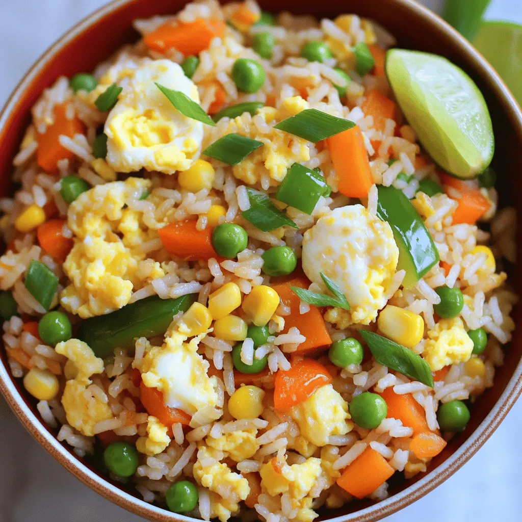 ![To make easy fried rice, you need the following ingredients: - 2 cups cooked jasmine rice (preferably day-old) - 2 tablespoons vegetable oil - 2 large eggs, beaten - 1 cup mixed vegetables (carrots, peas, corn, bell peppers) - 3 green onions, sliced - 3 cloves garlic, minced - 4 tablespoons soy sauce (low sodium) - 1 teaspoon sesame oil - Salt and pepper to taste - Optional: 1 teaspoon sriracha sauce for a spicy kick Day-old rice is best because it is drier. Fresh rice can clump. For frying, I recommend vegetable oil. It has a high smoke point and a neutral flavor. You can also use canola oil. For a richer taste, try sesame oil. When you add sesame oil, it gives the dish a nice aroma. To make your fried rice exciting, consider adding: - Cooked chicken or shrimp for protein - Chopped bell peppers for sweetness - Peas for a pop of color - Pineapple for a sweet twist - Cashews for crunch These add-ins boost flavor and nutrition. Get creative! You can mix and match as you like. For the full recipe, check the details above. Use day-old rice for the best fried rice. It has less moisture. If you only have fresh rice, spread it on a baking sheet. Let it cool for 15 to 20 minutes. This helps dry it out. Dry rice will fry better and not clump together. Heat one tablespoon of vegetable oil in a large skillet or wok. Use medium-high heat. Pour in the beaten eggs and scramble them. Cook until they are fully set. This should take about two minutes. Once done, place the eggs on a plate and set them aside. In the same skillet, add the other tablespoon of oil. Heat it up, then add minced garlic. Sauté the garlic for about 30 seconds until it smells great. Next, toss in your mixed vegetables. Stir-fry for three to four minutes. If you use fresh veggies, cook them a bit longer until they are soft. Add the cooked rice into the skillet. Break apart any clumps as you mix it in. Stir-fry for about two minutes. Next, drizzle soy sauce and sesame oil over the rice. Mix in the scrambled eggs and sliced green onions. Stir everything well to coat the rice with sauce. Season with salt, pepper, and optional sriracha. Cook for one more minute. Serve your fried rice hot, garnished with more green onions. Enjoy it with lime wedges for an extra kick! For the complete recipe, check out the [Full Recipe]. Using day-old rice makes a big difference. Fresh rice holds too much moisture. This moisture can turn your fried rice into a sticky mess. When you use day-old rice, it dries out. This helps each grain stay separate and fluffy. If you have no day-old rice, spread fresh rice on a baking sheet. Let it cool for 15 to 20 minutes before cooking. This trick helps reduce moisture too. Flavor is key in fried rice. Soy sauce is a must for that umami taste. Low-sodium soy sauce keeps it tasty without too much salt. Adding sesame oil gives a nice nutty flavor. Just a teaspoon adds depth. Want some heat? A splash of sriracha works wonders! You can also try oyster sauce for more richness. Mix these sauces well for the best flavor. Don’t forget to taste as you go! A few common mistakes can ruin your fried rice. Avoid overcrowding the pan. If you add too many ingredients at once, the rice steams instead of fries. This makes it soggy. Another mistake is not using enough oil. Oil helps everything cook evenly and adds flavor. Lastly, remember to stir frequently. This ensures even cooking and prevents burning. Keep these tips in mind for the best fried rice! {{image_2}} You can easily make a tasty vegetarian fried rice. Start with the base recipe. Swap in veggies like broccoli, zucchini, or mushrooms. You can add tofu for protein too. Use soy sauce for flavor. You might also toss in some fresh herbs like basil or cilantro. These herbs will add a fresh taste. Feel free to experiment with what you have on hand. Adding protein makes fried rice heartier. Chicken is a great option. Cook diced chicken until golden brown, then set it aside. Add it back when mixing in the rice. Shrimp works well too. Just sauté the shrimp until they turn pink. Tofu is perfect for a plant-based meal. Use firm tofu, and fry it until crispy. Each protein gives a different texture and flavor. If you love heat, make your fried rice spicy. Start by adding sriracha to the sauce mix. Just one teaspoon can boost the flavor. You can also add chili flakes for more spice. For a smoky touch, try adding a dash of smoked paprika. If you like it really spicy, chop up fresh chili peppers. Adjust the heat to your taste. With these options, you can create a fiery dish. Try these variations to keep your fried rice exciting. You can mix and match flavors to create your own perfect bowl. For full details on the main recipe, check out the Full Recipe. To keep your fried rice fresh, store it in an airtight container. Make sure it cools to room temperature first. Place the lid on tightly. You can keep it in the fridge for up to three days. If you want to save it longer, consider freezing it. When you’re ready to eat your leftover fried rice, you can reheat it easily. The best way is to use a skillet. Heat a bit of oil over medium heat. Add the fried rice and stir it often. This helps it heat evenly. You can also use the microwave. Place the rice in a microwave-safe bowl. Cover it with a damp paper towel. Heat for about one to two minutes. Check if it's hot all the way through before serving. If you want to freeze your fried rice, it’s simple. First, let it cool completely. Then, scoop it into freezer bags. Try to remove as much air as possible before sealing. Label the bags with the date. You can keep frozen fried rice for up to three months. When you are ready to use it, thaw it in the fridge overnight. Reheat as mentioned above for a quick meal. This way, you can enjoy your easy fried rice any day! Yes, you can use different types of rice. Jasmine rice is popular for its soft texture. You might also try basmati rice for a nutty flavor. Brown rice adds a nice chew and extra fiber