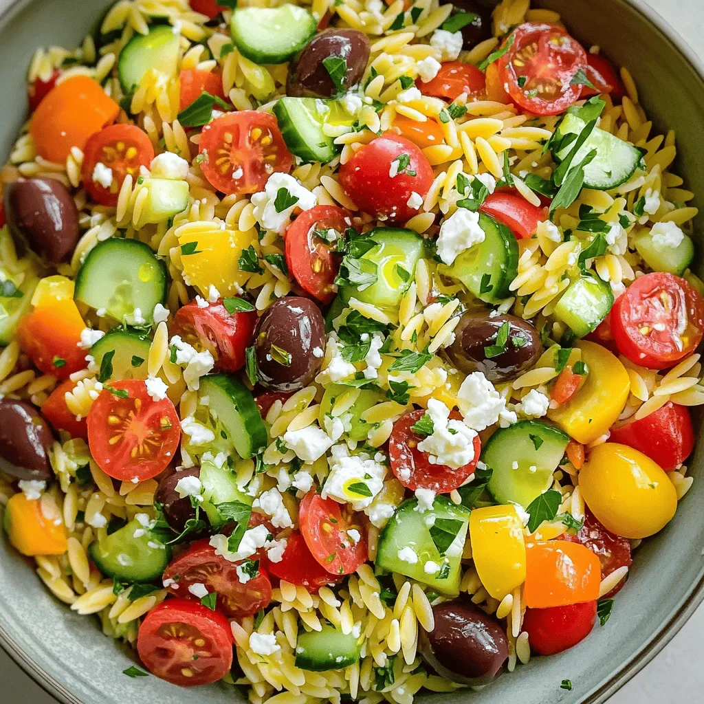 - 1 cup orzo pasta - 2 cups vegetable broth - 1 cup cherry tomatoes, halved - 1 cucumber, diced - 1 cup Kalamata olives, pitted and sliced - 1 bell pepper (any color), diced - ½ red onion, finely chopped - 1 cup feta cheese, crumbled - ¼ cup fresh parsley, chopped I love using orzo pasta in this salad. It cooks quickly and adds a nice texture. The fresh veggies bring color and crunch. Cherry tomatoes add sweetness, while cucumbers keep it cool. Kalamata olives add briny flavor, and bell peppers give a pop of color. Red onion adds a slight bite, and feta cheese brings creaminess and saltiness to the mix. Fresh parsley adds a burst of green and freshness. - 2 tablespoons olive oil - 2 tablespoons red wine vinegar (or lemon juice) - 1 teaspoon dried oregano - Salt and pepper to taste The dressing is simple but full of flavor. Olive oil gives richness, while vinegar or lemon juice adds tang. Dried oregano brings that classic Greek taste. I always season with salt and pepper for balance. - Fresh herbs - Extra feta cheese You can make this salad even better with garnishes. Fresh herbs like dill or more parsley brighten up the dish. Extra feta cheese adds more creaminess and flavor. To start, bring 2 cups of vegetable broth to a boil in a medium saucepan. This broth adds great flavor to the orzo. Once boiling, add 1 cup of orzo pasta. Cook it for about 9 to 10 minutes. I like to check the pasta for al dente texture. When done, drain the orzo and rinse it under cold water. This stops the cooking process and keeps it nice and firm. While the orzo cooks, chop your fresh vegetables. Use 1 cup of halved cherry tomatoes, 1 diced cucumber, 1 diced bell pepper, and ½ finely chopped red onion. Place all the chopped veggies in a large mixing bowl. Once the orzo cools, add it to the bowl with the veggies. Now, stir in 1 cup of sliced Kalamata olives and 1 cup of crumbled feta cheese. This mix is colorful and full of flavor! Next, we’ll make the dressing. In a small bowl, whisk together 2 tablespoons of olive oil, 2 tablespoons of red wine vinegar (or lemon juice if you prefer), 1 teaspoon of dried oregano, and some salt and pepper to taste. Pour this dressing over the salad mixture. Toss gently to combine everything well. Finally, fold in ¼ cup of chopped fresh parsley for an extra burst of flavor. For the best taste, chill the salad for at least 30 minutes before serving. If you want the full recipe, check out Mediterranean Orzo Delight . To cook orzo perfectly, always aim for al dente. This means the pasta should be firm but not hard. Follow the package instructions carefully, usually around 9-10 minutes in boiling vegetable broth. After cooking, drain the orzo. Rinse it under cold water to stop the cooking process. This step keeps the orzo from getting mushy. For the best flavor, use fresh herbs like parsley and oregano. They add brightness to the dish. When mixing ingredients, do it gently. This way, the orzo stays intact, and the veggies remain crisp. Tossing the salad with the dressing is key. It helps each bite burst with flavor. Add salt and pepper to taste for balance. For presentation, serve the salad in a large, shallow bowl. Garnish with extra parsley and a sprinkle of feta on top. This makes it look fresh and inviting. You can pair the orzo salad with grilled chicken or fish. It complements the main dish and adds a colorful touch to your meal. Enjoy! {{image_2}} You can easily switch out some veggies in this salad. If you don’t have cherry tomatoes, try diced bell peppers. They add crunch and color. Zucchini or radishes can also work well. If you want more greens, add spinach or arugula. For cheese, feta is classic, but you can try goat cheese or mozzarella. Both options give a nice creamy touch. If you need a dairy-free choice, look for vegan feta. It’s tasty and keeps the salad fresh. Adding proteins can make this salad more filling. Grilled chicken or shrimp works great. If you want a plant-based option, add chickpeas or black beans. They add protein and flavor. For dressings, use a lemon vinaigrette for a zesty kick. A balsamic glaze can add a sweet touch. You can also mix in herbs like basil or dill for more depth. If you’re looking for gluten-free options, use gluten-free orzo. There are great brands that taste just like regular pasta. You can also use quinoa or rice instead. For vegan adaptations, skip the feta cheese and choose a plant-based dressing. Add extra veggies or nuts for crunch. This way, everyone can enjoy a tasty meal. To keep your Greek orzo salad fresh, use airtight containers. Glass or plastic containers work well. Make sure the lid seals tightly. This helps block air and moisture. Store the salad in the fridge. Keep it there for the best taste. When you store it, layer the salad. Start with the orzo, then add the veggies, olives, and feta on top. This keeps the flavors separate until you eat. Doing this prevents sogginess. You can eat Greek orzo salad cold or warm. Cold is great for a refreshing snack. If you want to reheat it, use a pan on low heat. Stir gently to warm it without cooking the veggies. This keeps the salad's crunch. If you decide to heat it, add a little olive oil. This helps keep the texture nice and smooth. The salad lasts about 3 to 5 days in the fridge. Check for signs of spoilage. If it smells sour or looks slimy, it’s best to toss it. The veggies should stay crisp and colorful. If they start to brown or wilt, it’s time to say goodbye. Enjoy your Greek orzo salad while it’s fresh! You can find the Full Recipe and other tips in the content above. To cook orzo pasta, follow these steps: 1. Bring 2 cups of vegetable broth to a boil in a medium saucepan. 2. Add 1 cup of orzo pasta to the boiling broth. 3. Cook according to the package instructions, usually about 9-10 minutes. 4. Once cooked, drain the orzo and rinse it under cold water. 5. This stops the cooking and cools it down for your salad. Cooking orzo is simple. It becomes soft