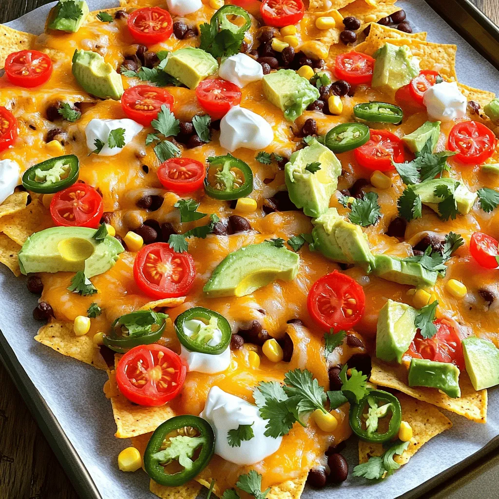 - 1 large bag of tortilla chips - 2 cups shredded cheese (mix of cheddar and Monterey Jack) - 1 can (15 oz) black beans, rinsed and drained - 1 cup cherry tomatoes, halved - 1 jalapeño, sliced (optional) - 1 cup corn (canned or frozen) The heart of your nachos starts with the tortilla chips. They need to be sturdy to hold the toppings. Next, the cheese is key. I love a mix of cheddar and Monterey Jack for their great melt. Black beans add protein and texture. Cherry tomatoes bring freshness, while corn adds sweetness. If you like heat, jalapeños are a must. - 1 avocado, diced - ½ cup sour cream - ¼ cup fresh cilantro, chopped For a twist, consider adding avocado. It adds creaminess and flavor. Sour cream gives a nice cool contrast to the heat. Fresh cilantro brightens the dish and adds a pop of color. These toppings let you customize your nachos based on your taste. - 2 tablespoons lime juice - Salt and pepper to taste A bit of lime juice lifts the flavors. It adds brightness that works well with cheese and toppings. Don’t forget salt and pepper to enhance the taste. Adjust these to fit your preference. For the full recipe, check out the Cheesy Fiesta Sheet Pan Nachos. This recipe lets you create a fun and tasty snack that everyone will enjoy! 1. Preheat your oven to 375°F (190°C). This helps the nachos cook evenly. 2. Line a large baking sheet with parchment paper. This makes cleanup easy and quick. 1. Start by spreading the tortilla chips evenly across the baking sheet. Make sure they cover the surface well but don't stack them too high. 2. Next, distribute the toppings evenly. Add your drained black beans, corn, and halved cherry tomatoes. This ensures every bite is full of flavor. 3. Finally, sprinkle the shredded cheese generously over everything. Cheese makes everything better! 1. Bake the nachos in the preheated oven for about 10-15 minutes. You want the cheese to melt and get bubbly. 2. To check if they are ready, look for melted cheese and golden edges. If they look good, it’s time to take them out! For the full recipe, check out my Cheesy Fiesta Sheet Pan Nachos. Enjoy your tasty creation! To make sure your nachos stay crispy, layer them right. Start with a single layer of tortilla chips. If you stack them, they will become soggy. Top with your favorite ingredients, but keep it light. For the best cheese, I love a mix of cheddar and Monterey Jack. The cheddar gives sharpness, while the Monterey Jack melts beautifully. You can also try pepper jack for a spicy twist. Serve your nachos with great dips. Sour cream is a classic choice. Guacamole adds creaminess. Salsa gives a fresh kick. Pair your nachos with drinks like soda or light beer. A fruity mocktail also works well. These flavors balance the cheesy goodness. Prep toppings in advance to save time. You can dice the tomatoes, slice the jalapeños, and chop the cilantro a day before. Store them in the fridge. Using store-bought ingredients can save you work. Look for pre-shredded cheese and canned black beans. This way, you can focus on the fun part: eating! For the full recipe, check out the complete instructions above. {{image_2}} For those who crave meat, adding cooked chicken or beef takes nachos to a new level. Simply shred or chop cooked meat and sprinkle it over the chips. This adds a rich flavor and extra protein. If you want a vegetarian option, consider using black beans or lentils. These give the same hearty feel without meat. You can also try grilled vegetables like bell peppers or mushrooms for added texture and taste. You can create themed nachos for fun gatherings. For a Tex-Mex style, use ingredients like spicy chorizo, jalapeños, and guacamole. This adds a zesty kick that makes everyone smile. For Southwest flavors, think about adding ingredients like BBQ sauce, pulled pork, or corn salsa. These toppings give a unique twist that will impress your guests and keep them coming back for more. Explore South American influenced toppings for a fresh take. Try adding pico de gallo, queso fresco, or even plantains. Each bite bursts with flavor and transports you to a sunny beach. If you want to try something unique, consider Canadian or Asian inspired additions. For Canadian nachos, drizzle with maple syrup or add poutine-style gravy. For Asian flair, use teriyaki sauce, kimchi, or even sesame seeds. These toppings will surprise and delight your friends. For more ideas, check out the Full Recipe for Easy Sheet Pan Nachos. To keep your nachos fresh, store them in an airtight container. Place a paper towel in the container. This towel absorbs extra moisture and helps keep the chips crisp. You can keep nachos in the fridge for up to three days. If you want to keep them longer, you can freeze them. They will last in the freezer for about a month. Just know that freezing may change the texture of the chips. The best way to reheat nachos is in the oven. Preheat your oven to 350°F (175°C). Spread the nachos on a baking sheet. Bake them for about 10 minutes. This method warms them up without making them soggy. Avoid the microwave. It can make the chips chewy or limp, which is not what we want. If you have leftover nachos, you can use them in other dishes. Chop them up and add them to salads for a crunchy bite. You can also crush them and sprinkle them on soups for extra flavor. These ideas help you enjoy your nachos in new ways. To keep your nachos crisp, layer them wisely. Start with a single layer of tortilla chips. Avoid stacking them too high. Soggy chips often come from wet toppings. Choose toppings that are not too juicy. Rinse and drain black beans well. For tomatoes, use cherry or grape varieties, as they are less watery. If you want to add fresh ingredients like jalapeños or avocados, do this after baking. This helps keep the chips crunchy and delicious. Yes, you can prep some parts ahead. To save time, chop your toppings and store them in the fridge. You can layer your nachos with cheese and toppings, bu