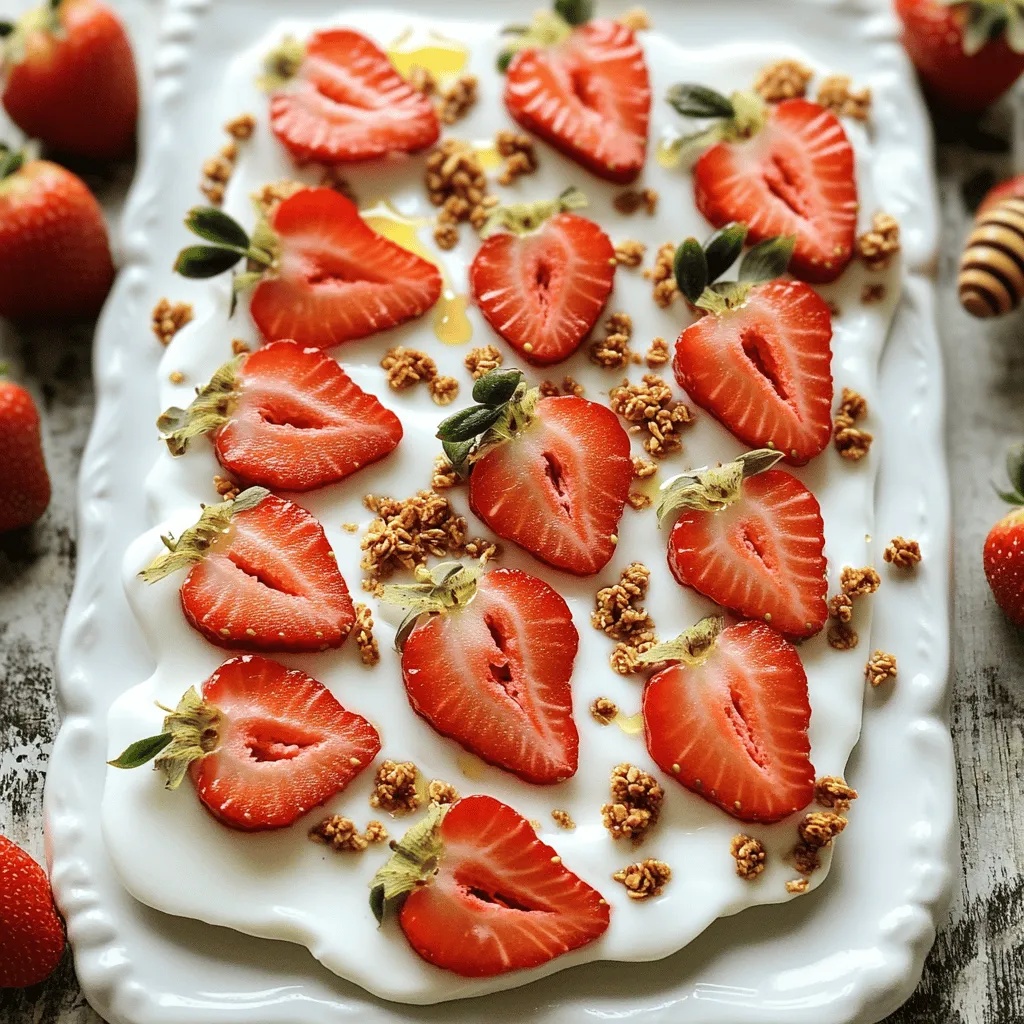 For topping, arrange strawberries in a fun pattern. Press them slightly into the yogurt. This keeps them from falling off when you cut it later. If you like, sprinkle granola or nuts on top for some crunch. It adds flavor and texture.