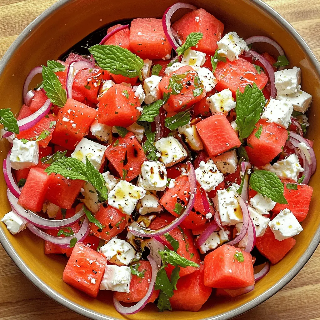 ![- 4 cups seedless watermelon, cubed - 1 cup feta cheese, crumbled - 1 small red onion, thinly sliced - 1/4 cup fresh mint leaves, chopped You will find that using seedless watermelon makes this salad easy to enjoy. Its sweet and juicy cubes give a refreshing bite with every forkful. Feta cheese adds a creamy texture and salty taste, which contrasts perfectly with the sweet watermelon. The red onion gives a slight crunch and a zingy flavor. Fresh mint leaves bring a burst of herbal freshness, making every bite feel like summer. - 2 tablespoons balsamic reduction - 2 tablespoons olive oil - Salt and pepper to taste The dressing is simple but elevates the dish. Balsamic reduction adds a sweet and tangy kick. Olive oil brings a smooth richness that ties everything together. A pinch of salt and pepper enhances the flavors without overpowering them. This balance is key to a perfect Fresh Watermelon Feta Salad, so don’t skip it! For the full recipe, check out the steps later. Enjoy creating this vibrant salad that makes summer meals feel special! Cubing the watermelon Start by choosing a ripe seedless watermelon. Cut it in half, then slice each half into wedges. Remove the rind and cube the flesh into bite-sized pieces. Aim for uniform cubes, as this helps with even mixing later on. Slicing the red onion Next, take a small red onion. Peel the outer layer and cut off the ends. Slice it thinly, aiming for even pieces. This will add a nice crunch and a bit of sharpness to the salad. Combining ingredients in a mixing bowl In a large mixing bowl, combine the cubed watermelon, crumbled feta cheese, and sliced red onion. Gently toss these ingredients to keep the feta from breaking apart too much. You want each bite to have a bit of everything for the best flavor. Drizzling the dressing and tossing the salad Now, in a small bowl, whisk together the balsamic reduction and olive oil until they blend well. Drizzle this mixture over the salad. Season with salt and pepper to taste. Toss everything gently to coat the ingredients evenly. This step brings all the flavors together. Allowing flavors to meld Let the salad sit for about 5 to 10 minutes. This resting time allows the flavors to meld, making each bite even tastier. The juices from the watermelon will mix with the dressing, creating a light sauce. Serving temperature options You can serve this salad chilled or at room temperature. Both options taste great, so choose what you prefer. For a nice touch, serve it in a large shallow bowl and garnish with extra mint leaves and a drizzle of balsamic reduction from the [Full Recipe]. To make the best Fresh Watermelon Feta Salad, you need good ingredients. Start with the watermelon. Look for a ripe one. It should feel heavy for its size. The skin should have a nice shine and a deep color. Tap it gently; a hollow sound means it's ripe. Next, pick quality feta cheese. Look for cheese that is creamy and crumbly. You can find it in blocks or crumbled. If you can, choose feta packed in brine. It keeps the cheese moist and adds flavor. Want to boost the taste? Try adding fresh herbs. Basil or cilantro work well with the salad. They add a fresh twist. You can also use flavored balsamic reductions. These come in different flavors like raspberry or fig. They add sweetness and depth to your salad. When serving, use a large shallow bowl. This makes the salad look inviting. Garnish with extra mint leaves on top. A drizzle of balsamic reduction adds a nice touch. To arrange the salad, layer the watermelon and feta. This creates a beautiful look. Use tongs or a large spoon to serve. This helps keep everything intact. Enjoy your salad as a bright centerpiece for any table! For the complete recipe, check out the Full Recipe. {{image_2}} If you want to change things up, try using goat cheese instead of feta. Goat cheese has a creamy texture that pairs well with watermelon. You can also switch out the fruits. Try adding berries, peaches, or even citrus slices for a fresh twist. Each fruit brings a unique flavor to the salad. You can explore different dressings for this salad. A creamy dressing like ranch can add a rich taste. If you prefer something zesty, a vinaigrette with lemon juice and olive oil gives a bright flavor. Feel free to experiment with herbs in the dressing, like basil or cilantro, for extra depth. To make this salad vegan, skip the cheese and use avocado for creaminess. For a vegetarian option, keep the feta. If gluten is a concern, this recipe is naturally gluten-free. You can enjoy it without worry. Everyone deserves a tasty salad that fits their diet! For the full recipe, check out the Refreshing Watermelon & Feta Delight section. To keep your Fresh Watermelon Feta Salad fresh, store it in an airtight container. This helps hold in the flavors and keep the ingredients crisp. You can refrigerate it for up to three days. After that, the salad may lose its texture and taste. You can make this salad ahead of time for gatherings. Prepare the watermelon, feta, and onion a day before. However, wait to add the mint and dressing until just before serving. This keeps everything fresh and bright. Serve it chilled for the best taste. Freezing this salad is not recommended. The watermelon has high water content. When you thaw it, the texture changes and may become mushy. It’s best enjoyed fresh, so make only what you plan to eat! If you want to switch feta cheese, you have great options. Goat cheese works well. It has a creamy texture and tangy flavor. You can also try ricotta. It adds a soft touch to the dish. For a vegan choice, use tofu. Crumbled firm tofu can mimic feta's texture. You can store the salad for about two days. Keep it in an airtight container in the fridge. This helps keep the watermelon fresh and crunchy. If you add dressing, the salad lasts only one day. The dressing can make the watermelon soggy. Absolutely! Adding ingredients can boost flavor and texture. Try diced cucumbers for crunch. You can