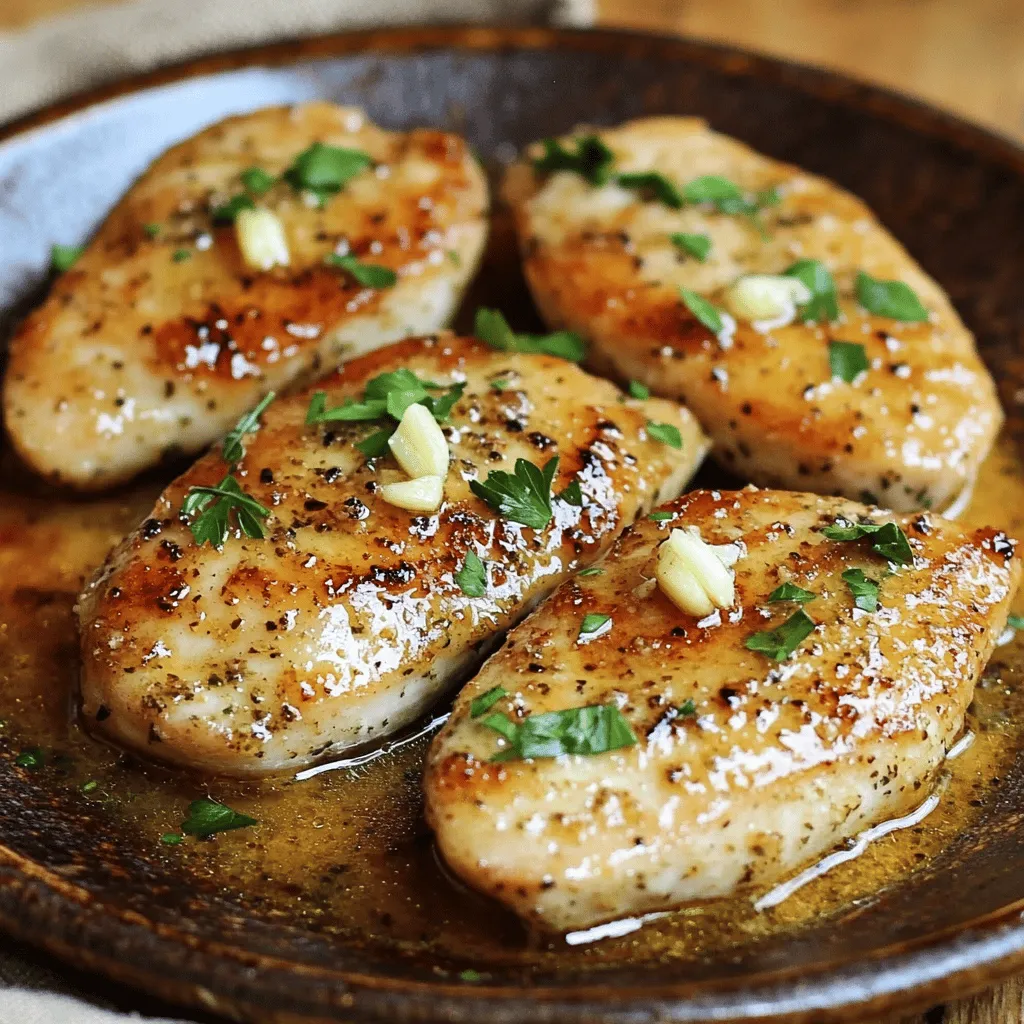 To make Garlic Butter Chicken, gather these simple and fresh ingredients: - 4 boneless, skinless chicken breasts - 4 tablespoons unsalted butter - 6 cloves garlic, minced - 1 teaspoon dried thyme - 1 teaspoon dried oregano - 1 teaspoon paprika - Salt and pepper to taste - 1/2 cup chicken broth - 1 lemon, juiced - Fresh parsley, finely chopped (for garnish) Each ingredient plays a role in creating the rich and savory flavor of this dish. The chicken breasts serve as the protein base. Butter adds creaminess, while garlic delivers that bold aroma. The dried herbs bring depth and warmth. Chicken broth and lemon juice enhance the sauce's taste. Finally, parsley adds a bright touch, making your dish visually appealing. If you want to make it even better, you can adjust the seasoning to match your taste. For a twist, try adding a pinch of chili flakes for some heat or fresh herbs for a different aroma. This recipe is versatile, so feel free to experiment! For the full recipe, check out the detailed steps to bring this dish to life. First, you need to dry the chicken breasts. Use paper towels to pat them dry. This step helps the chicken sear well. Next, season both sides. Use salt, pepper, dried thyme, oregano, and paprika. The spices add a lot of flavor. You can adjust the amount based on your taste. For more zest, add a pinch of cayenne pepper. Get a large skillet and set it over medium-high heat. Melt 2 tablespoons of butter. When the butter is hot, add the seasoned chicken. Let it sear for about 5-6 minutes on each side. You want a golden brown color. Make sure the chicken is cooked through. The internal temperature should reach 165°F. Use a meat thermometer for accuracy. Once cooked, remove the chicken and set it aside. In the same skillet, add the rest of the butter. Once it melts, add minced garlic. Sauté the garlic for 1-2 minutes. You'll know it's ready when it smells amazing. Be careful not to burn the garlic. Burnt garlic can ruin the sauce. If it starts to brown too quickly, lower the heat. Now, it's time to deglaze the pan. Pour in the chicken broth and lemon juice. Scrape up any browned bits from the bottom. These bits are full of flavor. Let it simmer for 2-3 minutes. This helps thicken the sauce. Then, return the seared chicken to the skillet. Spoon the garlic butter sauce over it. Cook on low for an extra 2-3 minutes. This allows the chicken to soak in all the flavors. When ready to serve, plate the chicken. Drizzle any remaining garlic butter sauce over the top. It adds a nice touch. For a pop of color, garnish with chopped parsley. Pair this dish with rice or steamed veggies for a complete meal. A side salad also works well. Enjoy your Garlic Butter Chicken! For the full recipe, check out the rest of the article. Selecting the right chicken breasts is key. Look for fresh, plump, and pale chicken. Avoid any that have dark spots or an off smell. Fresh chicken ensures great flavor and texture. Adjusting seasoning is also important. I recommend tasting the sauce before serving. If you want more flavor, add a pinch of salt or some fresh herbs. You can also try adding a sprinkle of red pepper flakes for heat. One big mistake is overcooking the chicken. Chicken should be juicy and tender. Cook until it reaches 165°F (75°C). Use a meat thermometer for accuracy. It’s worth it! Another common issue is burning garlic. Garlic cooks quickly and can turn bitter. Always sauté it over medium heat and watch it closely. You want it fragrant, not burnt! To boost flavor, consider adding herbs like rosemary or basil. Fresh herbs can add brightness. You can also mix in some lemon zest for a fresh twist. For deglazing, try using white wine or apple cider vinegar instead of chicken broth. These options can add depth to your sauce. Each choice brings a unique flavor profile to the dish. If you want the full recipe, check out the [Full Recipe] for all the details. {{image_2}} You can boost the flavor of garlic butter chicken by adding vegetables. Good choices include: - Broccoli - Bell peppers - Asparagus - Spinach To add these, chop them into bite-sized pieces. Add them to the skillet after cooking the chicken for about 3-4 minutes. This way, they cook but stay crisp. Adjust cooking times based on the vegetable. For softer veggies, add them earlier. For firmer ones, like bell peppers, add them closer to the end. Fresh herbs can brighten your dish. Use them for a fresh taste. Try these combinations: - Thyme and rosemary - Basil and parsley - Oregano and sage If you use fresh herbs, add them at the end of cooking. This keeps their flavor strong. Dried herbs can go in earlier with the chicken. They need time to release their flavor. You can make garlic butter chicken fit many diets. For a gluten-free version, check the chicken broth. Some brands add gluten. Use a gluten-free broth. For a dairy-free option, swap butter with olive oil or vegan butter. The flavor will change, but it will still taste great. You can also use coconut oil for a different twist. For the full recipe, you can refer to the Garlic Butter Chicken Delight. To keep your garlic butter chicken fresh, cool it first. Place it in an airtight container. This helps keep out air and moisture. I recommend using glass or BPA-free plastic containers. Label the container with the date. This way, you can track how long it stays fresh. When reheating, aim for gentle heat to keep the chicken moist. The best method is on the stove. Add a splash of chicken broth to the pan. Cover it with a lid to trap steam. This keeps the chicken from drying out. If using the microwave, place the chicken on a microwave-safe plate. Cover it loosely with a damp paper towel. Heat in short bursts of 30 seconds, checking often. To freeze, let the chicken cool completely. Cut it into pieces for quicker thawing. Wrap each piece tightly in plastic wrap. Place the wrapped pieces in a freezer bag. Squeeze out as much air as you can. For thawing, move the chicken to the f