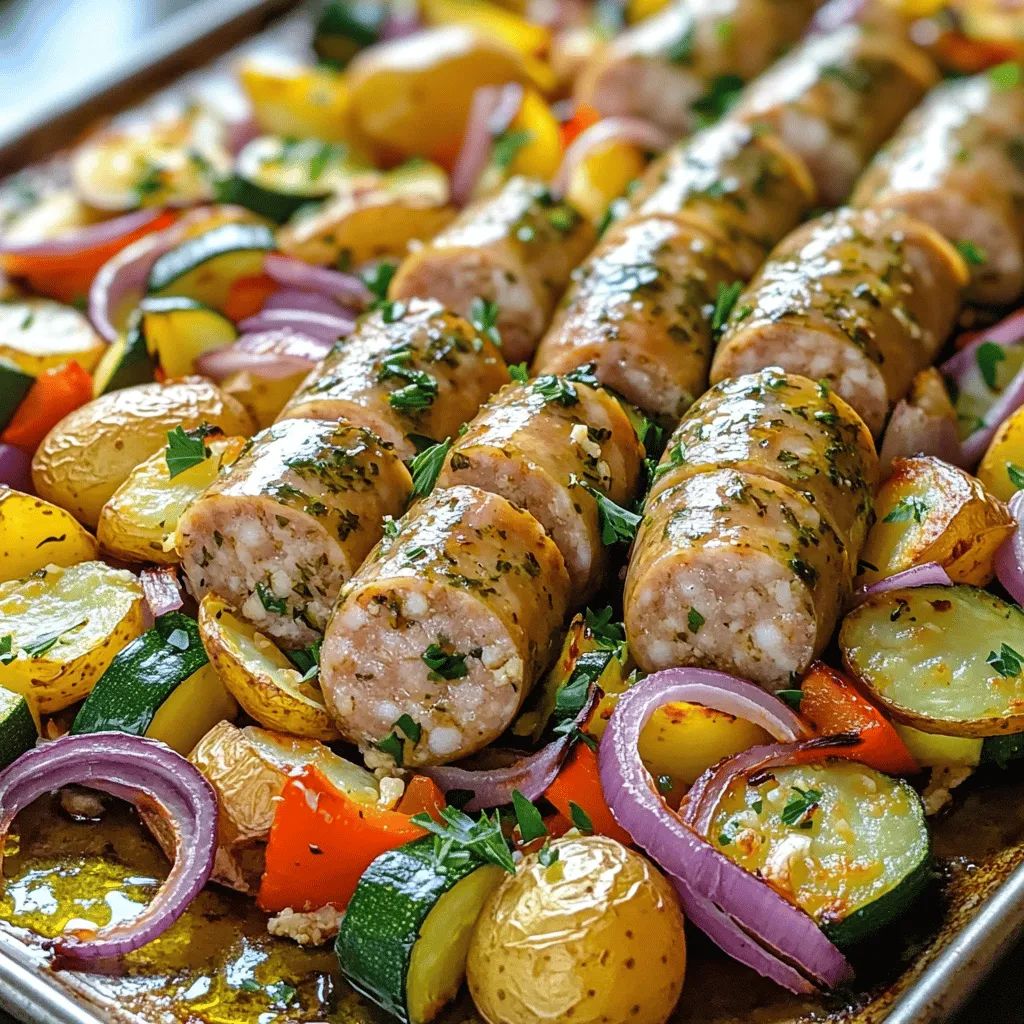 – In a large mixing bowl, combine the sliced chicken sausages, halved baby potatoes, chopped bell pepper, sliced zucchini, and red onion wedges. This mix of colors and textures is key to a great dish.