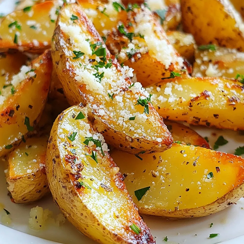 To make delicious Garlic Parmesan Air Fryer Potato Wedges, you need just a few simple ingredients. Here’s what you will need: - 4 medium russet potatoes - 3 tablespoons olive oil - 4 cloves garlic, minced - 1 teaspoon garlic powder - 1 teaspoon onion powder - 1 teaspoon smoked paprika - 1 teaspoon dried Italian herbs - ½ cup grated Parmesan cheese - Salt and black pepper - Fresh parsley for garnish Using russet potatoes gives a nice texture. These potatoes are fluffy inside and crisp outside. Olive oil helps the spices stick to the wedges and provides flavor. Minced garlic adds a fresh, bold taste, while garlic powder boosts the garlic flavor. Onion powder and smoked paprika add depth. Dried Italian herbs mix well with the garlic and cheese. Parmesan cheese gives a salty, nutty taste. Salt and black pepper enhance all the flavors. Fresh parsley adds a pop of color and freshness when serving. Gather these ingredients before you start cooking. This will make the process smooth and fun! {{ingredient_image_1}} Start by washing the russet potatoes well under cold water. This step removes dirt and grime. Pat the potatoes dry using a kitchen towel. Next, cut each potato in half lengthwise. Then, slice each half into wedges that are about 1-inch thick. Making sure the wedges are similar in size helps them cook evenly. In a large bowl, combine the potato wedges with 3 tablespoons of olive oil, 4 cloves of minced garlic, 1 teaspoon of garlic powder, 1 teaspoon of onion powder, 1 teaspoon of smoked paprika, and 1 teaspoon of dried Italian herbs. Add salt and black pepper to taste. Toss everything together well. This ensures that each wedge is coated with the tasty mixture. Now, add ½ cup of grated Parmesan cheese to the bowl. Toss again until the cheese sticks to the wedges. Preheat your air fryer to 400°F (200°C) for about 5 minutes. This step helps the wedges turn crispy quicker. Place the potato wedges in a single layer in the air fryer basket. You might need to cook them in batches if your air fryer is small. Cook the wedges for 15-18 minutes. Remember to shake the basket halfway through. This helps them cook evenly and become golden and crisp. Once they are done, remove the wedges and let them cool slightly before serving. To get crispy potato wedges, follow these tips: - Cook at high heat. Set your air fryer to 400°F (200°C). - Don’t overcrowd. Place wedges in a single layer. This helps air flow. - Shake halfway. Move the basket after about 8 minutes for even cooking. - Adjust cooking time. If your air fryer is small, cook in batches. You may need less time if the basket is crowded. Want to spice up your wedges? Here are some ideas: - Try different spices. Add chili flakes for heat or smoked paprika for depth. - Use fresh herbs. Rosemary or thyme can add a fresh taste. - Cheese options. If you want a twist, try cheddar or feta. Each brings its own flavor. Make your dish more appealing with these tips: - Garnish well. Sprinkle fresh parsley on top for color. - Serve with a dip. Try ranch or garlic aioli on the side. - Plate creatively. Use a wooden board or a colorful plate for a fun look. Pro Tips Soak the Potatoes: Soaking the potato wedges in cold water for 30 minutes before cooking can help achieve a crispier texture by removing excess starch. Experiment with Seasonings: Feel free to customize the seasoning mix by adding your favorite spices or herbs for a unique flavor twist. Don’t Overcrowd the Basket: For the best results, cook the wedges in a single layer and avoid overcrowding the air fryer basket to ensure even cooking. Use Fresh Parmesan: Grating fresh Parmesan cheese instead of using pre-grated will enhance the flavor and help it stick better to the wedges. {{image_2}} You can change the flavor of your potato wedges easily. For a spicy kick, add chili flakes or cayenne. Both of these spices will give your wedges heat. Just sprinkle some on before cooking. You will enjoy a nice balance of garlic and spice. If you want a fresh taste, try using herbs. Fresh herbs like rosemary or thyme add a bright flavor. Mix them in with the oil and spices. This will give your wedges a lovely herbaceous note. You can also try dried herbs if fresh ones are not available. While I love the air fryer, you can also bake these wedges in the oven. Preheat your oven to 425°F (220°C). Spread the seasoned wedges on a baking sheet. Bake them for 25-30 minutes. Flip them halfway for even cooking. Deep frying is another option. Heat oil in a pot to 350°F (175°C). Fry the wedges in small batches until golden brown. This method will give you very crispy wedges. Just be careful with the hot oil! To make your meal even better, think about dips. Ranch dressing or garlic aioli works well with these wedges. You can also try a spicy sriracha mayo for something different. As for side dishes, these wedges pair great with grilled chicken or burgers. They also go well with a fresh salad. The crunch from the wedges complements soft foods nicely. Enjoy mixing and matching! To store leftover potato wedges, let them cool first. Place them in an airtight container. Keep the container in the fridge. These wedges will stay fresh for up to four days. When you want to eat them, reheat in the air fryer. Heat them at 350°F for about 5-7 minutes. This will help restore crispiness. To freeze potato wedges, let them cool completely. Place them in a single layer on a baking sheet. Freeze for about an hour until firm. Once firm, transfer them to a freezer bag. Remove as much air as possible to avoid freezer burn. To keep the texture, do not freeze them for more than two months. Fresh potato wedges last for four days in the fridge. Look for signs of spoilage. If they smell bad or feel slimy, it’s time to toss them. Always trust your senses to keep your food safe. Yes, you can use other types of potatoes! I recommend trying Yukon Gold or sweet potatoes. They both have unique flavors and textures. Yukon Golds become creamy 