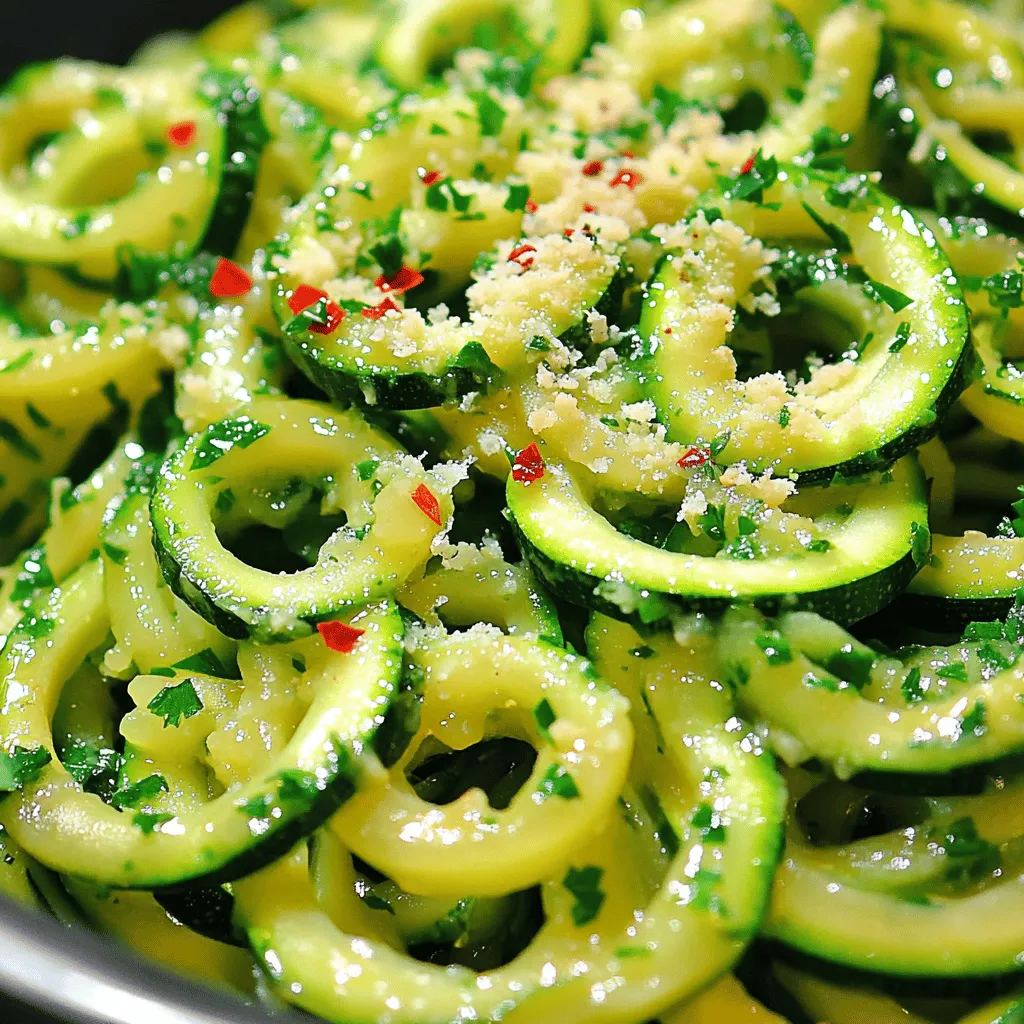 To make Garlic Parmesan Zoodles, you need a few fresh and simple ingredients. Here’s what you’ll need: - 4 medium zucchini, spiralized into zoodles - 3 tablespoons olive oil - 4 cloves garlic, minced - 1/2 teaspoon red pepper flakes (optional) - 1/2 cup grated Parmesan cheese - Salt and pepper to taste - 2 tablespoons fresh parsley, chopped (for garnish) These ingredients come together to create a dish that bursts with flavor while being healthy. The zucchini serves as a great low-carb alternative to pasta. The garlic adds a wonderful aroma, and the Parmesan cheese brings creaminess. The red pepper flakes, if you choose to add them, give a slight kick that balances the flavors beautifully. And don’t forget the fresh parsley; it brightens the dish and adds color. For a detailed guide on how to prepare this dish, check the Full Recipe. With these ingredients, you can create a delightful meal that’s quick and easy to make! Spiralizing the zucchini To start, grab your zucchini. Use a spiralizer or a julienne peeler. Create long, noodle-like strands. Aim for about four medium zucchinis. Set the zoodles aside once done. Sautéing garlic Next, take a large skillet and heat three tablespoons of olive oil. Place it over medium heat. When the oil gets hot, add four minced garlic cloves. Sauté for about 30 seconds. Watch closely so it doesn’t burn. You want it fragrant but not dark. Cooking the zoodles Now, add the zoodles to your skillet. If you like heat, sprinkle in a half teaspoon of red pepper flakes. Toss the zoodles to coat them in the garlic oil. Cook for about three to four minutes. Stir occasionally, so they stay tender but crunchy. Adding red pepper flakes If you chose to use them, the red pepper flakes add a nice kick. They give the dish a bit of warmth. Mix them in right after adding the zoodles to the skillet. Incorporating Parmesan cheese Remove the skillet from heat. Add half a cup of grated Parmesan cheese. Toss the zoodles until they are evenly coated. The cheese will melt and stick to the zoodles nicely. Seasoning with salt and pepper Taste your zoodles. Add salt and pepper to your liking. This step is key for balancing all the flavors. Adjust as needed for your taste buds. Garnishing with parsley To make it look fresh, chop two tablespoons of parsley. Sprinkle this on top of your zoodles. It adds a pop of color and brightness. Plating options You can serve the zoodles in a bowl or on a plate. Consider adding a drizzle of olive oil for shine. Pair it with grilled chicken or shrimp for a full meal. Enjoy your Garlic Parmesan Zoodles hot! For the full recipe, check out the earlier section. To make perfect zoodles, you must avoid sogginess. Start with fresh zucchini. Choose firm ones without soft spots. Spiralize them right before you cook for the best texture. If you cut them too early, they can release water and become mushy. For cooking time, aim for 3-4 minutes. This keeps them tender yet crunchy. Stir them gently to avoid breaking the strands. Adding herbs and spices can elevate your zoodles. Fresh basil or oregano pairs well with garlic. For a kick, try adding red pepper flakes. You can also mix in lemon zest for brightness. If you're looking for cheese alternatives, try nutritional yeast for a vegan option. You can also use Pecorino Romano for a sharper flavor. A good spiralizer is key to making zoodles. I recommend a handheld spiralizer or a countertop model. Both work well and are easy to clean. Other useful kitchen gadgets include a sharp knife for prepping vegetables and a large skillet for cooking. A good set of measuring spoons helps you get the right amounts for the recipe. Don’t forget to check out the Full Recipe for all the steps to make this dish! {{image_2}} You can swap zucchini for other veggies. Try using carrots or sweet potatoes. They also spiralize well. You can make zoodles from cucumbers too. Each option adds a new flavor. For cheese, Parmesan is classic, but feel free to experiment. Try pecorino or nutritional yeast for a unique twist. These options can change the dish’s taste. If you're on a low-carb plan, zoodles fit right in. They are a great pasta substitute. You can enjoy a tasty meal without the carbs. For vegan or dairy-free dishes, skip the cheese. Use nutritional yeast for a cheesy flavor. You can also add creamy avocado for richness. This keeps the dish delicious and plant-based. Garlic Parmesan zoodles pair well with proteins. Try grilled chicken or shrimp for a filling meal. These proteins add great taste and texture. You can also serve zoodles as a side dish. They go well with steaks or fish. This adds color and nutrition to your plate. For more ideas, check out the Full Recipe for the perfect Garlic Parmesan Zoodles! After you make Garlic Parmesan Zoodles, store them in the fridge. Use an airtight container. This keeps the zoodles fresh for about three days. If you want to freeze them, do so right after cooking. Place zoodles in a freezer bag, remove excess air, and seal tightly. They last up to three months in the freezer. However, freezing may change their texture. When it's time to enjoy your leftovers, I recommend reheating them in a skillet. Add a splash of olive oil over medium heat. Stir gently for about two to three minutes. This method helps keep the zoodles crunchy. You can also use the microwave, but be careful not to overheat. Heat in short bursts of 30 seconds, stirring in between. This way, the zoodles stay tender without getting mushy. Garlic Parmesan Zoodles last about three days in the fridge. After this, they may lose flavor and texture. Signs of spoilage include a sour smell and a slimy texture. If you see these signs, it’s best to discard them. Always trust your senses when it comes to food safety. Zoodles are noodles made from zucchini. They are a great low-carb option for pasta lovers. Zoodles are light and refreshing, offering a great way to enjoy veggies. You get added nutrients like vitamins A and C.