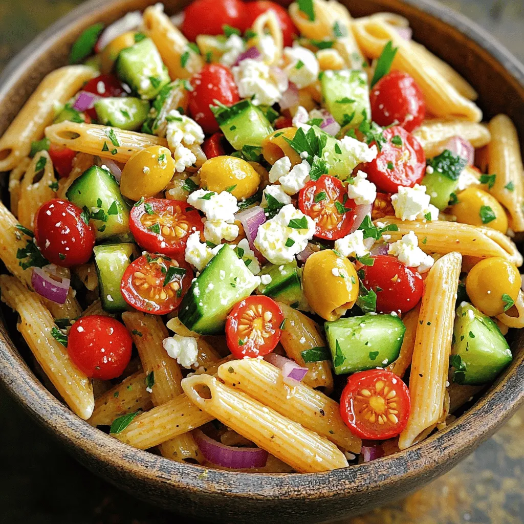 To make a tasty Greek pasta salad, gather these main items: - 2 cups whole wheat penne pasta - 1 cup cherry tomatoes, halved - 1 cucumber, diced - 1 red bell pepper, diced - 1/2 red onion, finely chopped - 1 cup Kalamata olives, pitted and sliced - 1 cup feta cheese, crumbled - 1/4 cup fresh parsley, chopped - 1/4 cup olive oil - 3 tablespoons red wine vinegar (or lemon juice) - 1 teaspoon dried oregano - Salt and pepper to taste These ingredients come together to make a fresh and flavorful salad. I love how each item adds a unique taste and texture. You can add some optional ingredients to mix it up: - Artichoke hearts - Sun-dried tomatoes - Capers - Fresh basil - Avocado These extras can bring new flavors and fun textures to your salad. Try them based on what you like! To make your Greek pasta salad, you will need a few kitchen tools: - Large pot for boiling pasta - Colander for draining pasta - Large mixing bowl for combining all ingredients - Whisk for mixing the dressing - Knife and cutting board for chopping veggies Having the right tools makes cooking easier and more fun. Grab these before you start! First, boil water in a large pot. Add a pinch of salt for flavor. Once it boils, add 2 cups of whole wheat penne pasta. Cook it for about 8 to 10 minutes until it is al dente. This means it should be firm but not hard. Drain the pasta and rinse it under cold water. This stops the cooking and cools it down. While the pasta cooks, wash and chop your veggies. I use 1 cup of cherry tomatoes, cutting them in half. Then, I dice 1 cucumber and 1 red bell pepper. Next, finely chop 1/2 red onion. For the olives, slice 1 cup of Kalamata olives. Finally, crumble 1 cup of feta cheese. Set all of these in a large mixing bowl. In a small bowl, mix the dressing. Start with 1/4 cup of olive oil. Then add 3 tablespoons of red wine vinegar or lemon juice. Sprinkle in 1 teaspoon of dried oregano. Add salt and pepper to taste. Whisk everything together until it’s well combined. Now, it’s time to mix! Add the cooled pasta to the bowl with your veggies and feta cheese. Pour the dressing over the top. Gently toss everything together. Make sure the dressing coats all the ingredients well. Let the salad sit for about 15 to 20 minutes. This helps the flavors blend. You can also refrigerate it for up to 2 hours. Serve it chilled or at room temperature. Enjoy your tasty Greek pasta salad! For more details, check the Full Recipe. To cook pasta well, always use a large pot. Fill it with water and add salt. This helps season the pasta. Bring the water to a boil before adding the pasta. Stir it often to prevent sticking. Cook it until it is al dente. This means it should still be firm. Drain and rinse the pasta with cold water. This stops the cooking and keeps it from getting mushy. If you can't find whole wheat penne, use any pasta you like. Gluten-free pasta is a great option too. Cherry tomatoes can be swapped for diced tomatoes or bell peppers. If you don’t have Kalamata olives, green olives work well. For feta cheese, try goat cheese for a different taste. You can also leave the cheese out for a dairy-free version. To boost flavor, add fresh herbs like basil or mint. Lemon zest adds brightness to the dish. Toasting the nuts, like pine nuts or walnuts, enhances their taste. You can also mix in roasted red peppers for smoky depth. A sprinkle of chili flakes adds a nice kick if you like spice. Visit local farmers' markets for the freshest produce. Look for firm tomatoes and crisp cucumbers. Choose bright, colorful bell peppers for the best flavor. Fresh parsley should have vibrant green leaves. When buying olives, choose ones packed in brine for taste. Always check the expiration dates on packaged items like pasta and cheese. This dish is not just tasty; it’s a way to enjoy fresh, vibrant flavors. For more details, check out the Full Recipe. {{image_2}} To make your Greek pasta salad more exciting, add some Mediterranean touches. You can include roasted red peppers, artichoke hearts, or sun-dried tomatoes. These ingredients will bring rich flavors and vibrant colors. You might also want to toss in some fresh basil or mint. These herbs add a nice twist. They brighten up the dish and enhance the taste. If you want to boost the protein in your salad, think about adding grilled chicken or shrimp. They both work well with Greek flavors. Chickpeas are also a great choice if you prefer a plant-based option. They add a hearty texture and extra protein. Quinoa is another excellent addition. It pairs well and makes the dish even more filling. For a vegan version, skip the feta cheese. You can use vegan cheese or leave it out entirely. To make it gluten-free, swap the whole wheat penne for gluten-free pasta. Many brands offer tasty alternatives. Just be sure to check the label for any hidden gluten. These simple changes ensure everyone can enjoy your Greek pasta salad. For full details on the recipe, check out the Full Recipe. To keep your Greek pasta salad fresh, store it in an airtight container. This helps prevent moisture from getting in. I recommend adding a layer of plastic wrap over the salad before sealing the lid. This simple step locks in flavor and freshness. You can also divide it into smaller portions for quick snacks or lunches. Greek pasta salad lasts about three to five days in the fridge. The flavors get better as it sits, but keep an eye on the veggies. If they start to look soggy or brown, it's best to toss them. Always check for any off smells before eating leftovers. You can eat Greek pasta salad cold or at room temperature. I prefer it chilled, as it keeps the flavors bright. If you want to warm it up, do so gently on the stove. Heat it on low and stir often to avoid overcooking the pasta. Serve it with extra feta or olives on top for a fun twist. For the Full Recipe, check out the earlier section. Yes, you can make Greek Pasta Salad ahead of time. It tastes better when chilled. Make it up to tw