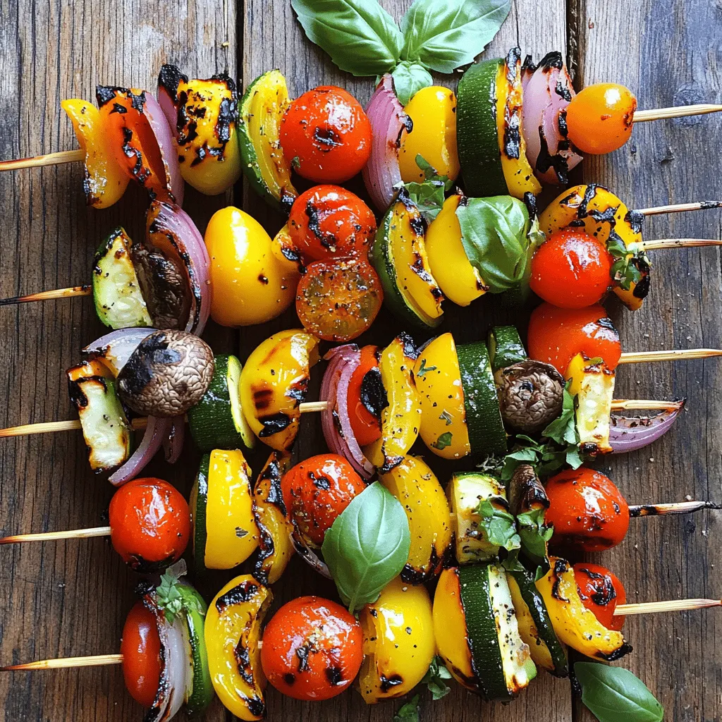 - Red bell pepper chunks - Yellow bell pepper chunks - Zucchini slices - Red onion wedges - Cherry tomatoes - Halved mushrooms - Olive oil - Balsamic vinegar - Minced garlic - Dried oregano - Smoked paprika - Salt and pepper to taste I love choosing colorful veggies for skewers. Red and yellow bell peppers add sweetness. Zucchini gives a nice texture. Red onions add a sharp taste. Cherry tomatoes burst with flavor when grilled. Mushrooms soak up the marinade well. For the marinade, I mix olive oil and balsamic vinegar. This combo adds a tangy taste. I then add minced garlic for a punch of flavor. Dried oregano gives it an Italian twist. Smoked paprika adds a warm, smoky note. Always remember to season with salt and pepper. This makes a big difference. - Fresh basil leaves - Additional seasoning suggestions Garnishing can elevate your skewers. I like to add fresh basil leaves for a bright touch. You can also sprinkle more seasoning on top. Try a dash of chili flakes for some heat. A squeeze of lemon juice adds freshness too. For the full recipe, check the details above. Happy grilling! First, preheat your grill to medium-high heat. This helps to get those nice grill marks. While the grill heats, soak your wooden skewers in water for about 10 to 15 minutes. Soaking prevents them from burning while cooking. Next, grab a large bowl to make the marinade. Combine these ingredients: - 3 tablespoons olive oil - 2 tablespoons balsamic vinegar - 2 cloves garlic, minced - 1 teaspoon dried oregano - 1 teaspoon smoked paprika - Salt and pepper to taste Whisk these together until mixed well. Now, add your chopped vegetables: - 1 red bell pepper, cut into chunks - 1 yellow bell pepper, cut into chunks - 1 zucchini, sliced into thick rounds - 1 red onion, cut into wedges - 8 cherry tomatoes - 1 cup mushrooms, halved Toss the vegetables in the marinade until well coated. Let them sit for about 15 minutes. This step allows the veggies to soak up the flavors. Now it's time to build your skewers. Thread the marinated vegetables onto the soaked skewers. Alternate colors and shapes for a pretty look. Once your grill is ready, place the skewers on it. Close the lid and grill for about 8 to 10 minutes. Turn them occasionally. You want the veggies tender with nice grill marks. When done, take the skewers off the grill and let them sit for a minute. If you like, add fresh basil leaves as a garnish before serving. Enjoy your tasty grilled veggie skewers! For the full recipe, check out the details provided above. To grill veggies just right, keep an eye on the temperature. Aim for medium-high heat. This ensures your veggies cook evenly. If the grill is too hot, they may burn outside while staying raw inside. Overcooking can ruin your skewers. Watch the clock! Grill them for about 8-10 minutes. Turn them often for even cooking. They should be tender but still firm. Want to boost the taste? Try a few different marinades! You can add lemon juice or soy sauce for a new twist. Honey can give a hint of sweetness too. Explore spices and herbs! Fresh thyme or rosemary can add depth. Try chili flakes for some heat. Mix it up based on your mood or what you have at home. Feel free to switch up the veggies! Asparagus, eggplant, or even corn can make great additions. Use seasonal veggies for the freshest taste. You can also add protein! Chicken, shrimp, or tofu can fit right in. Just adjust the grilling time based on the protein. This way, you create a heartier meal. For the full recipe, check the details above. {{image_2}} For a great meal, pair your grilled veggie skewers with tasty sides. Here are some ideas: - Quinoa salad with lemon - Creamy potato salad - Grilled corn on the cob - Flatbreads with herbs You can also serve them with dips and sauces. Some good choices include: - Tzatziki sauce for a cool bite - Hummus for a creamy touch - Chimichurri for a fresh kick Make your skewers shine when you serve them. Try these tips: - Use a large platter to show off the colors. - Place fresh herbs around the skewers for a pop of green. - Drizzle some balsamic glaze over the top for a shiny finish. You can also add lemon wedges for a touch of zest. It adds color and a hint of flavor. If you have leftovers, store them right. Place the skewers in an airtight container. Keep them in the fridge for up to three days. When you want to eat them again, reheating is easy. Simply place the skewers on a grill or in a pan over medium heat. Heat them for about 5 minutes until warm. This keeps them tasty and prevents them from drying out. For more details and tips, check the Full Recipe for Grilled Veggie Skewers. Using seasonal vegetables can make your skewers fresh and tasty. Think of bright summer zucchini or hearty winter squash. These veggies taste great when grilled. You can even mix in fruits for added sweetness. Pineapple and peaches caramelize nicely on the grill. This makes for a fun twist and adds flavor. You can create themed skewers for fun meals. For Mediterranean-inspired skewers, use veggies like eggplant, cherry tomatoes, and olives. Add some feta cheese for extra flavor. For Asian-inspired mixes, try bell peppers, mushrooms, and green onions. Toss them with a little soy sauce or sesame oil. This gives a different taste and style to your skewers. If you want vegan options, skip any cheese and focus on the veggies and fruits. You can grill tofu or tempeh for protein. For gluten-free needs, check your marinade. Use gluten-free soy sauce or tamari for flavor. This way, everyone can enjoy these delicious skewers. You can find the full recipe for grilled veggie skewers to get started on your next meal! Grill veggie skewers for about 8 to 10 minutes. Turn them every few minutes. The goal is to get nice grill marks and a tender texture. If they start to brown, that's a good sign! Yes, you can use frozen vegetables. Make sure to thaw them first. Pat them dry to avoid excess moisture. This helps them grill better and prevents steaming. G