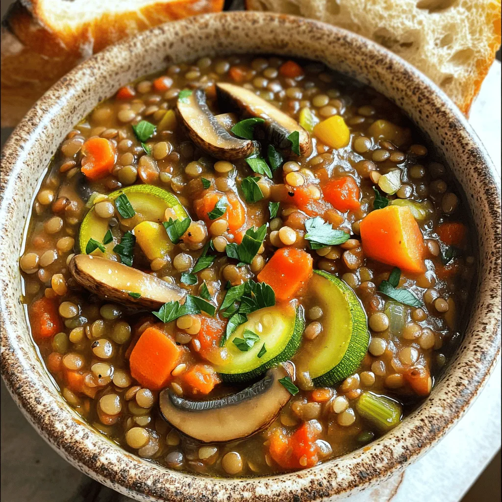 To make a delicious Hearty Vegan Lentil Mushroom Stew, you need fresh and tasty ingredients. Here’s what you will need: - 1 cup green or brown lentils, rinsed - 2 cups mushrooms (cremini or button), sliced - 1 medium onion, diced - 3 cloves garlic, minced - 2 carrots, chopped - 2 celery stalks, chopped - 1 zucchini, diced - 1 can (14 oz) diced tomatoes (with juice) - 4 cups vegetable broth - 1 tablespoon olive oil - 1 teaspoon dried thyme - 1 teaspoon smoked paprika - ½ teaspoon ground cumin - Salt and pepper to taste - Fresh parsley, chopped (for garnish) These ingredients work together to create a warm and hearty meal. Lentils are the star here, packed with protein and fiber. They give the stew its thickness and rich texture. The mushrooms add a savory depth, while the vegetables bring freshness and crunch. Using vegetable broth instead of water enhances the flavor. Smoked paprika and thyme provide a lovely aroma. As you cook, the scents will fill your kitchen and make your mouth water. This stew is not just filling; it’s also colorful and inviting. You can find the full recipe with instructions to bring this dish to life. Enjoy the process of cooking and savor the result! Making this hearty vegan lentil mushroom stew is simple and fun. You will cook the lentils with mushrooms and veggies in a big pot. This stew is packed with flavor and fills you up! - Step 1: Heating the Olive Oil Start by pouring one tablespoon of olive oil into a large pot. Heat it over medium heat. - Step 2: Sautéing the Aromatics Add one diced onion to the pot. Stir and cook for about five minutes until it turns soft and clear. Then, add three minced garlic cloves, two chopped carrots, and two chopped celery stalks. Cook these for another three to four minutes. - Step 3: Cooking the Mushrooms Now, it's time for two cups of sliced mushrooms. Toss them into the pot and cook until they let out their juices, about five to six minutes. This step brings out their rich flavor. - Step 4: Adding Remaining Ingredients Next, add one diced zucchini, one cup of rinsed lentils, and a can of diced tomatoes (with juice). Pour in four cups of vegetable broth. Sprinkle in one teaspoon of dried thyme, one teaspoon of smoked paprika, and half a teaspoon of ground cumin. Now, season with salt and pepper to taste. - Step 5: Simmering the Stew Bring your mixture to a boil. Once it boils, lower the heat. Cover the pot and let the stew simmer for about 30 to 35 minutes. Stir it occasionally, and check if the lentils are soft. - Step 6: Serving Instructions After the lentils are tender, turn off the heat. Let the stew sit for a few minutes. When you serve, garnish it with fresh parsley. This adds a nice touch and a burst of flavor. You can find the full recipe for this delicious dish above. Enjoy your warm bowl of goodness! How to Achieve the Best Flavor To get the best flavor, use fresh herbs. They bring a bright taste. Smoked paprika adds depth. Remember to sauté onion and garlic first. This step builds a strong flavor base. Ensuring Proper Consistency The right stew should be thick but not dry. If it gets too thick, add more broth. Stir the stew often while it cooks. This helps all the flavors blend well. Common Mistakes to Avoid Don’t rush the cooking time. Lentils take time to soften. Skipping the sauté step can lead to bland stew. Always season as you go. Taste it before serving. Alternative Base Ingredients If you don’t have lentils, try chickpeas or beans. They add protein and fiber. For the broth, you can use water with seasonings. This still keeps the dish tasty. Vegan Additions for Extra Nutrition Add spinach or kale for extra vitamins. You can also include quinoa or farro for more texture. These options boost the nutrition without losing flavor. For the Full Recipe, check the details in the recipe section. {{image_2}} Adding Spices for Extra Heat If you want to spice up your stew, add red pepper flakes or cayenne pepper. Both will bring a nice kick. Start with a small pinch. You can always add more if you like it hotter. Incorporating Other Vegetables Feel free to mix in your favorite veggies. Sweet potatoes, bell peppers, or green beans work well. They add flavor and nutrients too. Just chop them up and add them to the pot when you add the other ingredients. Gluten-Free Options This stew is naturally gluten-free. Just make sure your broth does not contain gluten. Most vegetable broths are safe, but check the labels. High-Protein Variations Want more protein? Add some quinoa or chickpeas. Both are great choices. Quinoa cooks quickly and adds nutty flavor. Chickpeas give a hearty texture. Mix them in during the last few minutes of cooking. You can find the full recipe for more details on how to prepare this dish. To keep your Hearty Vegan Lentil Mushroom Stew fresh, use the right containers. Glass containers with airtight lids work best. They help prevent spills and keep out air. You can also use BPA-free plastic containers. Make sure they are safe for heat. Before you pack the stew, let it cool down. This helps avoid condensation, which can make the stew watery. Pour the stew into the container and seal it tight. Leave a little space at the top. This allows for some expansion when you freeze it. When you're ready to eat your stew, you can reheat it easily. The best methods are on the stove or in the microwave. For the stove, pour the stew into a pot. Heat it on medium, stirring often. This helps it warm evenly. If you use the microwave, transfer the stew to a microwave-safe bowl. Cover it with a microwave-safe lid or wrap. Heat in short bursts, stirring in between. This prevents hot spots. To refresh your leftovers, add a splash of vegetable broth or water. This helps bring back the creamy texture. Stir well and heat again until it is warm. Enjoy your stew just like fresh! Can I use different types of lentils? Yes, you can use different lentils. Green, brown, or even red lentils work well. Just note that red lentil