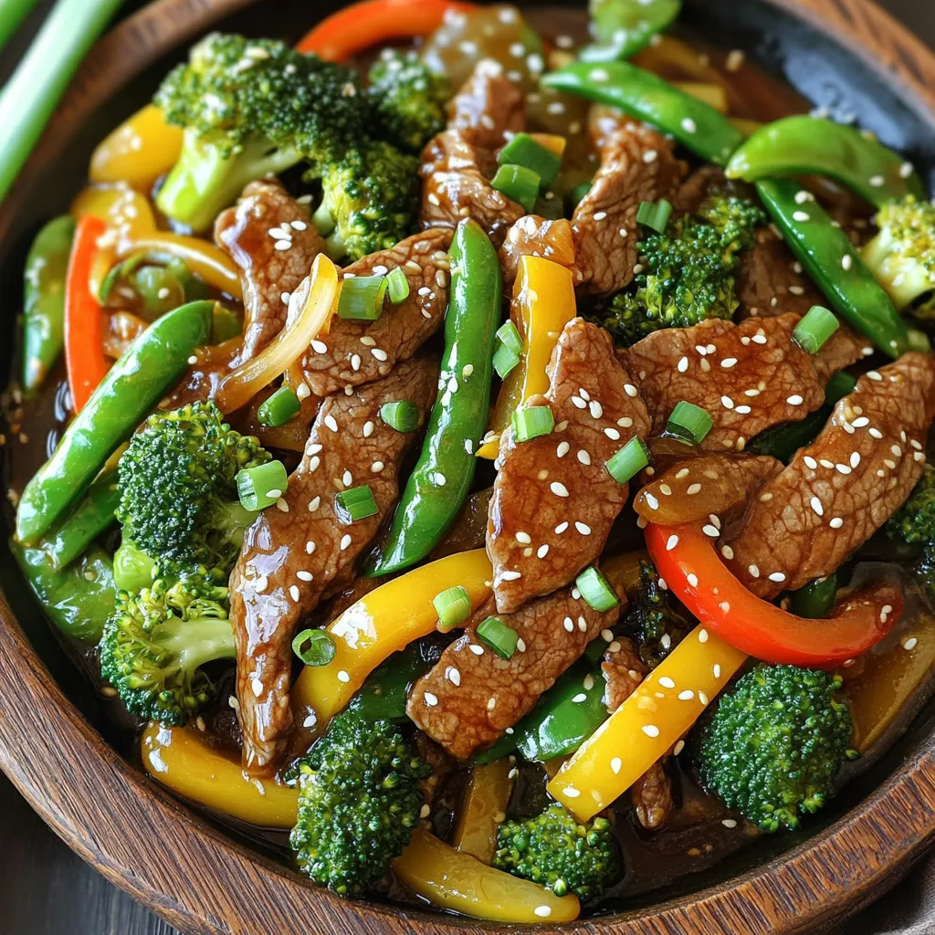 - 1 lb flank steak, thinly sliced against the grain - 2 tablespoons vegetable oil - 3 cloves garlic, minced - 1 inch ginger, grated - 1 bell pepper (red or yellow), sliced - 1 cup broccoli florets - 1 cup sugar snap peas - 1/4 cup soy sauce - 1/4 cup honey - 1 tablespoon cornstarch mixed with 2 tablespoons water (slurry) - 1 teaspoon sesame oil - Sesame seeds for garnish - Green onions, sliced for garnish The main ingredients are key to making this dish tasty. The flank steak brings a rich flavor. Garlic and ginger add warmth and depth. The veggies keep the dish bright and fresh. You can mix and match colors for a pretty plate. - Cooked rice or noodles - Extra sesame seeds - Chopped cilantro - Lime wedges Adding garnishes can make your dish pop. You can serve it over rice or noodles for a filling meal. Lime wedges give a nice zing, too. Fresh herbs like cilantro add a burst of flavor. - Large skillet or wok - Cutting board - Sharp knife - Mixing bowl - Measuring spoons - Wooden spatula Having the right tools helps you cook with ease. A large skillet or wok helps with even cooking. A sharp knife makes slicing meat and veggies quick. Use a mixing bowl to marinate the beef, making clean-up simple. To marinate the beef, start with a bowl. Add 1 lb of thinly sliced flank steak. Pour in 1/4 cup of soy sauce and 1/4 cup of honey. Add 3 cloves of minced garlic. Mix well to coat all the beef. Let it sit for at least 15 minutes. If you have more time, let it marinate for up to 30 minutes. This step makes the beef tender and flavorful. Next, heat 2 tablespoons of vegetable oil in a large skillet or wok. Use medium-high heat until the oil shimmers. Take the marinated beef out of the bowl, but keep the marinade. Add the beef to the pan and stir-fry for about 3 to 4 minutes. Cook until the beef is browned but not fully done. Remove the beef from the pan and set it aside. This helps keep the beef juicy. In the same pan, add more oil if needed. Toss in 1 inch of grated ginger first, then the sliced bell pepper, 1 cup of broccoli florets, and 1 cup of sugar snap peas. Stir-fry for 3 to 5 minutes. You want the veggies to be tender but still crisp. After that, return the beef to the pan. Pour in the reserved marinade. Cook for another 2 minutes. Add a cornstarch slurry made from 1 tablespoon of cornstarch mixed with 2 tablespoons of water. Stir well and let it thicken for a minute. Finally, drizzle 1 teaspoon of sesame oil over everything and mix. Now, your stir fry is ready to serve! To get the best stir-fry texture, cut the beef thinly. This helps it cook fast. Always slice against the grain. This makes the beef tender. Use high heat when cooking. A hot pan gives a nice sear. Do not overcrowd the pan. Cook in batches if needed. This keeps the beef juicy and prevents steaming. Marinating beef adds flavor. Combine soy sauce, honey, and garlic in a bowl. Place the sliced beef in the marinade. Let it sit for at least 15 minutes. For more flavor, you can marinate for 30 minutes. Use a resealable bag for less mess. Make sure all the beef is coated well. This helps the flavors seep in. You can change the sweetness by adding more or less honey. If you like it sweeter, add a bit more honey. For less sweetness, cut back on honey. Adjusting saltiness is easy too. Add more soy sauce for a saltier taste. If it’s too salty, add a splash of water. Taste as you go to find your perfect balance. {{image_2}} You can make this dish vegetarian by using tofu instead of beef. Tofu is a great protein source. First, press the tofu to remove excess water. Cut it into cubes and marinate it. Use the same marinade as the beef for good flavor. Stir-fry the tofu in the pan until it is golden brown. Then, add your veggies and sauce just as you would with beef. This makes for a tasty and filling meal. If you want a different protein, try chicken or shrimp. Chicken breast works well when cut into thin strips. Shrimp cooks quickly and adds a nice texture. Just adjust the cooking time. For chicken, stir-fry until fully cooked. For shrimp, cook until they turn pink. Both options will absorb the honey garlic sauce nicely. Feel free to mix and match your vegetables. You can use carrots, snap peas, or mushrooms. Each veggie adds a unique taste and crunch. Try adding zucchini or asparagus for a fresh twist. The key is to keep the colors bright and the textures varied. This makes your stir-fry more appealing and fun. Just remember to cook the veggies until they are tender but still crisp. After you enjoy your Honey Garlic Beef Stir Fry, let it cool. Next, place it in an airtight container. Store it in the fridge for up to three days. Make sure to keep it sealed to avoid any strange smells. If you want to save some for later, freezing is a great option. First, let the stir fry cool completely. Then, put it in a freezer-safe container. You can also use freezer bags. Squeeze out the air before sealing. It will keep in the freezer for up to three months. When you are ready to eat your leftovers, there are a few ways to reheat them. The best method is to use a skillet. Heat it over medium heat and add a splash of oil. Stir fry the leftovers for about 5-7 minutes until warmed through. You can also use the microwave for a quick option. Just heat it in 30-second bursts, stirring in between. Enjoy your meal! Yes, you can use other cuts of beef. Options like sirloin or ribeye work well. Just slice them thinly. This ensures quick cooking. Flank steak is great, but you can explore flavors with other cuts too. To spice up the sauce, add red pepper flakes. Start with half a teaspoon. You can also use sriracha or chili paste for heat. Add to the marinade or at the end for more kick. Adjust to your taste. Serve this dish with rice or noodles. Steamed white rice works well. You can also try brown rice for a healthier option. Adding a side salad or spring rolls makes a great meal too. Store leftovers in an airtight container. They stay fresh for 3 to 4 days in 