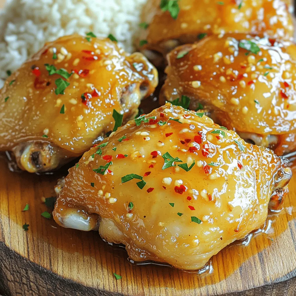 ![For this recipe, you need 4 bone-in, skin-on chicken thighs. These thighs give great flavor and keep the meat juicy. The sauce is simple yet tasty. Here’s what you need: - 1/4 cup honey: This adds sweetness. - 4 cloves garlic, minced: Fresh garlic adds depth. - 2 tablespoons soy sauce: This brings savory notes. Use tamari for a gluten-free option. - 1 tablespoon apple cider vinegar: This adds a nice tang. - 2 tablespoons olive oil: This helps to cook the chicken. - Salt and pepper to taste: These enhance all the flavors. You can kick it up a notch with these: - 1 teaspoon red pepper flakes: This adds some heat, if you like it spicy. - Fresh parsley, chopped: Use this as a garnish for a fresh touch. For the full recipe, check out the detailed instructions to make your Honey Garlic Skillet Chicken Thighs shine. First, take your chicken thighs and pat them dry. This will help the skin get crispy. Next, season both sides with salt and pepper. Use just enough to enhance the flavor. Set the thighs aside while you prepare the sauce. Heat olive oil in a large skillet over medium-high heat. Once the oil is hot, add the chicken thighs skin-side down. Cook them for about 7-8 minutes. Don’t move them around; let the skin get golden and crispy. After that, flip the thighs over and cook for 5 more minutes. This will brown the other side nicely. Now it’s time for the star of the show: the honey garlic sauce. In a bowl, mix honey, minced garlic, soy sauce, apple cider vinegar, and red pepper flakes if you want some heat. Pour this sauce over the chicken in the skillet. Reduce the heat to medium-low. Let the sauce bubble and coat the chicken. Cook for another 5-7 minutes. The chicken should reach an internal temperature of 165°F (75°C). Once done, remove the skillet from heat. Let the chicken rest for a few minutes before serving. This helps the flavors blend nicely. For a pop of color, garnish with chopped parsley. For the full recipe, check the earlier section. To get crispy skin on your chicken thighs, start with dry skin. Pat them dry with paper towels before seasoning. This helps the skin crisp up nicely when it cooks. Use medium-high heat in your skillet. Don't flip the chicken too soon; let it cook for 7-8 minutes. This will give the skin time to brown and get crispy. To check if your chicken is done, use a meat thermometer. Insert it into the thickest part of the thigh. It should read 165°F (75°C) for safe eating. If you don’t have a thermometer, cut into the chicken. The juices should run clear, not pink. Always ensure it is fully cooked for your safety. For a richer flavor, let the sauce simmer a bit longer. After you pour it over the chicken, allow it to bubble. Stir it occasionally to coat the chicken evenly. Add a splash more soy sauce or a pinch of salt if you like it saltier. For a kick, mix in red pepper flakes or a dash of hot sauce. This will elevate the taste and make every bite burst with flavor. Don't forget to check the [Full Recipe] for the perfect balance of honey and garlic! {{image_2}} You can switch chicken thighs for other proteins. Chicken breasts work well, too. They cook faster, so check for doneness sooner. If you want a twist, try pork chops or salmon. Both soak up the honey garlic flavor nicely. Just adjust the cooking time based on the protein you choose. To change the heat in your dish, add or remove red pepper flakes. If you prefer mild, skip the flakes entirely. For more heat, add extra flakes or a dash of hot sauce. You can also use fresh chili peppers for a bold kick. Make it your own based on your taste! Adding veggies boosts flavor and nutrition. Try bell peppers, broccoli, or snap peas. Chop them into bite-sized pieces for even cooking. Add them to the skillet alongside the chicken. They will soak up the honey garlic sauce as they cook. This makes a colorful and healthy meal. For more tips on cooking, check the Full Recipe. After making Honey Garlic Skillet Chicken Thighs, let your chicken cool down. Store it in an airtight container. This helps keep the chicken fresh. It lasts in the fridge for up to four days. Always place a piece of parchment paper between layers if stacking. This keeps the skin crispy. You can freeze the chicken for later meals. First, allow it to cool completely. Wrap each thigh tightly in plastic wrap. Then, place them in a freezer bag. Remove as much air as possible. Honey garlic chicken will stay good in the freezer for about three months. Label the bag with the date, so you know when to use it. When it's time to reheat, choose the oven over the microwave. Preheat your oven to 350°F (175°C). Place the chicken on a baking sheet. Cover it with foil to keep moisture in. Heat for about 15-20 minutes until warmed through. You can brush a little honey garlic sauce on top for extra flavor. This method keeps the chicken juicy and the skin crispy. Yes, you can use chicken breasts. They cook faster than thighs. Adjust cooking time to 5-7 minutes per side. Keep an eye on them. Chicken breasts can dry out if overcooked. Thighs stay juicy, thanks to their fat content. If you prefer a tender, flavorful dish, stick with thighs. I love serving these chicken thighs with steamed rice or sautéed veggies. The rice soaks up the sweet sauce well. You can also try roasted potatoes or a fresh salad. For a crunchy touch, add some toasted nuts to your salad. Pairing these sides makes for a balanced meal. Making honey garlic sauce is simple and fast. Mix honey, minced garlic, soy sauce, and apple cider vinegar together. Add a pinch of red pepper flakes for heat if you like. Whisk until smooth. Pour it over the chicken while cooking. This sauce adds a sweet and savory kick to your dish. For the full recipe, check out the Honey Garlic Skillet Chicken Thighs. This blog post covered the key elements for making honey garlic chicken thighs. We discussed the right chicken amount and the sweet and savory sauce. You learned how to prepare the chicken and c