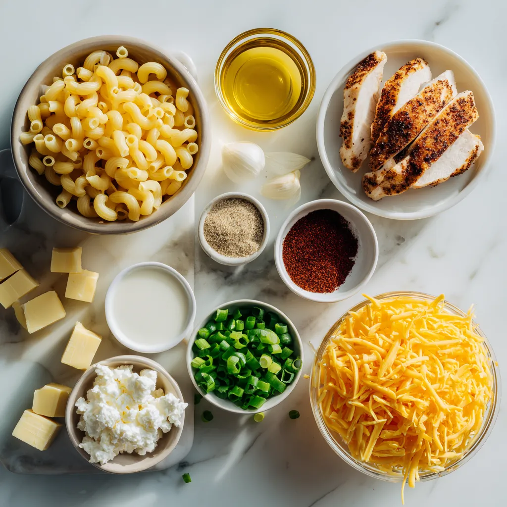 When making Honey Pepper Chicken Mac and Cheese, start with the main ingredients. Elbow macaroni gives a nice bite to the dish. I use one pound of diced chicken breast for protein and flavor. Three cups of shredded sharp cheddar cheese create a rich, creamy sauce that ties everything together.