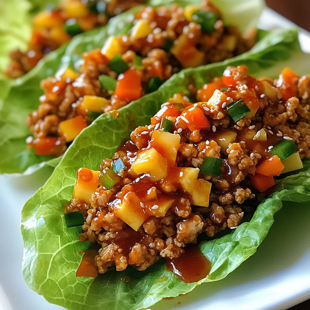 A delicious and spicy chicken mixture served in fresh lettuce leaves, perfect for a light meal or appetizer.
