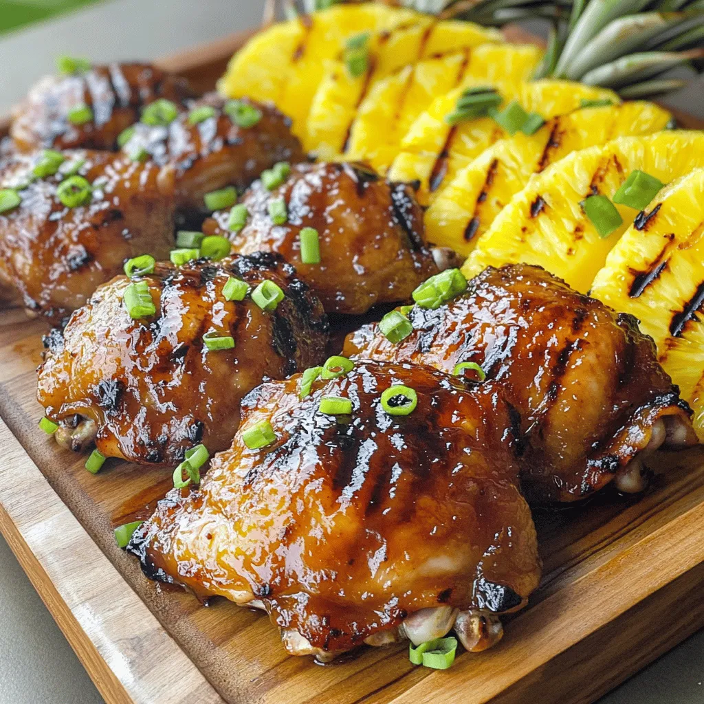 When you’re ready to grill, preheat your grill to medium-high heat, around 375°F. Remove the chicken from the marinade and let the excess drip off. Save the marinade for basting later. Grill the chicken thighs for about 6-7 minutes on one side. Flip them over, then baste with the reserved marinade. Grill for another 5-6 minutes, or until fully cooked. For added fun, grill pineapple slices during the last few minutes. Once cooked, let the chicken rest for 5 minutes before slicing. This resting time keeps it juicy.
