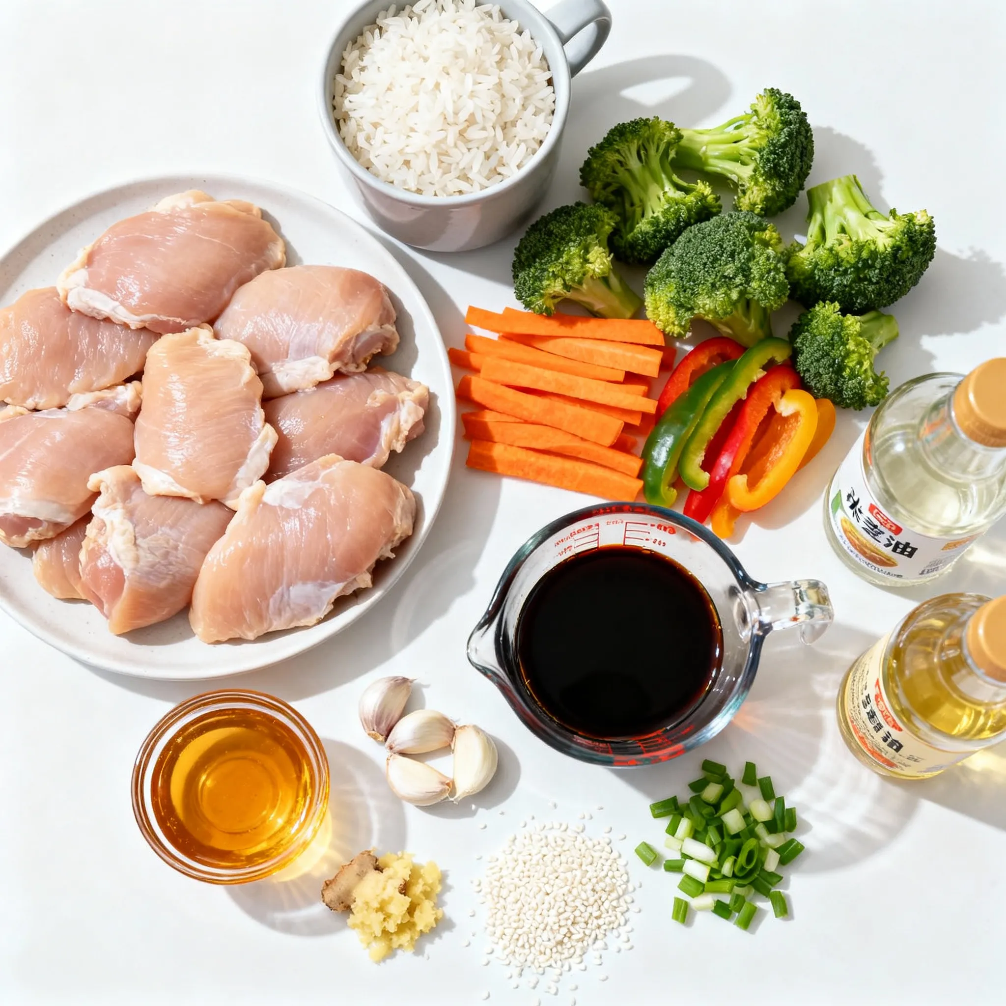 A delicious and easy one-pot meal featuring tender chicken thighs, jasmine rice, and vibrant vegetables, all coated in a sweet and savory teriyaki sauce.