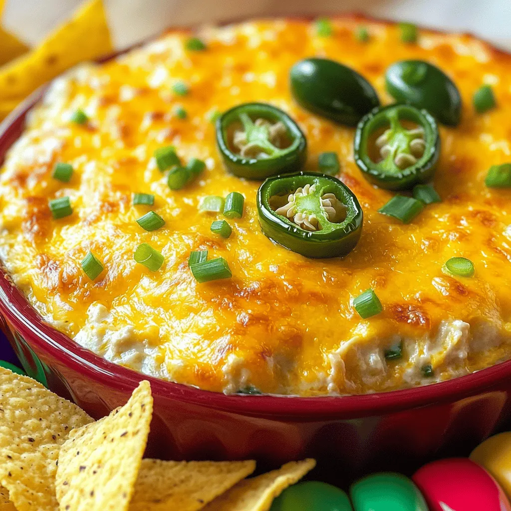 When serving, I like to use tortilla chips. They add a nice crunch. For a pop of color, I garnish with sliced green onions. A few whole jalapeños on top look nice too. I also suggest using a vibrant dish to hold the dip.Enjoy the creamy goodness with friends!