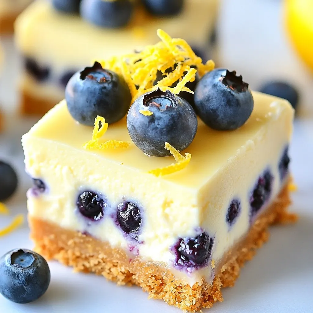 Serve the cheesecake bars chilled, garnished with a sprinkle of additional lemon zest and a few fresh blueberries on top for an appealing touch.