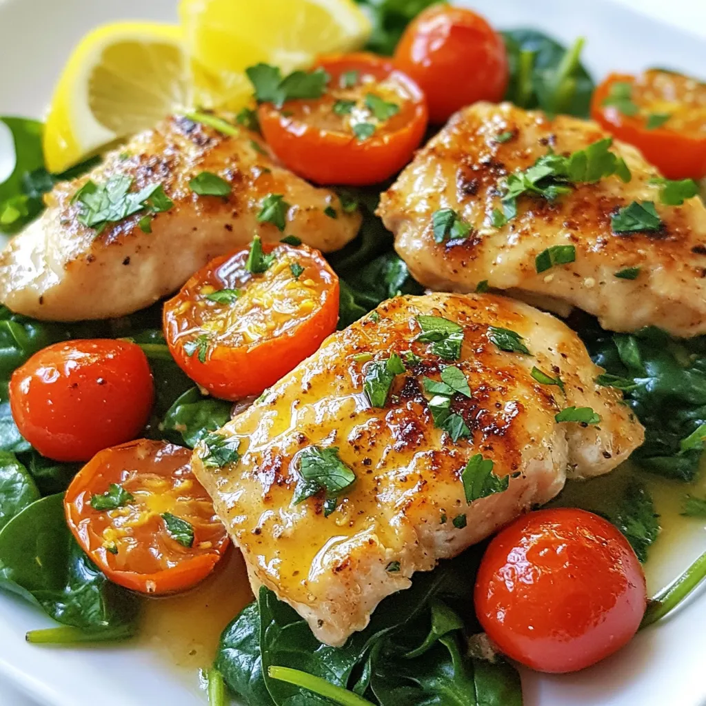 For plating, use a large white plate to show off the dish. Place the chicken in the center, then spoon the lemon garlic sauce over it. Add the cherry tomatoes and spinach around the chicken. This creates a colorful dish. Garnish with fresh parsley for a pop of green. This makes your meal look as good as it tastes!