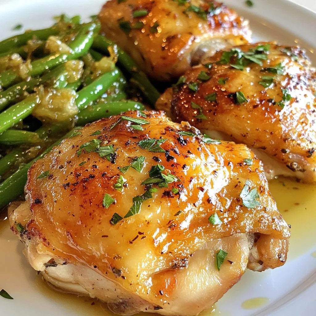 Once the chicken is done, remove it from the oven and let it rest for a few minutes. Serve the chicken thighs on a plate with a side of sautéed green beans. Garnish with chopped parsley for a pop of color.