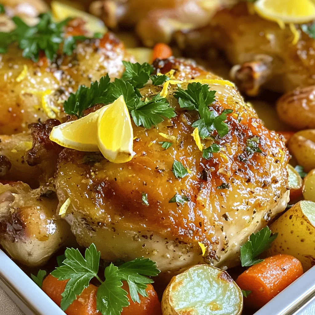 ![- 1 whole chicken (about 4-5 pounds) - 4 cloves of garlic, minced - 2 lemons (zested and juiced) - 1/4 cup olive oil - 2 teaspoons dried thyme - 1 teaspoon dried rosemary - Salt and pepper to taste - Fresh parsley for garnish - Vegetables for roasting (such as carrots, potatoes, and onions) When you pick your chicken, choose one that is fresh and plump. Look for a whole chicken weighing between 4 to 5 pounds for the best flavor. This size ensures even cooking and juicy meat. Next, let’s talk about garlic. You will need four cloves. Mince the garlic finely to release its full flavor. Fresh garlic gives a great taste and aroma to the dish. Now, prepare your lemons. You need two lemons. First, zest them to get the bright, flavorful skin. Then, cut them in half and juice them. The juice adds a tangy kick that balances the chicken's richness. For herbs, grab dried thyme and rosemary. These two herbs add depth to your chicken. Use two teaspoons of thyme and one teaspoon of rosemary. Adjust amounts to fit your taste! Lastly, think about your vegetables. Carrots, potatoes, and onions all roast well. Chop them into bite-sized pieces. They soak up the chicken's juices as they cook, making each bite a delight. This selection of ingredients makes your Lemon Garlic Roasted Chicken flavorful and inviting. For the complete process, check the Full Recipe. To start, preheat your oven to 425°F (220°C). This high heat helps the skin become nice and crispy. Next, take your whole chicken and pat it dry with paper towels. Dry skin crisps up better in the oven. Now, let’s make the marinade. In a bowl, mix together four minced garlic cloves, the zest and juice of two lemons, 1/4 cup of olive oil, 2 teaspoons of dried thyme, 1 teaspoon of dried rosemary, salt, and pepper. Stir until everything blends well. This mixture gives the chicken a fresh and zesty flavor. Place your chicken in a large bowl or roasting pan. Pour the marinade over it, making sure to get it under the skin and inside the cavity. For best flavor, let the chicken marinate in the fridge for at least 1 hour. If you have more time, let it sit overnight. This helps the flavors soak in deeply. While the chicken marinates, select your vegetables. Good options include carrots, potatoes, and onions. Chop them into bite-sized pieces. Place them in the bottom of the roasting pan. Drizzle with olive oil, salt, and pepper. Toss them to coat evenly. This will make your veggies tasty and help them cook well. Now it’s time to roast. After marinating, set the chicken on top of the vegetables in the pan. Tie the legs together with kitchen twine and tuck the wing tips under the chicken. Roast in the preheated oven for about 1 hour and 15 minutes. To check for doneness, the chicken's internal temperature should reach 165°F (75°C). The juices should run clear when you pierce the chicken. Once cooked, remove the chicken from the oven. Let it rest for 10 to 15 minutes. Resting helps the juices spread throughout the meat, making it juicy. When ready to serve, carve the chicken. Arrange it on a platter with the roasted vegetables. For a fresh touch, sprinkle finely chopped parsley on top. You can find the Full Recipe to guide you through each step. To get that crispy skin, start with a dry chicken. Pat it dry using paper towels. This removes extra moisture, helping the skin crisp. Next, use high heat. Roasting at 425°F (220°C) gives the skin a nice brown color. Apply oil generously, as it helps in browning. Here’s a trick: rub olive oil under the skin too. This adds flavor and moisture inside. To boost flavor, use fresh herbs. Thyme and rosemary work great together. You can also add sage for a unique taste. If you like a bit of heat, try crushed red pepper. A touch of paprika adds color and flavor too. Mix your herbs with garlic for a fragrant blend. Don't forget the salt and pepper; they bring out the chicken’s taste. If your chicken is undercooked, don’t panic. Check the thickest part of the thigh. If it’s below 165°F (75°C), return it to the oven. Cook in 5-minute bursts. Always check the temperature with a meat thermometer. To avoid dry meat, make sure you rest the chicken after cooking. This helps juices spread back into the meat. Cover it lightly with foil during the rest. This keeps it warm without steaming it. For a complete experience, don’t miss the Full Recipe to enhance your cooking journey! {{image_2}} You can enjoy Lemon Garlic Roasted Chicken in many ways. Grilling adds a smoky flavor. Simply marinate the chicken as usual. Preheat your grill to medium-high. Cook the chicken for about 1.5 hours, turning occasionally. Using a slow cooker is another great option. After marinating, place the chicken in the slow cooker. Set it on low for 6-8 hours or high for 4 hours. The chicken will be very tender and full of flavor. Feel free to mix things up with herbs. Try fresh basil or dill instead of thyme and rosemary. You can also use lime or orange instead of lemon for a different taste. For a vegan or vegetarian twist, replace chicken with a whole cauliflower. Use the same marinade and roast until tender. This adaptation gives you great flavor while keeping it plant-based. If you want the full recipe, check out the [Full Recipe]. To store leftover chicken, let it cool first. Place it in an airtight container. This keeps it fresh. You can store it for up to four days in the fridge. If you want to keep it longer, consider freezing it. Store the chicken in freezer bags. Remove as much air as possible. Frozen chicken can last up to three months. To reheat your chicken without drying it out, use the oven. Preheat your oven to 350°F (175°C). Place the chicken in a baking dish, adding a splash of broth or water. Cover it with foil. Heat for about 20-25 minutes or until warm. You can also use a microwave, but cover it to keep moisture. For leftovers, try making a chicken salad or add it to pasta. You can shred it for sandwiches or tacos, too! 