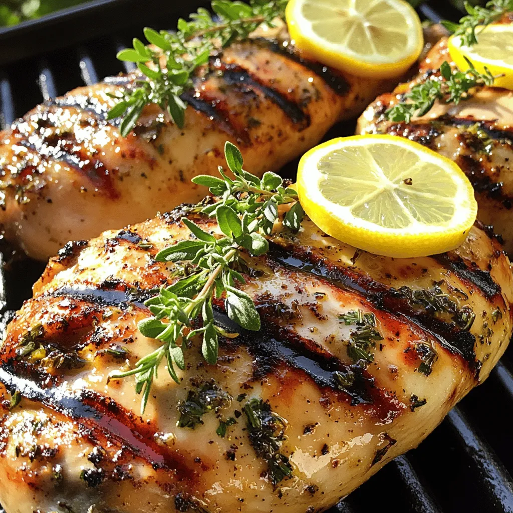 - Chicken: 4 boneless, skinless chicken breasts - Marinade: 1/4 cup olive oil, 2 lemons (juice and zest), 4 cloves garlic, minced - Fresh Herbs: 1 tablespoon each of rosemary, thyme, and parsley - Seasoning: Salt and pepper to taste - Garnish: Lemon slices and herb sprigs When I make Lemon Herb Grilled Chicken, I love using fresh ingredients. They make a big difference in taste. I choose boneless, skinless chicken breasts. They cook evenly and stay juicy. The marinade is the key. It blends olive oil, lemon juice, zest, garlic, and herbs. This mix makes the chicken flavorful. I prefer using fresh herbs like rosemary, thyme, and parsley. They add bright flavors to the dish. It is so easy to chop them up. You can use dried herbs, but fresh ones give a better taste. Don't forget the salt and pepper! They enhance the flavors of the chicken. I suggest using a good quality olive oil. It adds richness to the marinade. For a beautiful finish, I like to garnish the chicken with lemon slices and herb sprigs. It makes the plate look lovely and inviting. You can find the full recipe above. It covers everything you need to know for this dish. Enjoy cooking! To make the marinade, start by whisking together the following ingredients: - 1/4 cup olive oil - Juice and zest of 2 lemons - 4 cloves garlic, minced - 1 tablespoon fresh rosemary, finely chopped - 1 tablespoon fresh thyme, finely chopped - 1 tablespoon fresh parsley, finely chopped - Salt and pepper to taste Whisk these ingredients in a bowl until they blend well. This mix brings a bright flavor to the chicken. Next, place the chicken breasts in a resealable plastic bag or a shallow dish. Pour the marinade over the chicken. Seal the bag or cover the dish and put it in the fridge. Let it marinate for at least 1 hour, but if you can, let it sit for up to 4 hours. This time helps the flavors soak in. Now, it’s time to grill! First, preheat your grill to medium-high heat. This step ensures the chicken cooks evenly. Take the chicken out of the marinade. Let any extra marinade drip off, then discard the marinade. Place the chicken on the hot grill. Cook it for about 6-8 minutes on each side. You want the chicken to reach an internal temperature of 165°F (74°C). Look for nice grill marks, too. After grilling, take the chicken off the grill. Let it rest for a few minutes. This step keeps it juicy. For a beautiful presentation, slice the chicken and arrange it on a platter. Add some fresh lemon slices and herb sprigs as garnishes. These small touches make your dish pop visually. For the complete recipe, check the [Full Recipe]. How long should I marinate the chicken? Marinate the chicken for at least 1 hour. For the best flavor, aim for 4 hours. Longer marinating lets the herbs and lemon soak in. This makes each bite full of taste. What temperature is best for marinating? Always marinate in the fridge. Keeping chicken cold prevents bacteria growth. Room temperature is not safe. How do I maintain grill temperature? Preheat your grill to medium-high heat. This gives a nice sear. Keep the lid closed while cooking to hold the heat. You want a steady temperature for even cooking. How do I ensure juiciness in chicken breasts? Let the chicken rest after grilling. This keeps the juices inside. Cutting right away makes juices spill out. What additional spices can I use? Try adding paprika or cumin for a warm flavor. You can also use a pinch of red pepper flakes for a kick. These spices add depth to the marinade. Can I use different meats? Yes, you can use pork or turkey. Just adjust the cooking time. Chicken is great, but other meats can also shine with this marinade. For the full recipe, check out my Lemon Herb Grilled Chicken section! {{image_2}} You can change the taste of the chicken by using different herbs. Try substituting rosemary or thyme with basil or cilantro. Each herb brings its own flavor. For example, basil adds a sweet note, while cilantro gives a fresh taste. You can also mix different herbs. Combining rosemary, thyme, and parsley creates a rich flavor. Feel free to get creative! The more herbs you try, the more unique your dish will be. Think about adding fruit-based marinades for a twist. You can use orange juice or peach puree. These fruits add sweetness and a new flavor profile. If you like heat, add spices or peppers. A pinch of red pepper flakes can bring warmth. You can also use jalapeños for a spicy kick. Adjust the heat based on your taste. You can make this dish even if you don’t have a grill. Baking the chicken in the oven is an easy option. Preheat your oven to 400°F (200°C). Place the marinated chicken on a baking tray. Bake for about 25-30 minutes. Make sure to check that it reaches 165°F (74°C). Stovetop cooking is another great choice. Heat a pan with some olive oil over medium heat. Cook the chicken for about 6-8 minutes on each side. This method helps keep the chicken juicy and flavorful. For the full recipe, refer to the section above. To keep your leftover Lemon Herb Grilled Chicken fresh, store it properly. Place the chicken in an airtight container. You can also wrap it tightly in plastic wrap or aluminum foil. Make sure the chicken cools down first. This way, it won't create steam inside the container. Leftovers stay good in the fridge for about 3 to 4 days. If you plan to eat them later, consider freezing them. Freezing grilled chicken is easy. First, let the chicken cool completely. Then, place it in a freezer-safe bag or container. Remove as much air as possible before sealing it. Label the bag with the date. This helps you keep track of how long it’s been frozen. You can freeze the chicken for up to 3 months. When you’re ready to eat it, thaw it in the fridge overnight. Reheat it in the oven or on the stovetop for best results. To check if your chicken has gone bad, look for a few signs. If it smells sour or off, it’s time to toss it. Also, check for a change in color. Fresh chicken should look pink, whi