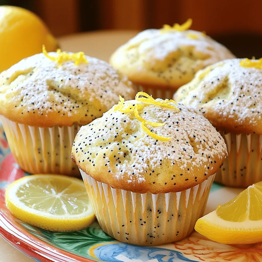 ![To make lemon poppy seed muffins, you need these simple ingredients: - 1 ½ cups all-purpose flour - ½ cup granulated sugar - 2 teaspoons baking powder - ½ teaspoon baking soda - ¼ teaspoon salt - Zest of 2 lemons - ½ cup Greek yogurt - ½ cup milk - 1 large egg - ¼ cup vegetable oil - 2 tablespoons poppy seeds - 1 teaspoon vanilla extract - 2 tablespoons lemon juice These ingredients mix to create a moist and flavorful treat. The lemon zest gives a bright taste, while the poppy seeds add a fun crunch. Greek yogurt helps keep the muffins soft and fluffy. You can easily change some ingredients based on your needs: - Gluten-free options: Use gluten-free flour for a great alternative. - Dairy-free options: Replace Greek yogurt with a dairy-free yogurt. Almond or coconut milk works well in place of regular milk. - Sugar substitutes: If you want less sugar, try using honey or agave syrup. Feel free to mix and match these alternatives. This makes the recipe flexible and fun! If you want to dive deeper into the complete recipe, check the Full Recipe section for all the details. 1. Preheating and muffin tin preparation Start by preheating your oven to 350°F (175°C). This ensures even baking. Next, line your muffin tin with paper liners or grease it lightly with cooking spray. This will help the muffins release easily after baking. 2. Mixing dry and wet ingredients In a large bowl, whisk together the dry ingredients. Combine 1 ½ cups of all-purpose flour, ½ cup of granulated sugar, 2 teaspoons of baking powder, ½ teaspoon of baking soda, ¼ teaspoon of salt, and the zest of 2 lemons. In another bowl, mix ½ cup of Greek yogurt, ½ cup of milk, 1 large egg, ¼ cup of vegetable oil, 1 teaspoon of vanilla extract, and 2 tablespoons of lemon juice until smooth. 1. Combining ingredients and folding Pour the wet ingredients into the bowl with the dry ingredients. Gently fold them together until just combined. Do not overmix, as this can make the muffins tough. Finally, add 2 tablespoons of poppy seeds and fold them in gently. 2. Baking time and checking doneness Divide the batter evenly among the muffin cups, filling each about ⅔ full. Bake for 18-20 minutes, or until a toothpick inserted in the center comes out clean. Keep an eye on them to avoid overbaking. 1. Cooling the muffins Once baked, let the muffins cool in the pan for 5 minutes. Then, transfer them to a wire rack to cool completely. This helps prevent sogginess. 2. Final presentation tips For a lovely presentation, serve the muffins on a bright platter. Dust them lightly with powdered sugar for a sweet touch. You can also add a slice of lemon on the side for an extra zesty flair. For a complete recipe, check out the Full Recipe section. Enjoy your baking! To ensure your muffins rise perfectly, measure your ingredients carefully. Use a kitchen scale for precision. Make sure your baking powder and baking soda are fresh. Double-check the expiration dates. Mix the dry and wet ingredients separately before combining them. This helps evenly distribute the leavening agents. Avoid common mistakes by not overmixing the batter. Stir just until the dry ingredients are moistened. Overmixing makes the muffins tough. Also, fill the muffin cups only two-thirds full. This allows enough space for the muffins to rise without overflowing. You can add nuts or fruits to boost flavor. Chopped walnuts or almonds add crunch. Fresh or frozen blueberries complement lemon well. You can also use different citrus flavors like lime or orange for a twist. Just replace the lemon juice with your chosen citrus juice. To achieve a moist texture, use Greek yogurt in your batter. It adds creaminess and keeps the muffins soft. You can also try adding an extra tablespoon of lemon juice for more flavor and moisture. For storing tips, let the muffins cool completely. Place them in an airtight container to keep them fresh. If you want to store them longer, consider freezing. Just wrap them well in plastic wrap. Enjoy these tips as you make your lemon poppy seed muffins! For the full recipe, see above. {{image_2}} You can switch up flavors with your lemon poppy seed muffins. Here are two ideas: - Blueberry Lemon Poppy Seed Muffins: Add 1 cup of fresh or frozen blueberries to the batter. This adds a sweet burst of flavor and a nice color. The blueberries pair well with lemon and poppy seeds. - Almond Lemon Poppy Seed Muffins: Substitute half of the vanilla extract for almond extract. This gives a nutty taste that blends beautifully with lemon. You can also add sliced almonds on top for extra crunch. If you need to meet specific dietary needs, you can make your muffins in different ways: - Vegan Lemon Poppy Seed Muffins: Use flax eggs instead of a regular egg. Mix 1 tablespoon of ground flaxseed with 2.5 tablespoons of water. Let it sit for five minutes to thicken. Replace Greek yogurt with a plant-based yogurt and use almond milk instead of regular milk. - Low-carb alternatives: For a low-carb version, swap all-purpose flour with almond flour or coconut flour. Use a sugar substitute like erythritol or stevia to keep sweetness without the carbs. You can also adapt your muffins to the seasons: - Using seasonal fruits: In summer, try adding fresh strawberries or raspberries. In fall, mix in chopped apples or pears for a cozy twist. - Holiday-themed variations: During the winter holidays, add cinnamon or nutmeg to the batter. This gives a warm, festive flavor. You can also decorate with icing or festive sprinkles for a holiday look. For the full recipe, check the [Full Recipe]. To keep your lemon poppy seed muffins fresh, store them properly. If you plan to eat them within a few days, keep them at room temperature. Use an airtight container to protect them from air and moisture. - Room temperature storage: Place muffins in a container, and keep them away from sunlight. They stay fresh for about two to three days. - Refrigeration tips: If you want to keep them longer, store t