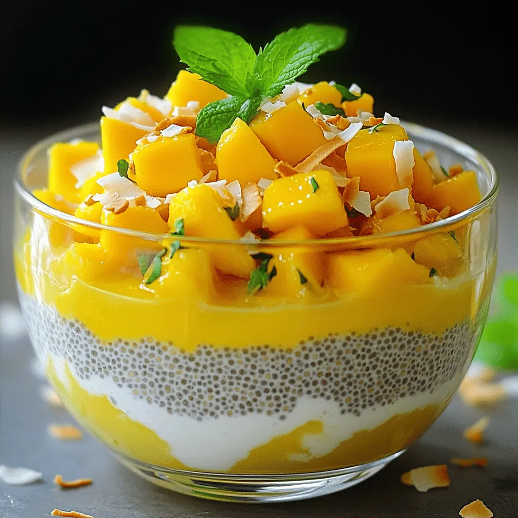 2. Garnish effectively to enhance the look. Sprinkle toasted coconut flakes on top for crunch. If you like, add fresh mint leaves for a pop of color and a hint of freshness. This not only adds flavor but also makes your dish stand out.Enjoy making this Mango Coconut Chia Pudding!