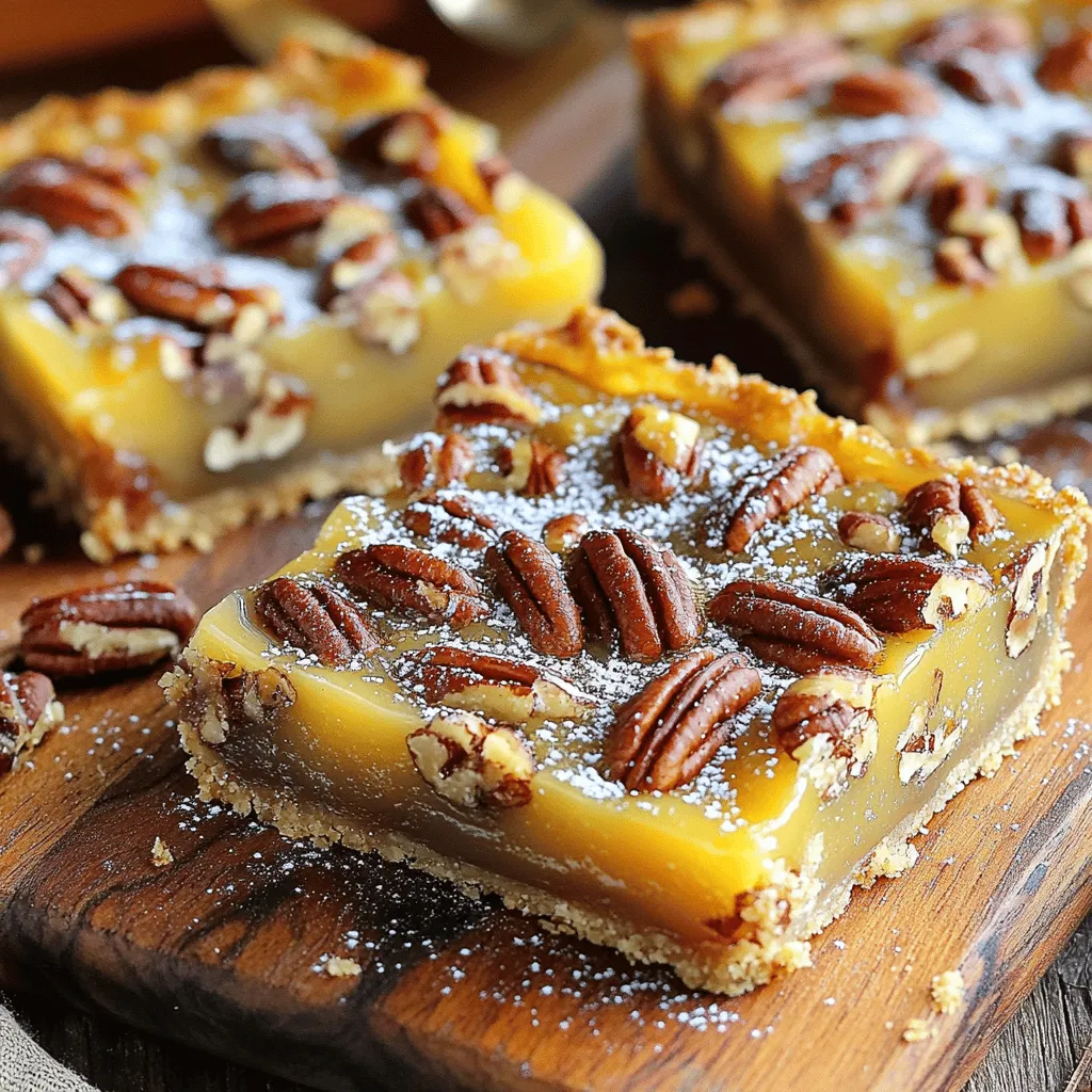 ![To make the best maple pecan pie bars, you need simple, fresh ingredients. Here they are: - 1 ½ cups all-purpose flour - ½ cup unsalted butter, melted - ½ cup brown sugar - ¼ teaspoon salt - 1 cup pecans, roughly chopped - 1 cup pure maple syrup - 2 large eggs - 1 teaspoon vanilla extract - ½ teaspoon cinnamon - ¼ teaspoon nutmeg - ¼ teaspoon salt Each ingredient plays a key role in the flavor and texture of the bars. The flour gives the crust its structure. The butter adds richness, while brown sugar brings sweetness and a hint of caramel flavor. Pecans give a nice crunch, and maple syrup is the star that ties it all together. These bars are not just tasty; they also offer some nutrition. Each bar contains: - Calories: About 200 - Protein: 3 grams - Carbohydrates: 25 grams - Fat: 10 grams - Fiber: 1 gram - Sugar: 12 grams While they are a dessert, you still enjoy some benefits from the nuts and maple syrup. If you run out of an ingredient or want to change things up, there are easy swaps. Here are some ideas: - For gluten-free bars, use almond flour or a gluten-free blend instead of all-purpose flour. - Swap the butter for coconut oil to make it dairy-free. - Use honey or agave syrup in place of maple syrup for a different flavor. - You can also try other nuts like walnuts or almonds if you prefer. These substitutions can help you cater to dietary needs or personal taste while keeping the essence of the recipe. For the complete recipe, check the [Full Recipe]. To start, gather all your ingredients. You will need the following: - 1 ½ cups all-purpose flour - ½ cup unsalted butter, melted - ½ cup brown sugar - ¼ teaspoon salt - 1 cup pecans, roughly chopped - 1 cup pure maple syrup - 2 large eggs - 1 teaspoon vanilla extract - ½ teaspoon cinnamon - ¼ teaspoon nutmeg - ¼ teaspoon salt This recipe is simple and quick, taking about 15 minutes to prep. Make sure to preheat your oven to 350°F (175°C) before you begin. 1. Make the Crust: In a bowl, mix flour, melted butter, brown sugar, and salt. Stir until it looks crumbly. Press this mix into the bottom of your lined dish. Use your fingers or a spatula to make it even. 2. Bake the Crust: Place the dish in the oven. Bake for 15-20 minutes until it turns a light brown. Take it out and let it cool for a bit. 3. Prepare the Filling: In another bowl, whisk together the maple syrup, eggs, vanilla extract, cinnamon, nutmeg, and salt. Make sure it is mixed well. 4. Add the Pecans: Fold the chopped pecans into the maple mix. Make sure they are all coated. 5. Assemble the Bars: Pour the pecan mixture over your crust. Spread it evenly across the top. 6. Bake Again: Put the dish back into the oven. Bake for 25-30 minutes until the filling is set. It will puff up slightly as it bakes. 7. Cool and Cut: Let the bars cool for at least 1 hour. Use the parchment paper to lift the bars out of the dish. Place them on a cutting board and cut into squares. 8. Serve: Enjoy your Maple Pecan Pie Bars at room temperature. They taste great with a sprinkle of powdered sugar or a scoop of ice cream. As you bake, it helps to visualize each step. You can take photos of your crust before and after baking. Capture the filling before it goes into the oven. This way, you can see how well your bars come together. Check out the [Full Recipe] for step-by-step images that will help guide you through the process. These visuals make baking fun and easy! Start with cold butter. Cold butter helps the crust stay flaky. Mix the flour, melted butter, brown sugar, and salt well. Press it firmly into the baking dish. This prevents the crust from crumbling. Bake until light brown. This step is key for texture. Use fresh eggs for the filling. Whisk them well with the maple syrup. This helps create a smooth mixture. Make sure to bake the bars until the filling is slightly puffed. It should jiggle a bit in the center. Letting it cool will help it set more. Don’t skip lining the baking dish. It makes removal easy and clean. Avoid overmixing the filling. This can make it tough. Watch the baking time closely; every oven is different. If you bake too long, the filling can dry out. Enjoy making these bars with care! For the full recipe, check out the details above. {{image_2}} You can easily add chocolate to your Maple Pecan Pie Bars. Simply mix in half a cup of chocolate chips with the pecans. Use dark or semi-sweet chocolate for a rich flavor. This twist creates a mix of sweet maple and deep chocolate. It makes each bite a delightful surprise. To make vegan Maple Pecan Pie Bars, swap the eggs for flax eggs. Mix one tablespoon of ground flaxseed with three tablespoons of water. Let it sit for five minutes until it thickens. Also, use coconut oil instead of butter. This change keeps the bars creamy and delicious without eggs or dairy. You can switch pecans for other nuts, too. Walnuts give a strong flavor, while almonds add crunch. Try macadamia nuts for a buttery taste. You can combine different nuts for a unique texture. Mix and match to find your favorite blend. Each nut brings its own charm to the bars. For more details, check out the Full Recipe! To keep your Maple Pecan Pie Bars fresh, store them in an airtight container. This will help prevent them from drying out. Place parchment paper between layers if you stack them. This keeps them from sticking together. Store them at room temperature for up to three days. If you need longer storage, consider freezing them. Freezing Maple Pecan Pie Bars is easy and effective. First, let the bars cool completely after baking. Then, cut them into squares. Wrap each square tightly in plastic wrap. Place the wrapped bars in a freezer-safe bag or container. They can last for up to three months in the freezer. When you’re ready to enjoy them, just thaw at room temperature. If your bars lose some of their charm, don’t worry! You can revive them. Simply warm them in the oven at 300°F (150°C) for about 10 minutes. This will bring back t