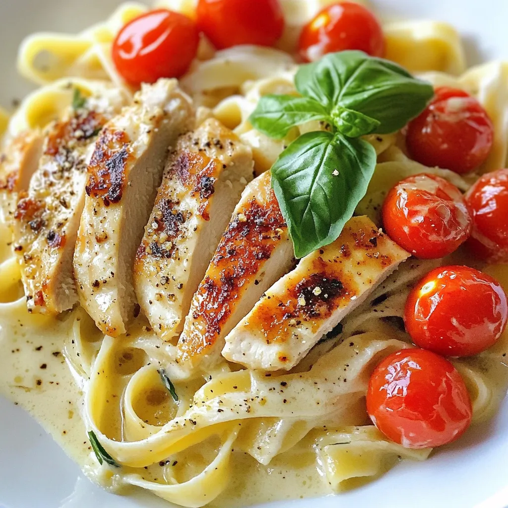 A creamy and flavorful pasta dish featuring chicken, tomatoes, and Parmesan cheese, perfect for a romantic dinner.