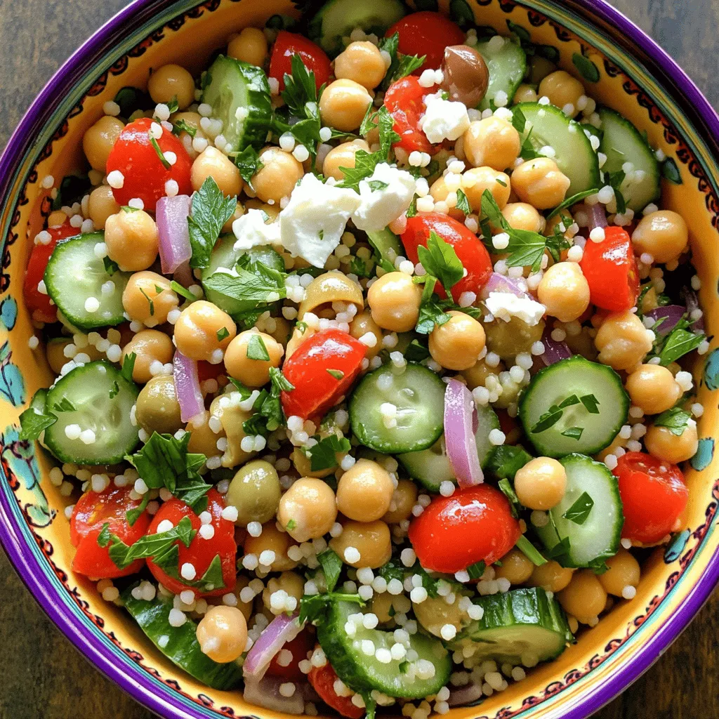 - 1 cup couscous - 1 1/4 cups vegetable broth - 1/2 cucumber, diced - 1 cup cherry tomatoes, halved - 1/4 red onion, finely chopped - 1/2 bell pepper, diced (red or yellow) - 1/2 cup canned chickpeas, rinsed and drained - 1/4 cup Kalamata olives, pitted and sliced - 1/4 cup fresh parsley, chopped - 1/4 cup fresh mint, chopped - 1/4 cup tahini - 2 tablespoons lemon juice - 2 tablespoons olive oil - Salt and pepper to taste Couscous is the star of this dish. It’s easy to cook and absorbs flavors well. Use vegetable broth for a nice base. The diced cucumber and cherry tomatoes add freshness. Red onion and bell pepper give crunch. Chickpeas bring protein and olives add a salty kick. Fresh herbs like parsley and mint make it bright. - Crumbled feta cheese for serving - Additional herbs for garnish Feta cheese gives a creamy touch. You can add other herbs like dill or basil if you want. These options can change the taste and appeal. - Medium saucepan - Mixing bowls - Whisk You will need a medium saucepan to cook the couscous. Mixing bowls help combine the salad. A whisk is perfect for making the tahini dressing. Having these tools ready makes cooking simple. Boiling the broth First, pour 1 1/4 cups of vegetable broth into a medium saucepan. Heat the broth on high until it boils. This step is key for fluffy couscous. Steeping the couscous Once the broth is boiling, remove it from heat. Stir in 1 cup of couscous. Cover the pot with a lid. Wait for about 5 minutes, so the couscous can absorb the broth. After that, fluff it with a fork. Let it cool a bit before mixing it into the salad. Dicing and chopping techniques While the couscous cools, grab your veggies. Dice 1/2 cucumber, halve 1 cup of cherry tomatoes, finely chop 1/4 red onion, and dice 1/2 bell pepper. You can use red or yellow peppers. Rinse and drain 1/2 cup of canned chickpeas, too. Lastly, chop 1/4 cup each of fresh parsley and mint. Combining the salad ingredients In a large mixing bowl, combine all the diced and chopped vegetables. Add in the chickpeas and olives. This mix brings a burst of color and flavor to the salad. Whisking the dressing In a small bowl, add 1/4 cup tahini, 2 tablespoons lemon juice, and 2 tablespoons olive oil. Whisk these ingredients together until smooth. This dressing adds a rich, nutty flavor. Adjusting consistency If the tahini mixture is too thick, add a little water. Keep whisking until it reaches your desired consistency. It should be creamy yet pourable. Tossing the salad Add the cooled couscous to the bowl of vegetables. Gently toss everything together. Make sure the couscous and veggies are well mixed. Adding seasoning Pour the tahini dressing over the salad. Toss again until everything is coated. Taste your salad and add salt, pepper, or more lemon juice as needed. If you like, sprinkle crumbled feta cheese on top before serving. Enjoy your vibrant Mediterranean Couscous Salad! - For a bright look, use a big bowl. - Drizzle more tahini on top before serving. - Add fresh herbs on top for extra color and flavor. - Store leftovers in a sealed container in the fridge. - Use the salad within three days for the best taste. - If it seems dry, add a splash of olive oil when serving. - Let the salad chill for at least an hour to blend flavors. - Marinate for up to four hours for a richer taste. - Keep it in the fridge to keep it fresh and cool. {{image_2}} You can change the grains in this salad. Try quinoa or farro instead of couscous. They add unique flavors and textures. You can also swap out vegetables. Use zucchini, bell peppers, or even roasted carrots. If you want more protein, replace chickpeas with black beans or lentils. To spice up your salad, add some red pepper flakes or smoked paprika. These give a nice kick. If you want to try different dressings, mix things up with a yogurt dressing or a balsamic vinaigrette. These add a fresh twist and make your dish stand out. For a vegan option, skip the feta cheese. The salad is already vegan-friendly without it. If you need a gluten-free choice, switch couscous for quinoa. Always check labels to ensure all ingredients are gluten-free. These small changes help everyone enjoy this tasty salad! - Each serving is about 1 cup. - Total calories per serving: around 250 calories. This salad is packed with vitamins and minerals. You get: - Vitamin C from tomatoes and peppers. - Fiber from couscous and chickpeas. - Iron from chickpeas and olives. - Healthy fats from tahini and olive oil. These nutrients support your immune system and promote digestion. The fiber keeps you full and satisfied. This salad contains common allergens: - Wheat from couscous. - Sesame from tahini. - Dairy if using feta cheese. If you have allergies, here are some swaps: - Use quinoa or rice for a gluten-free option. - Replace tahini with sun butter for a nut-free version. - Omit feta for a dairy-free meal. Couscous comes from North Africa. It is made from semolina wheat. There are three main types: Moroccan, Israeli, and Lebanese. Moroccan couscous is the smallest and cooks quickly. Israeli couscous, or pearl couscous, is bigger and chewier. Lebanese couscous is the largest and has a nutty flavor. All types are versatile and soak up flavors well. Yes, you can easily make this salad vegan. Simply replace the tahini with a nut butter for creaminess. Skip the feta cheese, or use a vegan cheese option. Ensure your vegetable broth is plant-based as well. This way, you keep all the great flavors without any animal products. To keep your salad fresh, store it in an airtight container. Place it in the fridge right after serving. If you have added tahini dressing, store it separately. This prevents the salad from getting soggy. This salad lasts about 3 to 4 days in the fridge. The vegetables will stay fresh, but the taste may change over time. If you notice any signs of spoilage, it’s best to toss it out. Absolutely! You can mix it up with different dressings. A simple olive oil and vinegar