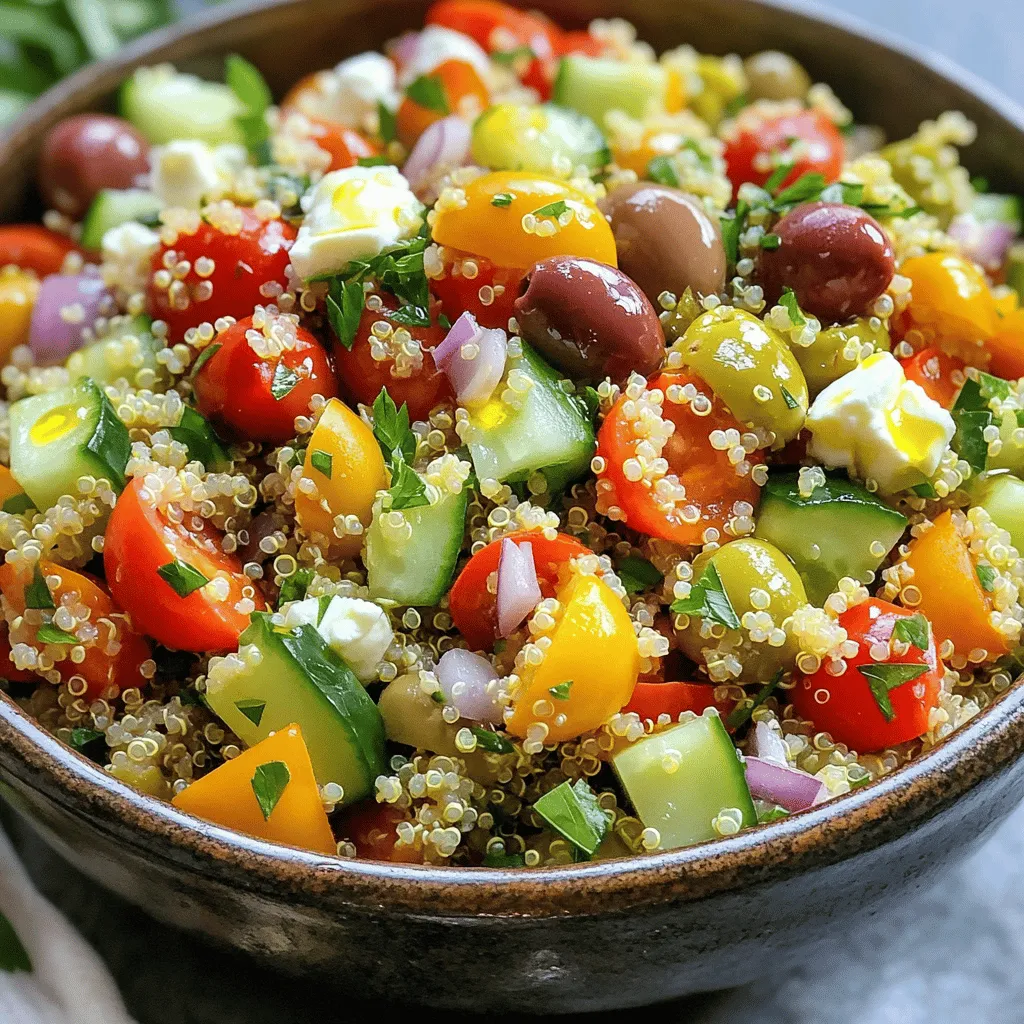 To make a tasty Mediterranean quinoa salad, you need fresh and simple ingredients. Here’s what you will need: - 1 cup quinoa, rinsed - 2 cups water or vegetable broth - 1 cucumber, diced - 1 red bell pepper, diced - 1 cup cherry tomatoes, halved - 1/2 red onion, finely chopped - 1 cup chickpeas, drained and rinsed - 1/2 cup Kalamata olives, pitted and sliced - 1/4 cup feta cheese, crumbled (optional) - 1/4 cup fresh parsley, chopped - 1/4 cup olive oil - 2 tablespoons lemon juice - 1 teaspoon dried oregano - Salt and pepper to taste These ingredients bring a mix of flavors and colors. Quinoa serves as a great base. It is high in protein and very filling. The veggies add crunch and freshness. Each ingredient works well together, creating a healthy and delicious meal. When you use fresh herbs like parsley, it brightens the dish. Kalamata olives and feta cheese bring a salty flavor that balances well with the lemon juice. The olive oil adds richness and helps bind everything together. Gathering these ingredients is easy. Most are available year-round. You can adjust the amounts based on your taste or what you have on hand. Once you have everything ready, you can follow the [Full Recipe] to create a delightful salad! To cook quinoa, start by boiling two cups of water or vegetable broth in a medium saucepan. Once it boils, add one cup of rinsed quinoa. Rinsing quinoa is key. It removes a bitter coating called saponin, which can ruin the taste. After adding the quinoa, reduce the heat to low. Cover the pot and let it simmer for about 15 minutes. You will know the quinoa is ready when all the liquid is absorbed. The grains will be fluffy. If you want a perfect texture, let it sit off the heat for a few minutes before fluffing it with a fork. While the quinoa cooks, you can prep the veggies. Start with the cucumber and bell pepper. Chop them into small, even pieces. For the cherry tomatoes, cut them in half. Dice the red onion finely. Use a sharp knife for clean cuts. This makes the salad look nice and helps flavors mix well. If you don't have a vegetable on the list, you can swap it out. Zucchini or avocado can add a fun twist. After the quinoa cools, it’s time to mix everything. In a large bowl, combine the quinoa, cucumber, bell pepper, cherry tomatoes, red onion, chickpeas, Kalamata olives, and parsley. If you want a creamy touch, add the feta cheese. For the dressing, whisk together olive oil, lemon juice, oregano, salt, and pepper in a small bowl until mixed well. This dressing brightens the flavors in your salad. Now, it’s time to toss the salad. Drizzle your dressing over the salad mix. Gently toss all the ingredients together. Make sure everything is coated with the dressing. Letting the salad sit for at least 15 minutes is important. This allows the flavors to meld together, enhancing the taste. You can serve it chilled or at room temperature. Enjoy your fresh Mediterranean quinoa salad! For the full recipe, check out the details above. To make the best Mediterranean quinoa salad, focus on ratios. Use one cup of quinoa for every quarter cup of dressing. This balance keeps the salad moist but not soggy. For seasoning, add salt to the quinoa while it cooks. This step enhances flavor from the start. Use fresh herbs like parsley for a brighter taste. Dried oregano adds a classic Mediterranean touch. A squeeze of lemon juice brightens up everything. This salad pairs well with grilled chicken or fish. It also complements a variety of dishes, such as stuffed peppers or roasted vegetables. When serving at events, create a buffet-style display. Guests can scoop their own portions. Offer extra toppings like feta or olives on the side. This way, everyone can customize their salad. Presentation matters! Use a large, shallow bowl for serving. This allows guests to see all the colorful layers. Drizzle some extra dressing on top for visual appeal. For garnishing, sprinkle some extra parsley or feta cheese. Add a few lemon wedges for that fresh touch. A well-presented salad makes it more appetizing and inviting. {{image_2}} You can switch out quinoa for other grains. Try bulgur, farro, or brown rice. Each grain adds its own flavor and texture. For chickpeas, white beans or lentils work well too. They offer similar protein and fiber benefits. If you want a dairy-free option for feta cheese, use tofu or avocado. Both options add creaminess without dairy. You can also skip the cheese altogether if you prefer a lighter salad. To boost the taste, add fresh herbs like mint or dill. They bring a bright flavor to the salad. You can also sprinkle in spices like cumin or smoked paprika. These spices add depth and warmth. For dressings, try balsamic vinegar or tahini. Both give a unique twist to the classic lemon-olive oil mix. You can even make a yogurt-based dressing for a creamy option. You can make this salad fit the season by changing the veggies. In summer, add sweet corn or bell peppers. For winter, try roasted root vegetables like carrots or beets. They warm up the dish and add great texture. Use seasonal fruits too! In the fall, apples or pears add a sweet crunch. In the spring, fresh peas or radishes can brighten the dish. This keeps your salad fresh and exciting all year long. For the full recipe, check out the Mediterranean Quinoa Salad. Enjoy experimenting! To keep your Mediterranean quinoa salad fresh, store it in an airtight container. Glass containers work great because they don’t stain or hold odors. You can also use BPA-free plastic containers. Make sure to cool the salad to room temperature before sealing it. This helps prevent moisture build-up. Your salad will stay fresh in the fridge for about 3 to 5 days. Always check for signs that it has gone bad. Look for any off smells, discoloration, or slimy textures. If you see any of these, it’s best to toss the salad. Yes, you can freeze quinoa salad! However, the texture may change after thawing. To freeze, place the salad in a freezer-
