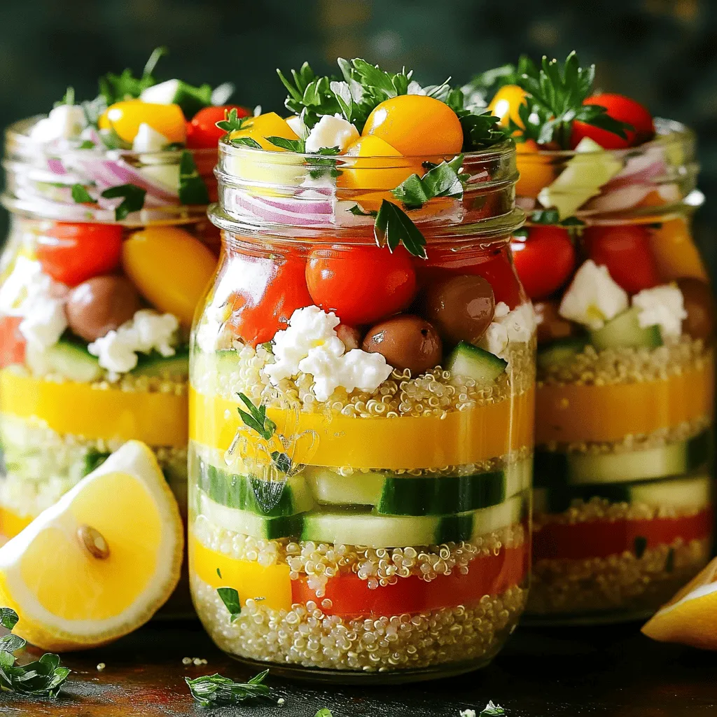 Layering is key for a great salad jar. Start with the quinoa mix at the bottom. This keeps moisture away from the toppings. Next, add the feta cheese. It adds flavor and looks nice. Follow with the chopped veggies. Keep the salad colorful by using red and yellow bell peppers. Finish with olives and parsley on top. This order keeps everything fresh.