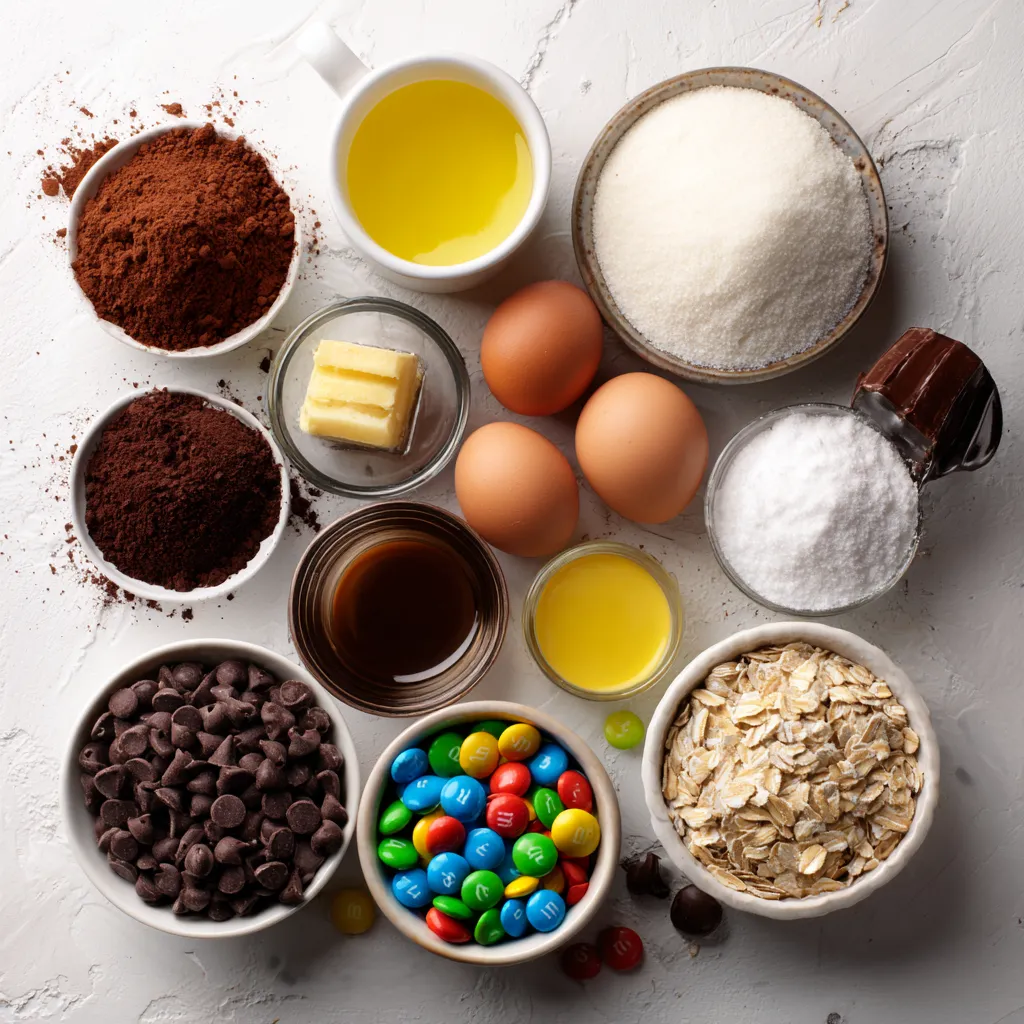 To make Monster Cookie Brownies, you need simple ingredients. Here is the list: