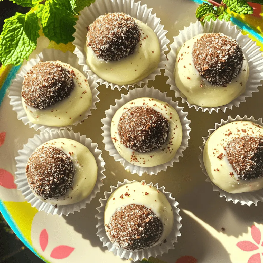 To make No Bake Cookies & Cream Truffle Balls, you need: - 1 cup crushed chocolate sandwich cookies (like Oreos) - 8 oz cream cheese, softened - 1 cup white chocolate chips - 1 tablespoon coconut oil - 1/2 teaspoon vanilla extract - Additional crushed cookies for coating If you need to adjust amounts, here are some handy conversions: - 1 cup = 8 ounces - 1 tablespoon = 3 teaspoons - 1/2 teaspoon = 2.5 milliliters For the best results, I recommend these brands: - Chocolate Sandwich Cookies: Oreo or generic brands work well. - Cream Cheese: Philadelphia cream cheese is a trusted choice. - White Chocolate Chips: Ghirardelli or Nestlé are great options. - Coconut Oil: Spectrum or Nutiva provide high-quality coconut oil. Using these ingredients will help you create a delicious and smooth truffle that everyone will love. First, gather your tools. You need a medium mixing bowl and a spatula. Take 1 cup of crushed chocolate sandwich cookies and add it to the bowl. Then, add 8 ounces of softened cream cheese. The cream cheese should be soft to mix well. Stir the mixture until it looks like dough. You want a smooth texture. If it feels too dry, add a bit more cream cheese. This dough should be easy to handle. Now, it’s time to shape the dough. Use your hands to roll the mixture into small balls. Aim for about 1 inch in diameter. This size makes them easy to pop in your mouth. Place the balls on a baking sheet lined with parchment paper. You should end up with 15 to 20 truffle balls. Make sure to give them some space. This helps them cool evenly. Next, chill the truffle balls. Put the baking sheet in the fridge for about 30 minutes. This helps them firm up. While they chill, prepare the coating. In a microwave-safe bowl, combine 1 cup of white chocolate chips and 1 tablespoon of coconut oil. Heat this in the microwave in 30-second blasts. Stir in between until it’s all melted and smooth. After chilling, take the truffle balls out of the fridge. Use a fork to dip each ball into the melted chocolate. Make sure each ball is fully coated. Let any extra chocolate drip off. Then, place them back on the baking sheet. While the chocolate is still wet, sprinkle crushed cookies over each ball for decoration. Finally, put the truffles back in the fridge for about 10 to 15 minutes. This sets the chocolate, and you’ll have tasty truffles ready to enjoy! To get that ideal texture, start with softened cream cheese. This helps mix well with the crushed cookies. Mix until you reach a dough-like consistency. If the mixture feels too dry, add a little more cream cheese. You want it to hold its shape but still feel soft. Rolling the dough into small balls helps them set nicely. When melting chocolate, use a microwave-safe bowl. Add your white chocolate chips and coconut oil. Heat in 30-second bursts. Stir after each burst to avoid burning. The chocolate should be smooth and glossy. If it feels too thick, a tiny bit more coconut oil can help. This keeps the chocolate from clumping when coating the truffles. For a fun presentation, use decorative plates. Arrange the truffle balls nicely. You can sprinkle extra crushed cookies on top for color. Mini cupcake liners add a nice touch. For an extra pop, add mint leaves around the truffles. This makes for a lovely display at any gathering! {{image_2}} You can mix things up with different cookie types. Try using peanut butter cookies for a nutty twist. Vanilla wafers give a lighter flavor. For a fun spin, use chocolate chip cookies. Each cookie type changes the taste and feel of your truffles. This way, you can have a new treat with every batch. Want a vegan version? Simply swap the cream cheese for a vegan alternative. Use dairy-free chocolate chips for the coating. Look for coconut cream or nut-based cream cheese. These changes keep the truffles creamy without dairy. It's easy to make them fit your diet. Add-ins enhance the taste and texture of your truffles. Consider mini chocolate chips for a richer bite. Chopped nuts add crunch and healthy fats. If you love coconut, try adding shredded coconut. You could also mix in some sea salt for a sweet and salty touch. These extras make your truffles unique and fun! To keep your truffle balls fresh, store them in an airtight container. Layer them with parchment paper to prevent sticking. Place the container in the fridge. They will stay fresh this way for up to one week. If you have a lot, consider dividing them into smaller containers. You can freeze your truffle balls if you want to save some for later. First, place them in a single layer on a baking sheet. Freeze for about an hour until firm. Once firm, transfer them to a freezer-safe bag or container. Be sure to remove any air. They can last for up to three months in the freezer. When you're ready to enjoy them, thaw in the fridge overnight. These truffle balls are best enjoyed within a week for optimal flavor. Check for any signs of spoilage, like off smells or changes in texture. If they look good, they should taste good! For the best experience, eat them cold right after they set. This way, the texture remains creamy and delicious. Yes, you can use many types of cookies. Try vanilla wafers or chocolate chip cookies. Each cookie brings a new taste. This lets you play with flavors. Just keep the cookie base similar in texture. It should still crush easily. To boost the chocolate flavor, add cocoa powder. Mix in a couple of tablespoons with your cookie dough. You can also use dark chocolate for the coating. Melt dark chocolate instead of white chocolate for a richer taste. Serve these truffles on a nice plate. Use mini cupcake liners for a fun touch. Garnish with extra crushed cookies or mint leaves. This adds color and style to your dish. Perfect for parties or family fun! You now have all the tools to make No Bake Cookies & Cream Truffle Balls. We covered ingredients, step-by-step directions, and helpful tips. Remember to experiment with flavors and storage options. Thi