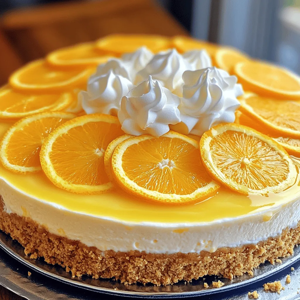 To create this delightful cheesecake, you need a few key ingredients. Here is what you will need: - 1 ½ cups graham cracker crumbs - ½ cup unsalted butter, melted - 2 cups cream cheese, softened - 1 cup powdered sugar - 1 cup heavy whipping cream - ½ cup orange juice (freshly squeezed if possible) - Zest of 1 orange - 1 teaspoon vanilla extract - Optional: Whipped cream and orange slices for garnish Each of these ingredients plays a special role. The graham cracker crumbs form a tasty crust. The cream cheese gives the cheesecake its rich and creamy texture. Fresh orange juice and zest add bright flavor, making each bite refreshing. Choosing the best ingredients can make a big difference. Here are my tips: - Cream Cheese: Look for full-fat cream cheese. It gives a creamy texture and rich taste. - Butter: Use unsalted butter for more control over the saltiness. - Orange Juice: Freshly squeezed orange juice tastes brighter than store-bought. - Whipping Cream: Choose heavy whipping cream. It whips better and gives a fluffier texture. Quality ingredients enhance the flavor and texture of your cheesecake, making it a true delight. If you have dietary needs, you can still enjoy this cheesecake. Here are some easy swaps: - Gluten-Free: Use gluten-free graham cracker crumbs for the crust. - Dairy-Free: Substitute cream cheese and heavy cream with plant-based alternatives. - Lower Sugar: Use a sugar substitute in place of powdered sugar for a lighter option. These substitutions help you create a cheesecake that fits your lifestyle while keeping the delicious taste. For the complete recipe, check the Full Recipe. Start with a medium bowl. Add 1 ½ cups of graham cracker crumbs and ½ cup of melted butter. Mix these until the crumbs are coated. The texture should feel like wet sand. Now, take a 9-inch springform pan. Press the crumb mixture into the bottom. Use a measuring cup or your fingers to pack it tightly. Make sure it’s even all around. This crust will hold the cheesecake filling well. In a large bowl, beat 2 cups of softened cream cheese until smooth. Use a hand mixer on medium speed. Next, add 1 cup of powdered sugar, ½ cup of orange juice, the zest of 1 orange, and 1 teaspoon of vanilla extract. Mix until everything is creamy and well combined. In another bowl, whip 1 cup of heavy whipping cream until it forms stiff peaks. Gently fold this whipped cream into your cream cheese mixture. Be careful, as you do not want to lose the air in the whipped cream. This gives your cheesecake a light texture. Pour the cheesecake filling over the prepared crust in the springform pan. Use a spatula to smooth the top. Cover the pan with plastic wrap and refrigerate. Let it chill for at least 4 hours, or overnight for the best set. When ready, carefully release the sides of the pan. Slice the cheesecake into wedges. For a fun touch, you can add whipped cream and orange slices on top. This makes it look extra special. Check out the Full Recipe for more details! To get that perfect fluffy texture, I suggest using room temperature cream cheese. Cold cream cheese will create lumps in your mix. Beat it well until smooth before adding other ingredients. When you fold in the whipped cream, do it gently. This keeps the air in and helps the cheesecake rise. Chill your cheesecake for at least four hours, but overnight is best. This time allows the flavors to blend well. Make sure to cover it tightly with plastic wrap. This prevents any fridge odors from sneaking in. If you want a firmer slice, let it chill a bit longer. To make your cheesecake look fancy, add a dollop of whipped cream on each slice. A slice of fresh orange on top adds color and zest. You can also sprinkle some orange zest around the plate for a lovely touch. For an extra treat, serve it with a scoop of vanilla ice cream. This No-Bake Orange Creamsicle Cheesecake is sure to impress! {{image_2}} You can add fun flavors to your cheesecake! Try folding in mini chocolate chips or crushed candy. For a citrus twist, add lemon zest or lime juice. These small changes can make a big difference! Experiment with your favorite flavors to find your perfect mix. If you're not a fan of graham crackers, try using crushed cookies. Oreo cookies make a great crust that adds a chocolatey touch. You can also use nut-based crusts for a gluten-free option. Blend nuts with a bit of butter to form a tasty base. The crust can change the whole vibe of the cheesecake! Want a vegan version? Swap cream cheese for cashew cream or silken tofu. Use coconut cream instead of heavy cream for a rich texture. You can find dairy-free cream cheese in stores too. With these swaps, everyone can enjoy this creamy treat! For full details on making the No-Bake Orange Creamsicle Cheesecake, check out the Full Recipe. To keep your No-Bake Orange Creamsicle Cheesecake fresh, cover it well. Use plastic wrap or foil to seal the top. This helps keep the flavors in and prevents drying out. You can store it in the fridge for up to five days. Just make sure it's in a cool spot. If you notice a change in texture or smell, it’s best to toss it. Want to save some cheesecake for later? You can freeze it! First, let the cheesecake set in the fridge for at least four hours. Once set, slice it into pieces. Wrap each piece in plastic wrap, then place them in a freezer bag. This keeps them safe from freezer burn. Your cheesecake can last in the freezer for about three months. When you’re ready to enjoy, thaw it in the fridge overnight. The right container makes a big difference. For short-term storage, a covered cake stand works well. It keeps the cheesecake fresh while allowing easy access. For longer storage, use airtight containers. Glass containers are great as they are sturdy and keep odors out. Avoid using metal containers, as they can react with the cheesecake's ingredients. Always remember to label your containers with the date to track freshness. For the complete No-Bake Orange Creamsicle Chees