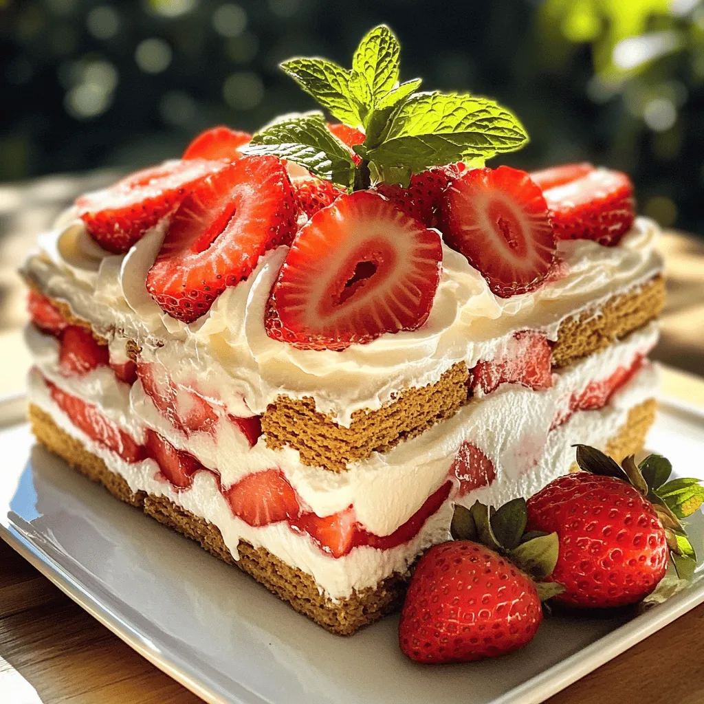 ![- Fresh strawberries - Heavy whipping cream - Cream cheese Fresh ingredients make this cake special. Use ripe strawberries for the best flavor. The heavy whipping cream adds a rich texture. Cream cheese gives a creamy base that holds everything together. - Powdered sugar - Vanilla extract - Graham crackers Pantry ingredients are easy to find. Powdered sugar sweetens the cream and helps it stay thick. Vanilla extract adds a lovely aroma. Graham crackers form the cake's base, giving a nice crunch. - Lemon zest - Fresh mint leaves for garnish Optional ingredients can enhance the cake. Lemon zest adds brightness and a fresh twist. Mint leaves provide a pop of color and a nice flavor when you serve the cake. You can skip these, but they add a nice touch. For the full recipe, check out the details above. To make the whipped cream, start with cold heavy cream. Pour it into a large bowl. Use a hand mixer or stand mixer to beat the cream. Beat it until soft peaks form. This means the cream will hold its shape but still be smooth. Be careful not to overbeat it. Overbeating will turn it into butter! In a separate bowl, add softened cream cheese. Mix in powdered sugar and vanilla extract. Use a spatula or mixer to blend until smooth. The mixture should be creamy and lump-free. You may also add lemon zest here for a fresh taste. This step adds a nice touch to the cream cheese. Grab a rectangular dish for the cake. Start by laying down a layer of graham crackers. Make sure to cover the bottom completely. Next, spread half of the cream mixture over the crackers. Then, layer half of the sliced strawberries on top. Repeat these layers with more graham crackers, the remaining cream, and the rest of the strawberries. Cover the dish with plastic wrap. Refrigerate it for at least four hours or overnight. This helps the flavors mix and the graham crackers soften. Enjoy this easy and creamy delight! For the full recipe, check out the No Bake Strawberry Icebox Cake. To make your icebox cake shine, start with clean layers. Use a flat dish for even stacking. Place a layer of graham crackers at the bottom first. Spread your cream mixture evenly on top. This helps flavors blend well. Next, layer half of your strawberries on the cream. Repeat this process for the second layer. This method ensures every bite is rich in flavor. The right consistency is key for a perfect dessert. When whipping your cream, stop when soft peaks form. This keeps the cream light and airy. Mix the cream cheese until smooth before adding sugar and vanilla. Gently fold the whipped cream into the cream cheese mix. This keeps it fluffy. For extra zing, add lemon zest. It brightens the flavor without overpowering it. Presentation matters for this beautiful cake. Cut it into neat squares for easy serving. You can add fresh mint leaves on top for a pop of color. Consider serving it on a colorful plate to make it stand out. Pair it with a scoop of vanilla ice cream for extra delight. For a fun twist, drizzle some chocolate sauce over the top. These small touches make your dessert memorable. For the full recipe, check the section above. {{image_2}} You can change up the flavors in your icebox cake. Try using different fruits like blueberries, raspberries, or peaches. You can even mix in some chocolate or caramel. Each fruit gives a new taste. It’s fun to get creative. Add a splash of juice or extract for extra flavor. For example, almond or coconut extracts can add a lovely twist. This will keep your dessert fresh and exciting. If you need a gluten-free version, it’s easy to swap out the graham crackers. Use gluten-free cookies or crackers instead. Many options are available at the store. Just make sure to check the labels. You can also use crushed gluten-free oats for a great base. This way, everyone can enjoy the cake without worry. For a dairy-free icebox cake, use non-dairy cream cheese and whipped cream. Almond, coconut, or soy-based options work well. Make sure to choose brands that whip well. You can still achieve that creamy texture. This means all your friends can enjoy a slice too! With these options, everyone can enjoy this easy and creamy delight. If you want to try the classic version, check out the Full Recipe for more details. To keep your no bake strawberry icebox cake fresh, wrap it well. Use plastic wrap or aluminum foil. This helps prevent the cake from drying out. Store it in the fridge. Make sure it is in an airtight container if possible. This keeps the flavors intact. Yes, you can freeze this cake! First, let the cake set in the fridge for at least 4 hours. Then, slice it into squares. Wrap each piece in plastic wrap. Place the wrapped pieces in a freezer-safe bag. This helps save space. When ready to enjoy, thaw in the fridge overnight before serving. In the fridge, your no bake strawberry icebox cake lasts about 3 to 4 days. The graham crackers will soften over time, which is normal. If frozen, it can last for up to 2 months. Just remember, the sooner you eat it, the fresher it will taste. Enjoy every bite! A No Bake Strawberry Icebox Cake is a chilled dessert made with layers of graham crackers, cream, and strawberries. It is light, creamy, and full of sweet fruit flavor. You build it in a dish and let it chill in the fridge. The graham crackers soften and blend with the creamy mix. The dessert is easy to make and does not require any baking, making it perfect for hot days. To get the best results, chill the cake for at least 4 hours. If you can, let it set overnight. This time helps the flavors mix and the texture become creamy. You want the graham crackers to soften well, so they melt in your mouth. Yes, you can use frozen strawberries. They can save time and are often cheaper. However, they may not taste as fresh. Frozen strawberries release more juice when thawed, which can make the cake a bit watery. If you use them, be sure to drain any excess juice. Fresh strawberries give a brighter flavor and firmer texture, 
