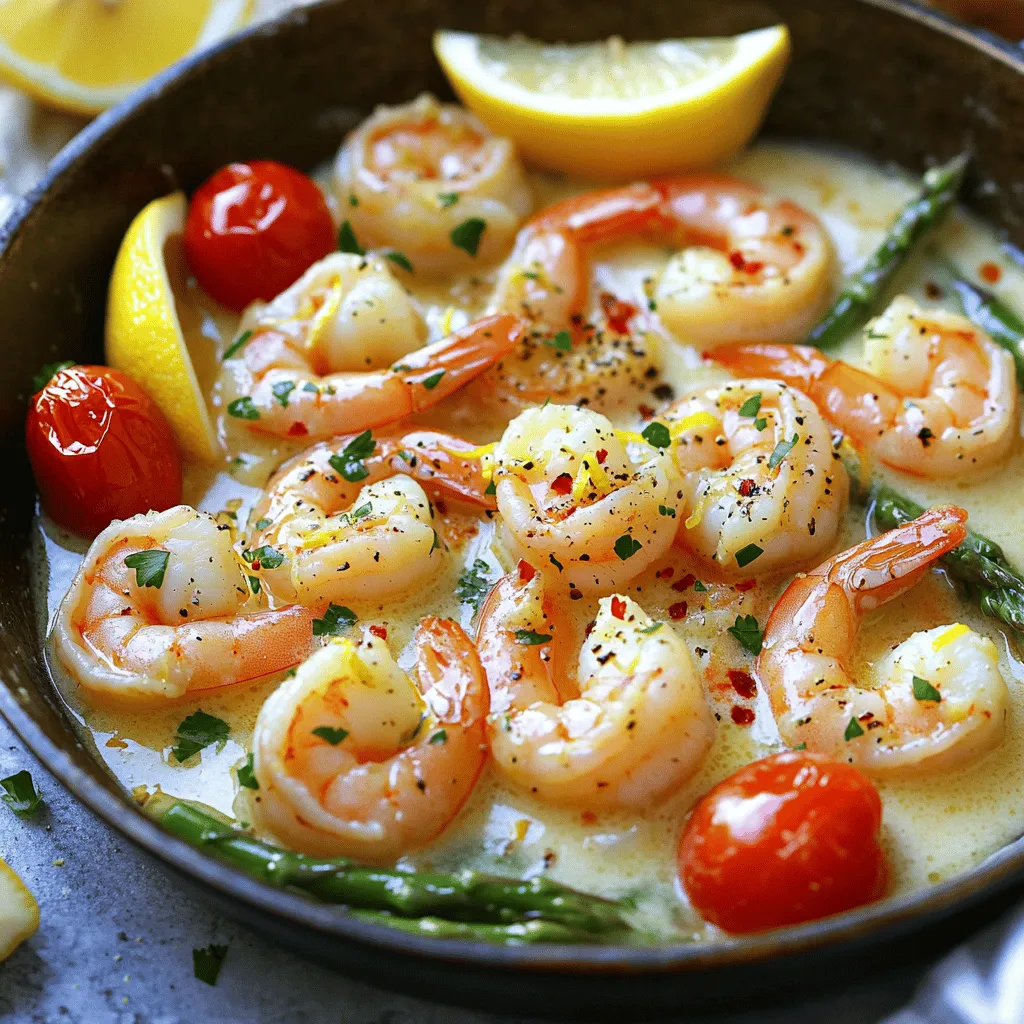 Once the shrimp are ready, it’s time to add flavor. Squeeze in the juice of 1 lemon and pour in 1/4 cup of chicken broth. This adds moisture and depth. If you like, toss in some cherry tomatoes and asparagus. Cook everything for an extra 3-4 minutes. You want the veggies tender and warmed through.