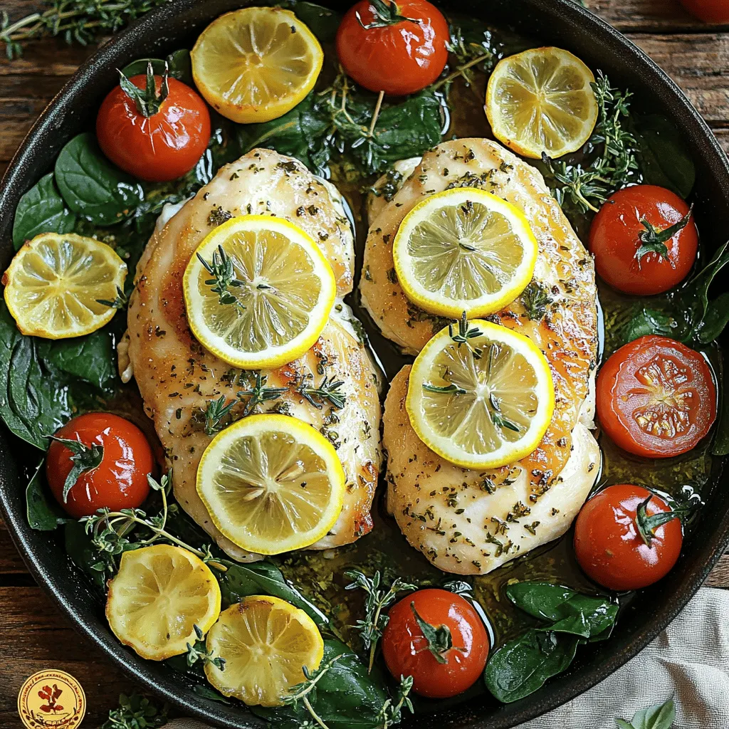 Now, it’s time to add the lemon slices, tomatoes, and fresh spinach around the chicken. These not only add flavor but also color. Then, transfer the skillet to the oven. Bake it for 15-20 minutes. You want the chicken to reach 165°F (75°C). This ensures it is safe to eat and juicy.