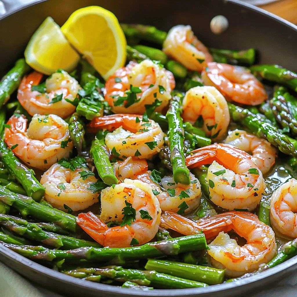 - Shrimp requirements and preparation You will need 1 pound of large shrimp. Make sure they are peeled and deveined. This step saves time and makes cooking easier. Fresh shrimp works best, but you can also use frozen. If using frozen shrimp, thaw them before cooking. - Asparagus specifics Grab 1 bunch of asparagus. Trim the ends to remove any tough parts. Cut the asparagus into 2-inch pieces. This size helps them cook evenly and pair well with the shrimp. - Key spices and seasonings For flavor, you need: - 4 cloves of garlic, minced - 2 tablespoons of olive oil - 1 tablespoon of lemon juice - 1 teaspoon of paprika - Salt and pepper to taste - Fresh parsley, chopped for garnish - Lemon wedges for serving Using these spices will elevate your dish. Garlic adds a nice aroma, while paprika gives warmth. Lemon juice brightens the flavors and makes everything pop. You can find the full recipe [here](#) for more details on cooking. Start by heating the olive oil in your skillet over medium heat. I like to use a good amount of oil to help the garlic cook evenly. When the oil is hot, add the minced garlic. Sauté it for about 30 seconds. You want the garlic to be fragrant, but be careful not to burn it. Burnt garlic tastes bitter and can ruin your dish. Once the garlic is ready, raise the heat to medium-high and add the shrimp. The shrimp cook fast, so watch them closely. Season them with paprika, salt, and pepper as they cook. I usually cook them for about 2-3 minutes on each side. They should turn pink and opaque when done. Overcooking makes them tough, so timing is key here. After removing the shrimp, it’s time for the asparagus. Add the pieces directly into the skillet. Sauté them for about 4-5 minutes. You want them tender but still crisp. This adds a nice bite to the dish. After that, return the cooked shrimp to the skillet. Add in the lemon juice and toss everything together. Cook for another 1-2 minutes. This helps meld the flavors together nicely. For the full recipe, check out the details above! To make your one-pan garlic shrimp and asparagus shine, use spices and herbs. I love adding a pinch of red pepper flakes for heat. Fresh thyme or oregano can also boost flavor. For a bright touch, zest some lemon before juicing it. This zest adds a fresh, citrusy note that makes the dish pop. While I recommend skillet cooking for its speed, you can try other methods. You could use a grill for a smoky taste. If you prefer oven cooking, place the shrimp and asparagus on a baking sheet. Roast them at 400°F for about 10 minutes. Adjust the heat based on your cooking method. Lower heat for a longer cook time helps flavors meld well. Presentation can elevate your meal. Serve directly from the skillet for a homey feel. If you want to impress, plate the shrimp and asparagus on a large platter. Garnish with lemon wedges and fresh parsley. For sides, consider a light salad or fluffy rice. A crisp white wine pairs nicely with this dish. For a hearty option, serve with crusty bread to soak up the juices. You can find the full recipe [here]. {{image_2}} You can change the shrimp in this recipe. Scallops are a great option. They cook fast and taste sweet. Other shellfish, like crab or lobster, work well too. For a vegetarian dish, you can use tofu or chickpeas. Both options add protein and texture. Want to spice things up? Add red pepper flakes to the pan. A pinch gives a nice kick. You can also mix in different veggies. Try bell peppers, broccoli, or snap peas. Each vegetable adds its unique taste and color. If you need gluten-free options, this dish already fits. Just ensure your spices are gluten-free. For dairy-free needs, skip cheese or cream. Low-carb fans can enjoy this too. Reduce the asparagus or swap it for zucchini. These changes keep the meal light and healthy. For the full recipe, check out the detailed instructions to get started! To store your One-Pan Garlic Shrimp and Asparagus, use a good container. I recommend airtight glass or plastic containers. These help keep your meal fresh and tasty. Make sure to cool the dish first. Put it in the fridge within two hours of cooking. This keeps the shrimp safe and prevents bacteria growth. For reheating, I like to use a skillet. It helps keep the shrimp tender and the asparagus crisp. Heat the skillet on medium-low. Add a splash of water or olive oil to prevent sticking. Stir often to avoid overcooking the shrimp. You want them warm but not rubbery. This method keeps your meal just as good as when you first made it. If you want to freeze this dish, make sure it is cool first. Place it in a freezer-safe container. Leave some space at the top to allow for expansion. You can freeze it for up to three months. When ready to eat, thaw it in the fridge overnight for best results. This helps maintain the flavor and freshness. You can also reheat it straight from the freezer. Just add extra cooking time. Cooking this dish takes about 15 minutes in total. Here’s the breakdown: - Prep Time: 10 minutes - Cook Time: 5 minutes You’ll have a tasty meal ready in no time! Yes, you can use frozen shrimp! Here are my tips: - Thaw First: Always thaw shrimp in the fridge overnight. - Quick Thaw Option: For a fast method, place shrimp in cold water for 15-20 minutes. - Cooking Time: If frozen, add a minute to the cooking time until they turn pink. This way, you keep all the flavor! You can pair this dish with many sides. Here are my favorites: - Rice: White or brown rice soaks up the juices well. - Quinoa: A healthy grain with a nutty flavor. - Salad: A light green salad adds freshness. - Bread: Garlic bread is great for dipping. These options balance the meal nicely! Yes, you can prep this dish ahead. Here’s how: - Prep Ingredients: Chop asparagus and mince garlic in advance. - Cook Shrimp: You can cook shrimp a few hours before serving. - Store in Fridge: Keep everything in airtight containers until you’re ready. Just reheat and mix before serving! If asparagus 
