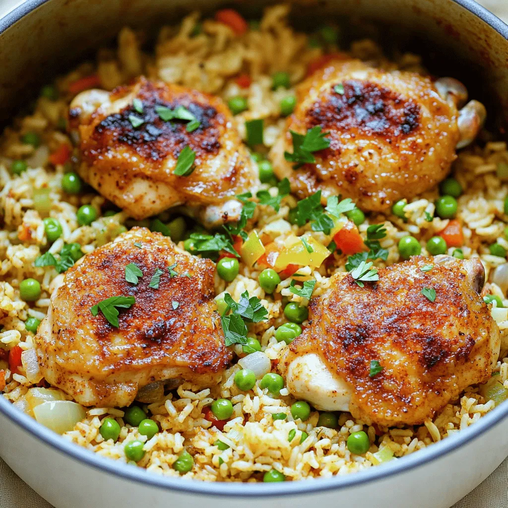 To make this dish, you need simple yet tasty ingredients. Here’s what to gather: - 4 boneless, skinless chicken thighs - 1 cup long-grain rice - 3 cups chicken broth - 1 medium onion, chopped - 2 cloves garlic, minced - 1 bell pepper (any color), diced - 1 cup diced celery - 1 cup frozen peas These ingredients come together to build layers of flavor. The chicken thighs add rich protein. The rice soaks up all the tasty broth and spices. The veggies provide crunch and color. The right seasonings make all the difference. You will need: - 2 tablespoons Cajun seasoning - 1 teaspoon smoked paprika - Salt and pepper to taste Cajun seasoning gives this dish its warmth and zest. Smoked paprika adds a nice, subtle smokiness. Adjust salt and pepper to suit your taste. Garnishing is a fun way to finish the dish. You can use: - Fresh parsley, chopped Sprinkling parsley on top adds a fresh touch. It also makes the dish look bright and inviting. Once you have all these ingredients, you are ready to create a delicious meal. Check out the Full Recipe for detailed steps to bring it all together! Start with the chicken thighs. First, season them with salt, pepper, and Cajun seasoning. Heat olive oil in a large pot over medium heat. When the oil is hot, add the chicken. Sear each side for about three to four minutes. You want a nice golden brown color. Once browned, take the chicken out and set it aside. This step adds great flavor to your dish. Now it’s time for the veggies. In the same pot, add chopped onion, minced garlic, diced bell pepper, and diced celery. Cook them for about five to seven minutes. Stir often until they soften. This mix forms the base of the dirty rice. After the veggies soften, stir in the remaining Cajun seasoning and smoked paprika. These spices will make your dish pop with flavor. Next, add the long-grain rice to the pot. Toast it for one to two minutes while stirring. This helps enhance the rice's flavor. After that, pour in the chicken broth and return the seared chicken thighs to the pot. Bring everything to a boil. Once boiling, reduce the heat to low, cover, and let it simmer for 20 minutes. This is key for the rice to cook perfectly. In the last five minutes, mix in the frozen peas. When done, fluff the rice with a fork. Season with more salt and pepper if needed. For a nice touch, garnish with fresh parsley. You can find the full recipe in the article for more details. To get juicy chicken thighs, start with good quality meat. I recommend boneless, skinless thighs for this dish. Season well with salt, pepper, and Cajun seasoning. Sear them until golden brown on both sides. This step adds flavor and locks in moisture. After searing, set the chicken aside. Letting it rest helps keep it tender. For perfect rice, use long-grain rice. Toast it in the pot for a minute. This brings out the nutty flavor. Once you add chicken broth, the rice absorbs all the flavors. Keep the lid on while it simmers. This traps steam and helps the rice cook evenly. Fluff the rice with a fork before serving. It should be light and fluffy, not sticky. For a great presentation, serve this dish right from the pot. It looks rustic and inviting. Garnish with fresh parsley for a pop of color. You can also add a lemon wedge for a bright finish. Pair it with a simple green salad or crusty bread. This completes your meal and makes it even more enjoyable. {{image_2}} You can switch the chicken for other meats. Try diced pork or turkey. Shrimp also works well and cooks quickly. Simply add shrimp in the last few minutes of cooking. This keeps them tender and juicy. Each protein brings its own flavor. Adjust cooking times as needed for best results. To make this dish vegetarian, skip the meat. Use mushrooms for a hearty bite. Add a mix of bell peppers and zucchini for color. Replace chicken broth with vegetable broth for a rich taste. You can also toss in lentils for protein. This keeps the dish filling and nutritious. Enhancing flavors is easy. Add a splash of hot sauce for heat. Fresh herbs like thyme or bay leaves boost the taste. You can also mix in olives or capers for a salty touch. Experiment with different spices, like cumin or coriander, to find your favorite blend. Don't forget to adjust salt and pepper as needed. For detailed cooking steps, check out the Full Recipe! Storing leftovers is simple. Let your One Pot Chicken and Dirty Rice cool down first. Then, place it in an airtight container. It will last in the fridge for about 3 to 4 days. Make sure to label the container with the date, so you know when to eat it. When you’re ready to eat your leftovers, reheating is easy. You can use the microwave or the stovetop. If using the microwave, heat for 1 to 2 minutes. Stir it halfway to warm it evenly. For the stovetop, place it in a pan with a splash of water. Heat over medium until warm. Freezing is a great option for longer storage. Use a freezer-safe container or bag. Make sure to remove as much air as possible. Your dish can last up to 3 months in the freezer. To thaw, place it in the fridge overnight. Then reheat as mentioned above. Enjoy your meal again! One Pot Chicken and Dirty Rice can last in the fridge for about 3 to 4 days. Make sure to store it in an airtight container. This helps keep it fresh. When you reheat it, check the temperature. It should be hot all the way through. Yes, you can use brown rice! However, it will take longer to cook. Brown rice usually needs about 45 minutes. You may also need to add more chicken broth. Keep an eye on the liquid level while it cooks. If you don’t have Cajun seasoning, try a mix of spices. You can use paprika, garlic powder, and onion powder. A bit of cayenne pepper adds heat. Adjust the amounts to fit your taste. You can also use taco seasoning as an alternative. For the complete recipe, check out the [Full Recipe]. This blog post covered how to make One Pot Chicken and Dirty Rice. We looked at the ingredients, cooking steps, tips, and even vari
