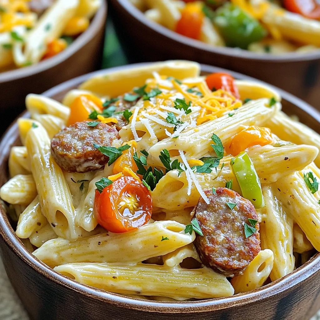 To make One-Pot Creamy Cajun Sausage Pasta, you will need: - 12 oz penne pasta - 1 lb smoked sausage, sliced - 1 tablespoon olive oil - 1 small onion, diced - 2 cloves garlic, minced - 1 bell pepper (red or green), diced - 1 cup cherry tomatoes, halved - 2 cups chicken broth - 1 cup heavy cream - 1 tablespoon Cajun seasoning - 1 cup shredded cheddar cheese - Salt and pepper to taste - Chopped fresh parsley for garnish If you need alternatives for some ingredients, here are a few options: - Penne pasta: You can use rotini or fusilli if you prefer. - Smoked sausage: Try turkey sausage or chicken sausage for a lighter version. - Heavy cream: Substitute with half-and-half or coconut milk for a dairy-free option. - Cajun seasoning: Make your own with paprika, cayenne, garlic powder, and oregano. - Cheddar cheese: Use mozzarella or pepper jack for different flavors. To prepare this dish, gather these essential tools: - Large pot or Dutch oven - Cutting board and sharp knife - Wooden spoon or spatula - Measuring cups and spoons - Ladle for serving These tools will help you create this delicious meal with ease. Enjoy the process of making this creamy delight! Start by heating the olive oil in a large pot over medium heat. Add the sliced smoked sausage. Cook for about 5 minutes, stirring often. You want it browned and tasty. Once done, remove the sausage and set it aside. This step adds depth to your dish. In the same pot, toss in the diced onion and bell pepper. Sauté for 3 to 4 minutes. You’re looking for them to soften up a bit. Then, mix in the minced garlic. Cook for another minute. You should smell a wonderful aroma! Now, add the penne pasta to the pot. Pour in the chicken broth, add the Cajun seasoning, and mix in the halved cherry tomatoes. Stir well to combine everything. Bring it to a boil, then lower the heat to medium-low. Cover the pot and cook according to the pasta package, usually about 12 to 14 minutes. Stir occasionally so it doesn’t stick. Once the pasta is cooked and most of the broth is absorbed, stir in the heavy cream and shredded cheddar cheese. Mix until the cheese melts and the sauce looks creamy. If it's too thick, add a splash of chicken broth to thin it out a bit. This is where the magic happens! Return the browned sausage to the pot. Stir until everything is heated through. Taste and season with salt and pepper as needed. For a nice touch, serve in bowls and top with freshly chopped parsley. You can even sprinkle more cheese on top for extra flavor! To make your dish pop, use fresh herbs. Chopped parsley adds brightness. You can also try fresh basil or thyme. They bring extra depth. Don't forget to taste as you cook. Adjust salt and pepper to suit your taste. A splash of lemon juice can brighten the dish too! For the best creaminess, use full-fat heavy cream. It blends well with the cheese. If you want more creaminess, add a bit of cream cheese. Stir it in when you add the heavy cream. This will give you an even richer sauce. Always mix well to combine everything smoothly. One common mistake is overcooking the pasta. Follow the package time, but check it a minute early. You want it al dente, not mushy. Another error is adding cheese too soon. Wait until the pasta absorbs most of the broth. This helps achieve a creamy texture without clumps. Lastly, don’t skip the seasoning. It’s key to a tasty dish! {{image_2}} To make a vegetarian version of this dish, swap the sausage for plant-based sausage. You can also add more veggies like mushrooms, zucchini, or spinach. Use vegetable broth instead of chicken broth. This keeps the creamy texture while adding great flavor. If you like heat, add some diced jalapeños or red pepper flakes. You can use a spicier Cajun seasoning as well. This twist gives the dish an exciting kick. Adjust the heat to suit your taste. While penne works well, feel free to try other pasta shapes. Fusilli or farfalle are great options. Each shape holds the sauce differently, which can change your dish's texture. Experiment to find your favorite. After enjoying your One-Pot Creamy Cajun Sausage Pasta, let it cool. Transfer leftovers to an airtight container. Store in the fridge for up to three days. This helps keep the flavors fresh and tasty. To reheat, place the pasta in a pot over medium heat. Add a splash of chicken broth to help it warm up. Stir regularly to prevent sticking. You can also use a microwave. Heat in short bursts, stirring in between. If you want to freeze your pasta, let it cool completely. Place it in a freezer-safe container. It will last up to three months in the freezer. When ready to eat, thaw in the fridge overnight. Reheat as mentioned above for best results. Yes, you can use different sausages. Chicken sausage, turkey sausage, or even vegetarian sausage work well. Each type adds its own flavor. Just make sure to adjust cooking times if needed. Yes, you can make this dish gluten-free. Use gluten-free penne pasta. It cooks similarly to regular pasta. Check the package for cooking times. The rest of the ingredients are naturally gluten-free. To add heat, increase the Cajun seasoning. You can also add red pepper flakes. Another option is to include diced jalapeños or a splash of hot sauce. Adjust the spice to your taste. Feel free to add any veggies you like! Spinach, zucchini, or mushrooms fit well. Just sauté them with the onions and peppers. This boosts flavor and adds nutrition. Yes, half-and-half can replace heavy cream. Your sauce will be less rich but still creamy. If you want more thickness, add a little extra cheese. This keeps the dish flavorful and satisfying. This blog covered key ingredients for easy cooking. I shared ingredient swaps and tools you need. We went through step-by-step ways to cook each dish, making it creamy and tasty. I also added tips to boost flavor and avoid mistakes. You can explore fun variations, storage methods, and answers to common questions. Cooking can be simple and fun. I hope you