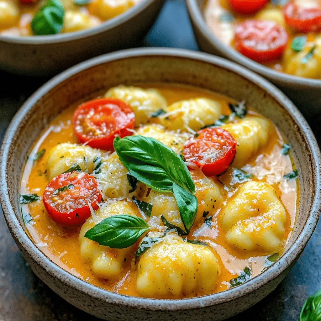 - 1 pound gnocchi (fresh or shelf-stable) - 2 cups cherry tomatoes, halved - 1 cup vegetable broth - 1 cup heavy cream - 1 cup fresh basil leaves, chopped (reserve some for garnish) - 1/2 cup grated Parmesan cheese - 2 cloves garlic, minced - 1 tablespoon olive oil - Salt and pepper to taste - Crushed red pepper flakes The heart of my One-Pot Creamy Tomato Basil Gnocchi lies in its fresh ingredients. Gnocchi forms the base of this dish. You can choose fresh or shelf-stable gnocchi based on what you have. Fresh gnocchi cooks quicker, while shelf-stable can be stored longer. Cherry tomatoes add a sweet burst of flavor. Halving them helps release their juices, creating a rich sauce. Vegetable broth brings in depth and moisture. Heavy cream is the magic ingredient. It gives the dish its creamy texture and richness. Next, fresh basil leaves infuse a bright taste. I always chop some but save a bit for later. Grated Parmesan cheese adds a salty, nutty kick. Garlic enhances the overall flavor with its aromatic notes. Olive oil is essential for sautéing and adds a nice finish. Don’t forget the salt and pepper! They help balance all the flavors. If you like a bit of heat, crushed red pepper flakes are a great option. They elevate the dish without overpowering it. Gather these ingredients, and you’re on your way to a creamy delight! - Heating olive oil and cooking garlic Start by heating 1 tablespoon of olive oil in a large pot over medium heat. Add 2 minced cloves of garlic. Stir and cook for about 1 minute. The garlic should smell nice but not burn. - Adding cherry tomatoes Next, add 2 cups of halved cherry tomatoes to the pot. Stir them around. Cook for 3 to 5 minutes. The tomatoes will soften and release their juices, making a tasty base. - Pouring in vegetable broth Pour in 1 cup of vegetable broth. Bring the mix to a simmer. Let it cook for 2 to 3 minutes. This adds flavor and moisture to your dish. - Stirring in gnocchi and cooking Now, add 1 pound of gnocchi to the pot. Reduce the heat to medium-low. Stir the gnocchi into the tomato mix. Cook for about 5 minutes. The gnocchi will float to the top when done. - Adding heavy cream and Parmesan cheese Once the gnocchi is cooked, reduce the heat to low. Stir in 1 cup of heavy cream and 1/2 cup of grated Parmesan cheese. Mix until the cheese melts and the sauce is smooth. - Incorporating fresh basil and seasoning Fold in 1 cup of chopped fresh basil, saving some for garnish. Season with salt, pepper, and optional crushed red pepper flakes. Stir well to combine. Let it sit for a couple of minutes to thicken. To boost the taste of your One-Pot Creamy Tomato Basil Gnocchi, consider adding crushed red pepper flakes. This small touch gives the dish a pleasant kick. If you want more flavor, try adding fresh herbs like oregano or thyme. They pair well with the basil and tomatoes. To get that perfect creamy sauce, make sure to stir in the heavy cream slowly. This helps it blend well with the other ingredients. If you like a thicker sauce, let it cook a bit longer. You can also add more cheese for creaminess if desired. Use a large pot or deep skillet for the best results. A non-stick surface helps prevent sticking and burning, making cleanup easier. A wooden spoon is great for stirring the ingredients without scratching your cookware. {{image_2}} You can swap ingredients to make this dish your own. - Using different types of pasta: If you don’t have gnocchi, try small pasta shapes like penne or fusilli. They soak up the sauce well. - Substituting cream with lighter options: For a lighter dish, use half-and-half or even coconut milk. This keeps the creamy texture but reduces calories. Get creative with what you add to the dish. - Incorporating protein like chicken or shrimp: Adding cooked chicken or shrimp gives the dish more protein. Cook it separately, then mix it in. - Adding vegetables for a healthier twist: Toss in veggies like spinach or zucchini. They add nutrition and color, making your meal even better. Think about what to serve with your gnocchi for a full meal. - Pairing with sides or salads: A fresh green salad pairs well with the creamy sauce. You can also serve crusty bread to soak up the sauce. - Suggestions for side dishes that complement gnocchi: Roasted vegetables or garlic bread are great sides. They add flavor and texture to your meal. To keep your creamy tomato basil gnocchi fresh, use airtight containers. Glass or plastic containers work well. Store the dish in the fridge. It stays good for up to three days. Make sure to cool it first before sealing. When it's time to enjoy leftovers, heat gently on the stove. This keeps the sauce smooth and creamy. Add a splash of cream or broth to help. Stir often to avoid burning. If the sauce separates, whisk it back together. You can freeze creamy tomato basil gnocchi for later. Let it cool completely before freezing. Use freezer-safe bags or containers. Press out as much air as you can. It can last for up to three months. To thaw, place it in the fridge overnight. Reheat it on low heat, stirring gently. Add a bit of cream or broth to help it return to its creamy state. Enjoy your meal even after storing! Yes, you can make this dish vegan with a few swaps. Use plant-based gnocchi made from potatoes or other veggies. Replace heavy cream with coconut milk or cashew cream. For cheese, try nutritional yeast or a vegan Parmesan. These swaps keep the creamy texture while making it plant-based. If you lack gnocchi, don't worry! You can use other pasta types. Try small shapes like penne, fusilli, or farfalle. Cook them in the same sauce until tender. For a gluten-free option, look for gluten-free pasta. This will still create a tasty one-pot dish. Watch for gnocchi to float to the top of the pot. This shows they're cooked through. You can also taste one to check for doneness. It should be soft but firm. Avoid overcooking to keep the perfect texture. This blog post covered how to make a delicious 