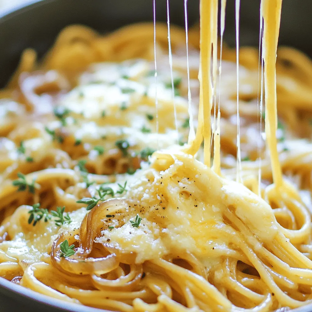 - 12 oz spaghetti or linguine - 2 tablespoons olive oil - 2 medium yellow onions, thinly sliced - 2 cloves garlic, minced - 4 cups vegetable broth - 1 cup heavy cream - 1 teaspoon dried thyme - 1 tablespoon balsamic vinegar - Salt and pepper to taste - 1 cup Gruyère cheese, grated (plus extra for topping) - ½ cup Parmesan cheese, grated - Fresh parsley, chopped (for garnish) For this dish, I love the balance of flavors. The sweet onions mix well with the creamy sauce. The spaghetti or linguine holds the sauce perfectly. Olive oil gives a nice base for cooking the onions. The onions need to be sliced thin. This helps them cook evenly and caramelize well. Garlic adds a punch of flavor when you mix it in. Vegetable broth makes it rich without being heavy. Using heavy cream gives a smooth texture. Dried thyme adds a hint of earthiness. Balsamic vinegar brings a touch of sweetness. Salt and pepper help bring all the flavors together. Gruyère cheese gives that classic French onion taste. Parmesan cheese adds depth to the sauce. Fresh parsley is a must for color and a fresh bite. This recipe is easy to follow, and you can find the Full Recipe linked above! First, we need to caramelize the onions. Heat 2 tablespoons of olive oil in a large pot over medium heat. Add 2 medium yellow onions, thinly sliced, and a pinch of salt. Stir occasionally for about 15-20 minutes. You want them to turn deep golden brown. This process brings out their sweet flavor. Next, add 2 cloves of minced garlic. Cook for another 1-2 minutes. You will smell a lovely aroma! Garlic adds depth to your dish. Now, pour in 4 cups of vegetable broth and 1 tablespoon of balsamic vinegar. Use a wooden spoon to scrape the bottom of the pot. This helps lift any tasty bits stuck there. Bring the mixture to a simmer. Once it’s simmering, add 12 oz of spaghetti or linguine. Stir it well to make sure all the pasta is submerged. Cover the pot and reduce the heat to medium-low. Cook according to the pasta package instructions, usually about 9-11 minutes. Stir occasionally to keep it from sticking. You want the pasta to be al dente, which means firm to the bite. When the pasta is done, stir in 1 cup of heavy cream, 1 teaspoon of dried thyme, and salt and pepper to taste. Cook for another 1-2 minutes to heat everything through. Remove the pot from heat. Now, add 1 cup of grated Gruyère cheese and ½ cup of grated Parmesan cheese. Stir until the cheeses melt into the creamy sauce. Taste your dish. Adjust the seasoning with more salt and pepper if needed. Serve the pasta hot. Garnish with extra Gruyère cheese and chopped parsley for a fresh touch. For the full recipe, check out the complete details. Enjoy your One Pot French Onion Pasta! Using homemade broth can make a big difference. It adds depth and richness to your dish. Store-bought broth is fine, but it often lacks flavor. If you have time, make your own broth. It is easier than you think. Just simmer veggies, herbs, and water for a few hours. The quality of cheese matters too. Gruyère cheese shines in this recipe. Its nutty flavor blends well with the onions. Always choose a good quality cheese. Freshly grated cheese melts better and tastes richer. Stirring is key for even cooking. Stir the pasta every few minutes while it cooks. This prevents sticking and helps it cook evenly. If the pasta gets too thick, you can adjust the consistency. Add more broth for a soupier dish or cream for a richer sauce. For a complete meal, pair this pasta with a simple salad. A green salad with vinaigrette adds freshness. Garlic bread makes a great side too. It soaks up the creamy sauce well. Top your dish with fresh parsley for a pop of color. You can also sprinkle more cheese on top. This adds that extra layer of flavor. If you want to impress, serve with a glass of white wine. {{image_2}} If you want to make this dish fit your diet, there are simple swaps. For gluten-free pasta, you can use brown rice or chickpea pasta. These options hold up well and taste great. If you want a dairy-free version, try using cashew cream or coconut milk. Both give a creamy texture without dairy. You can change the dish by adding protein. Chicken, sausage, or even beans work well. Cook the protein with the onions, and it adds more flavor. You can also play with herbs and spices. Try adding rosemary or smoked paprika for a twist. These small changes keep the dish fresh and exciting. You can find the full recipe below for more details on how to make this comforting dish. To store your One Pot French Onion Pasta, let it cool first. Place it in an airtight container. This keeps it fresh and keeps odors away. You can store it in the fridge for up to three days. You can also freeze this pasta dish! To do this, make sure it cools completely. Then, place it in a freezer-safe container. It will last in the freezer for up to three months. When you want to enjoy it again, thaw it in the fridge overnight. Reheat it on the stove over low heat. Add a splash of broth or cream to keep it creamy. Stir often to make sure it warms evenly. This way, you will enjoy every delicious bite! How can I make One Pot French Onion Pasta vegetarian? You can easily make this dish vegetarian by using vegetable broth instead of chicken broth. All other ingredients in the recipe are already vegetarian-friendly. Can I use other types of pasta for this recipe? Yes, you can use other types of pasta. I like spaghetti or linguine, but penne or fusilli works well too. Just make sure to adjust the cooking time as needed. What can I serve with One Pot French Onion Pasta? This pasta dish pairs well with a simple green salad or some crusty bread. A side of roasted vegetables also complements the flavors nicely. What can I substitute for Gruyère cheese? If you can’t find Gruyère cheese, you can use Swiss cheese or a mix of mozzarella and Parmesan. These substitutes melt well and add a creamy texture. Can I add vegetables to this dish? Absolutely! You can a
